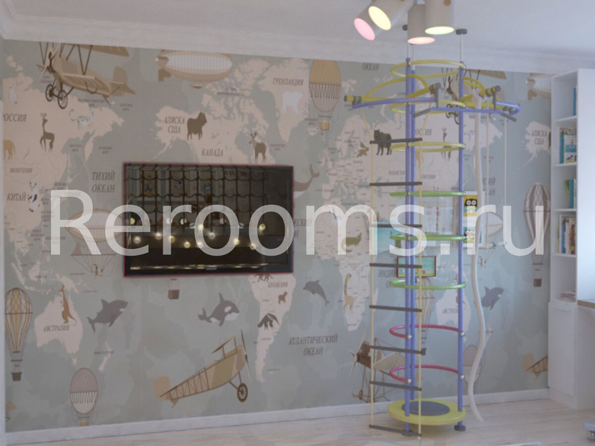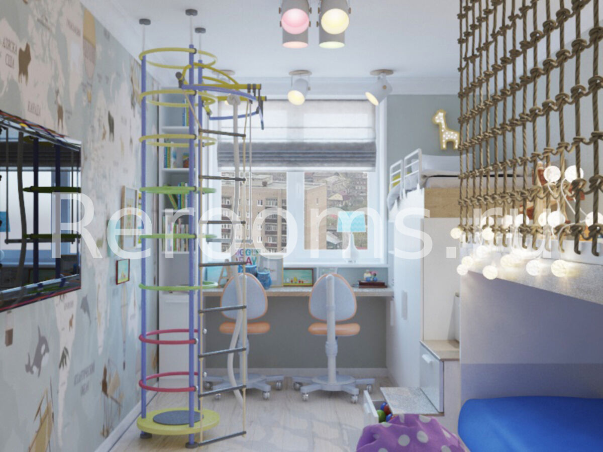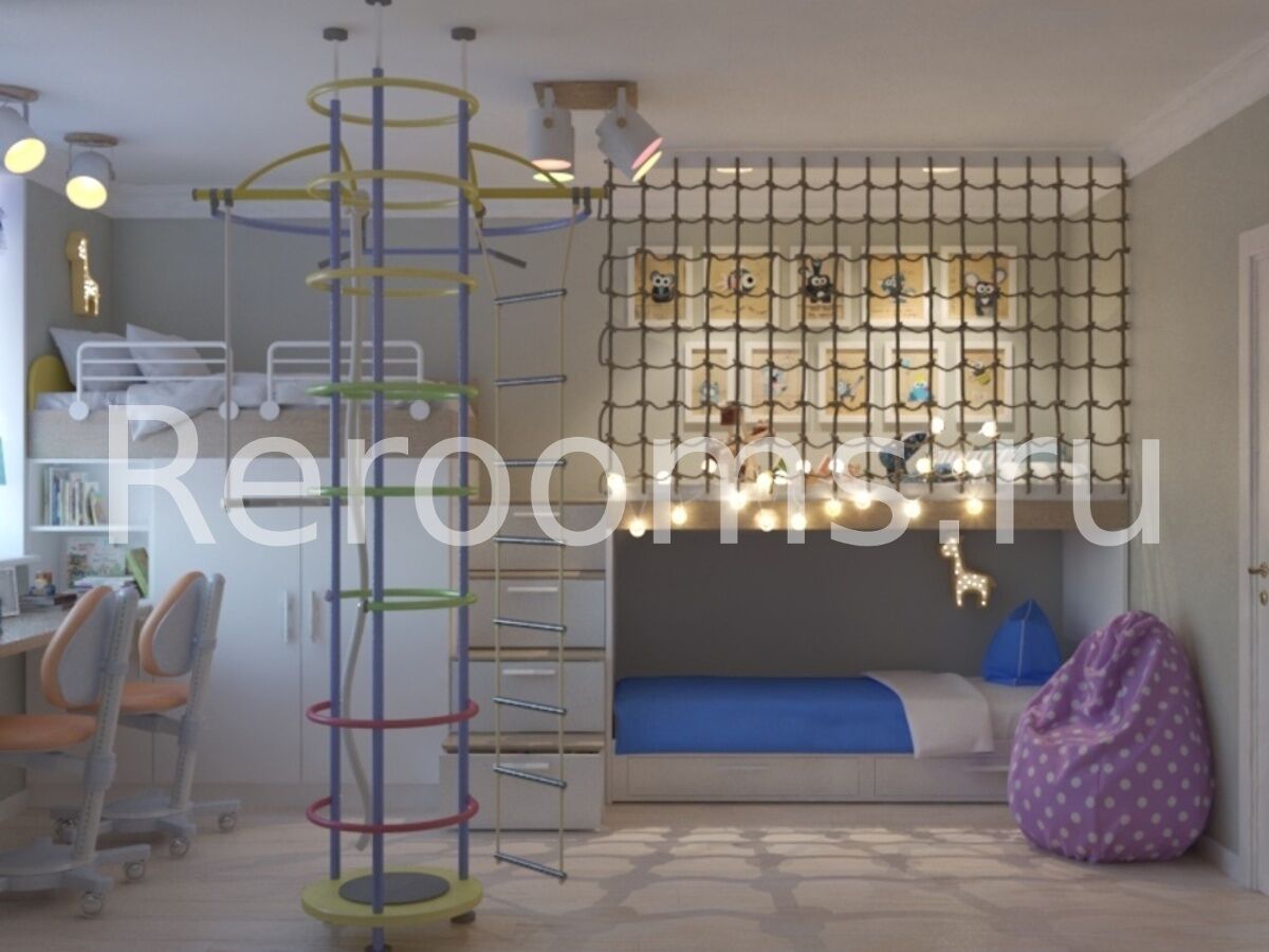 Эта детская комната для мальчиков - яркий пример современного подхода к организации пространства. Интерьер обустроен максимально комфортно и красиво. Вдоль одной из стен разместили двухуровневые спальные места с удобной лесенкой и вместительный шкаф. Рядом расположили игровой спортивный уголок. Пространство у окна тоже задействовали, установив там два рабочих места. Особое внимание в комнате привлекает яркая стена с изображением карты мира.