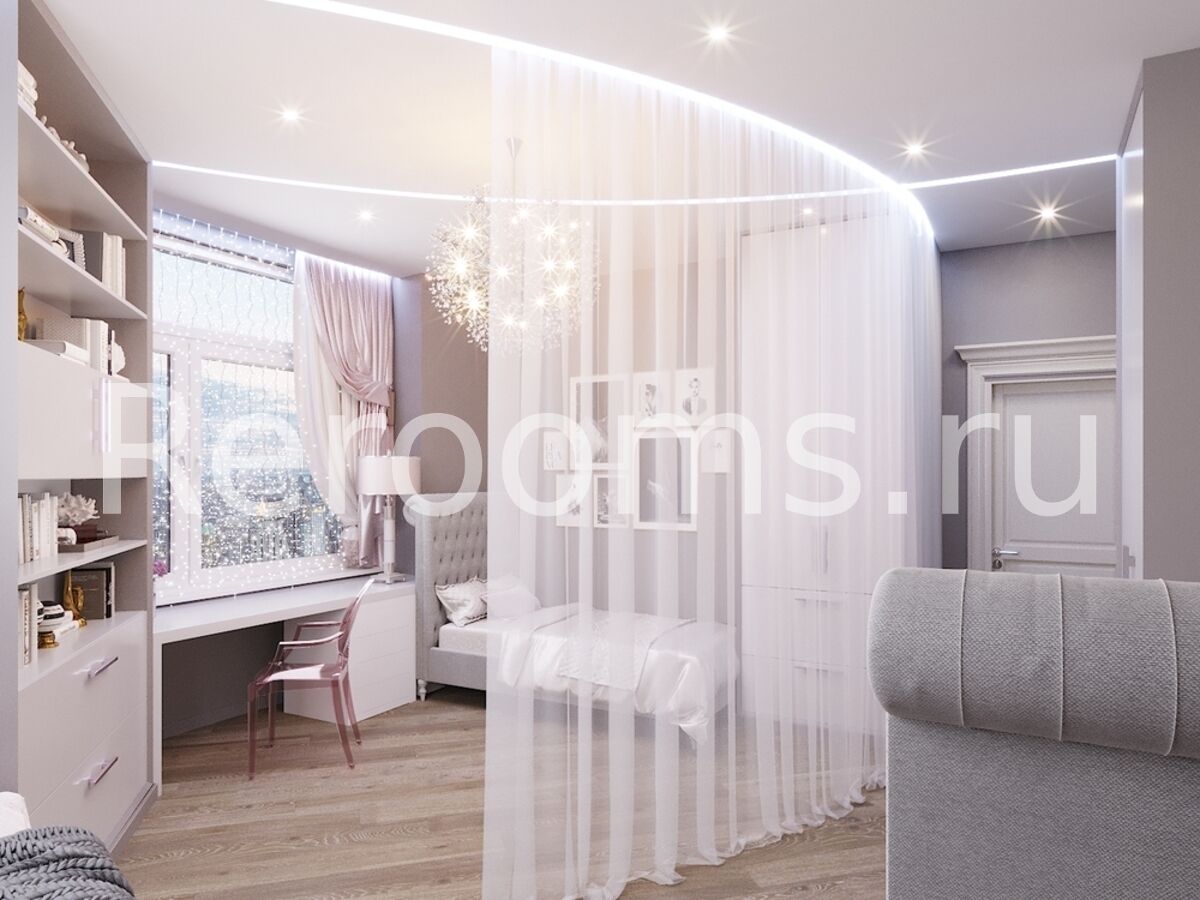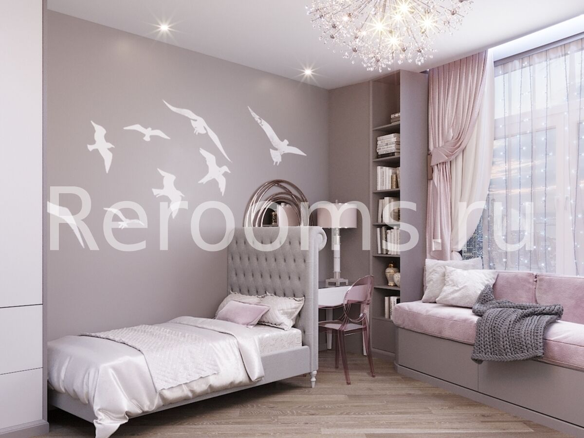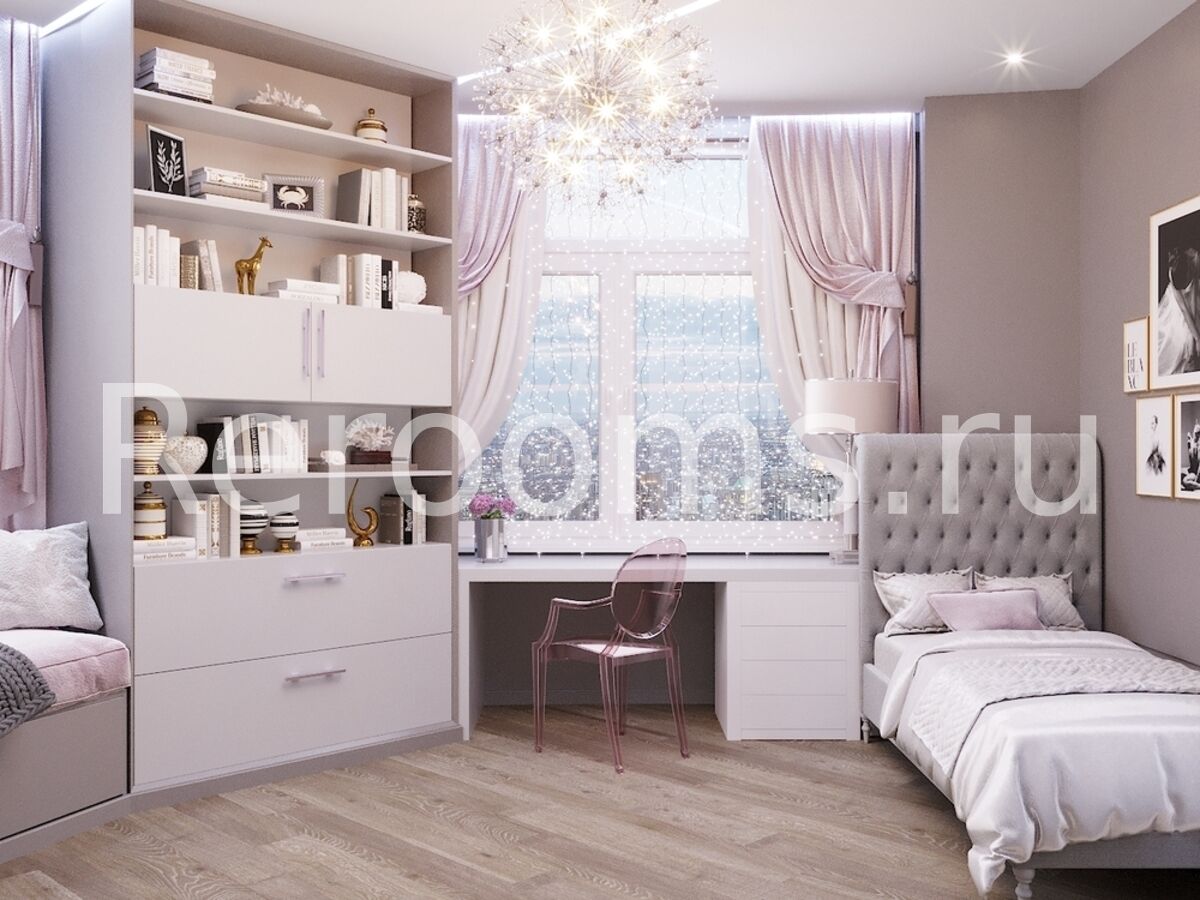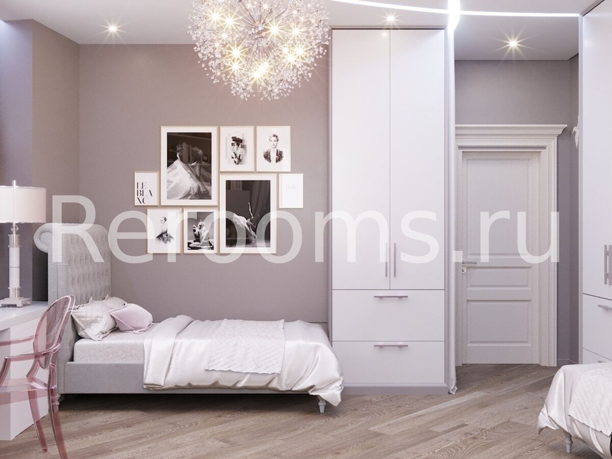 Проект детской комнаты для девочек выполнен в стиле Американская классика. Несмотря на сложную конфигурацию помещения, дизайнеру удалось обустроить очень удобное и красивое пространство. Изящные кровати с высоким мягким изголовьем и удобный диван дополнены изысканным текстилем. Особое место отведено освещению. Помимо основной люстры комната оснащена локальной подсветкой. Не забыли и о зонировании. Так как помещение рассчитано на двух человек, при желании одну часть комнаты можно отделить от другой при помощи легкого занавеса.