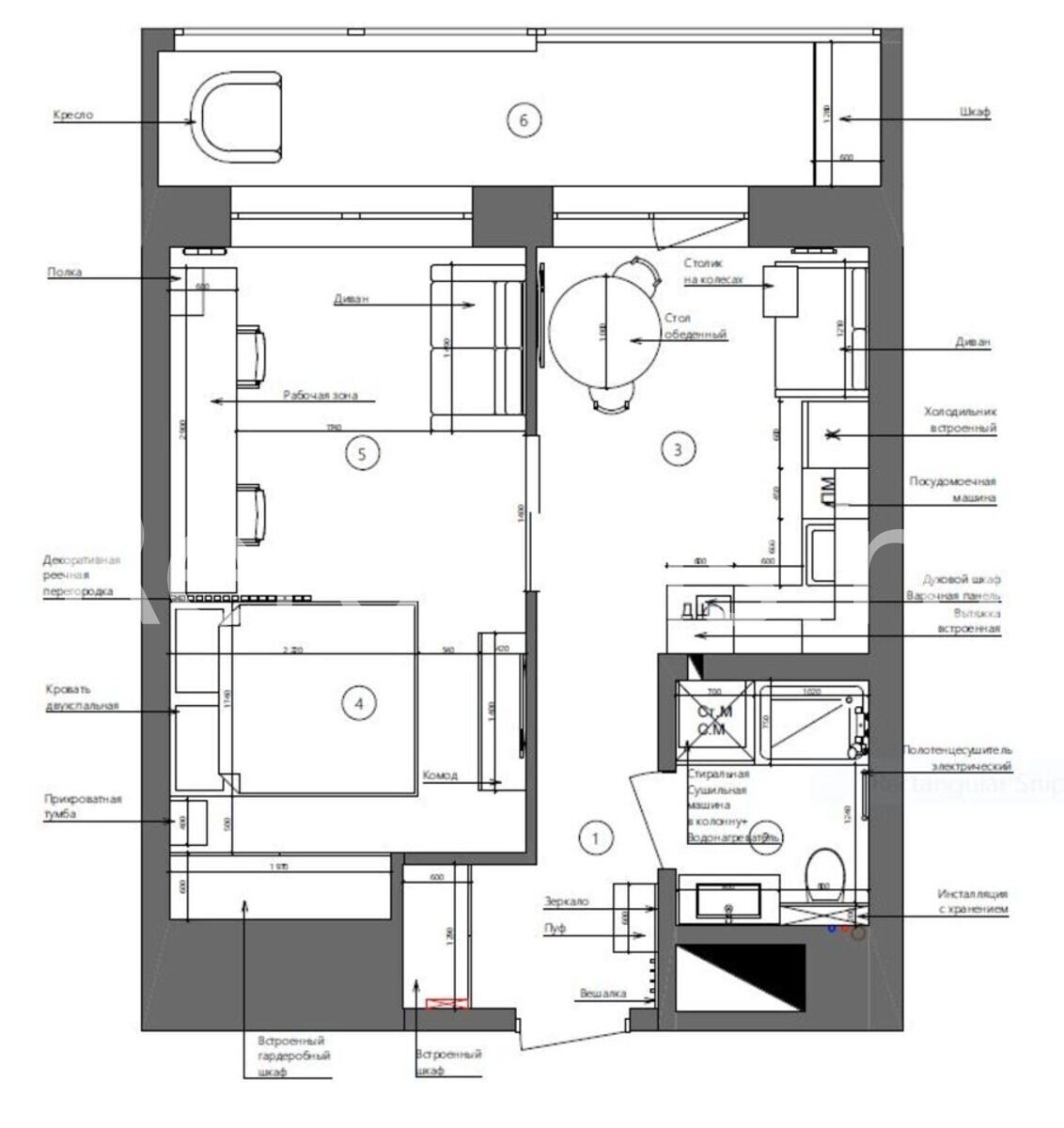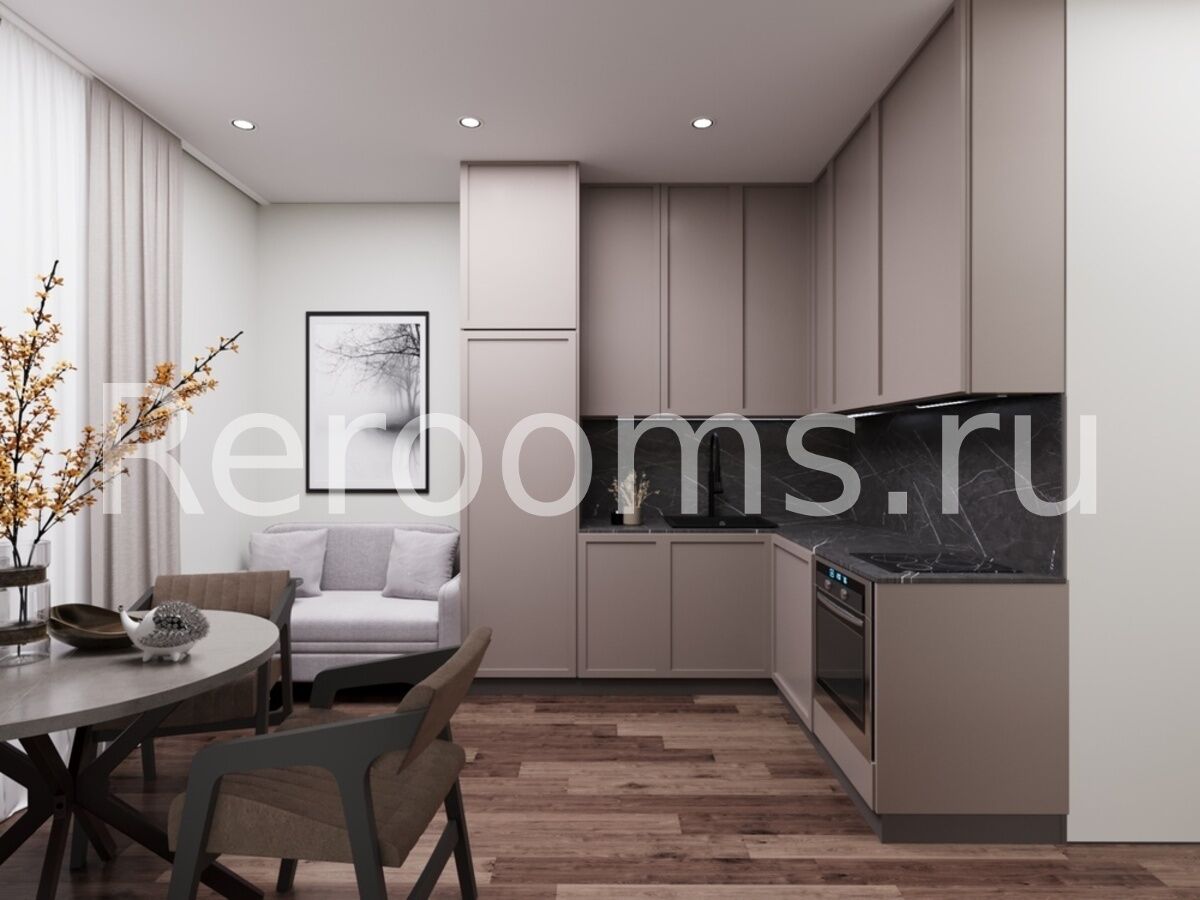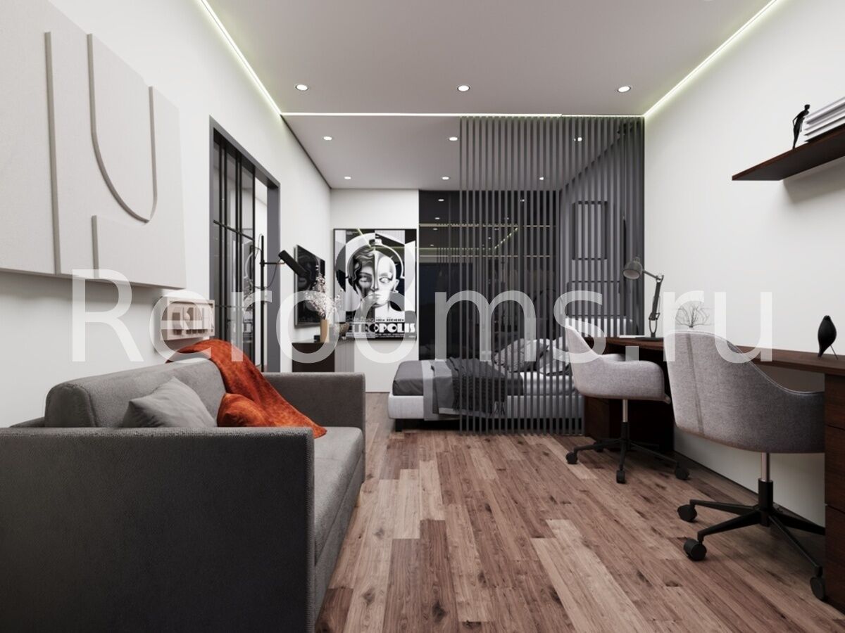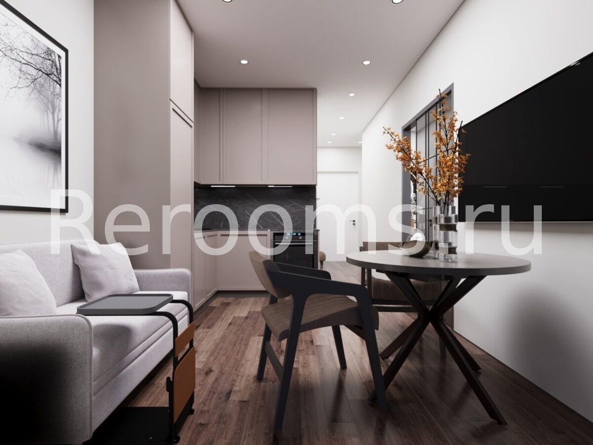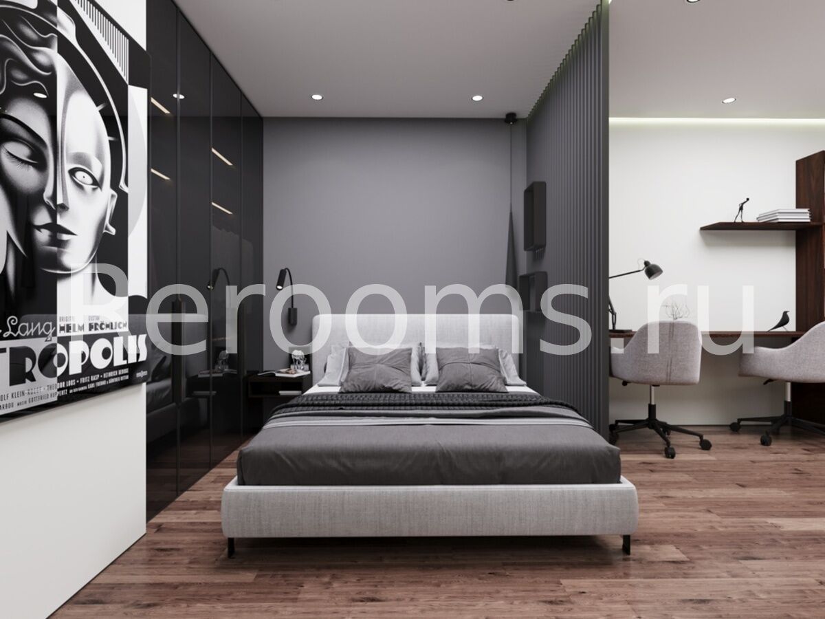 Интерьер квартиры выполнен в современном стиле с акцентами лофт-эстетики. Глубокие тёмные тона формируют элегантную и сдержанную атмосферу, а тщательно продуманная планировка, игра фактур и необычное освещение подчёркивают идею современного дизайна.