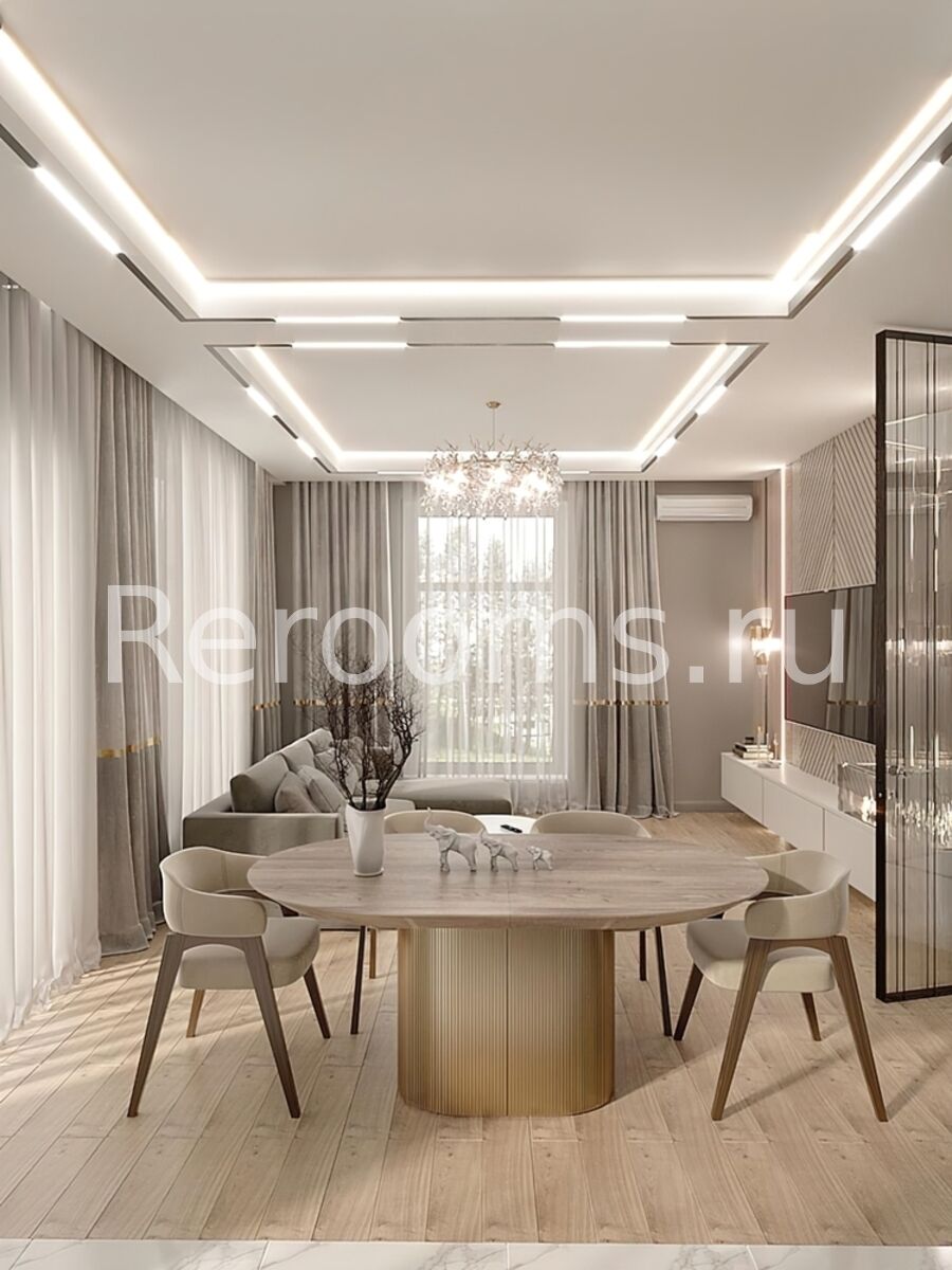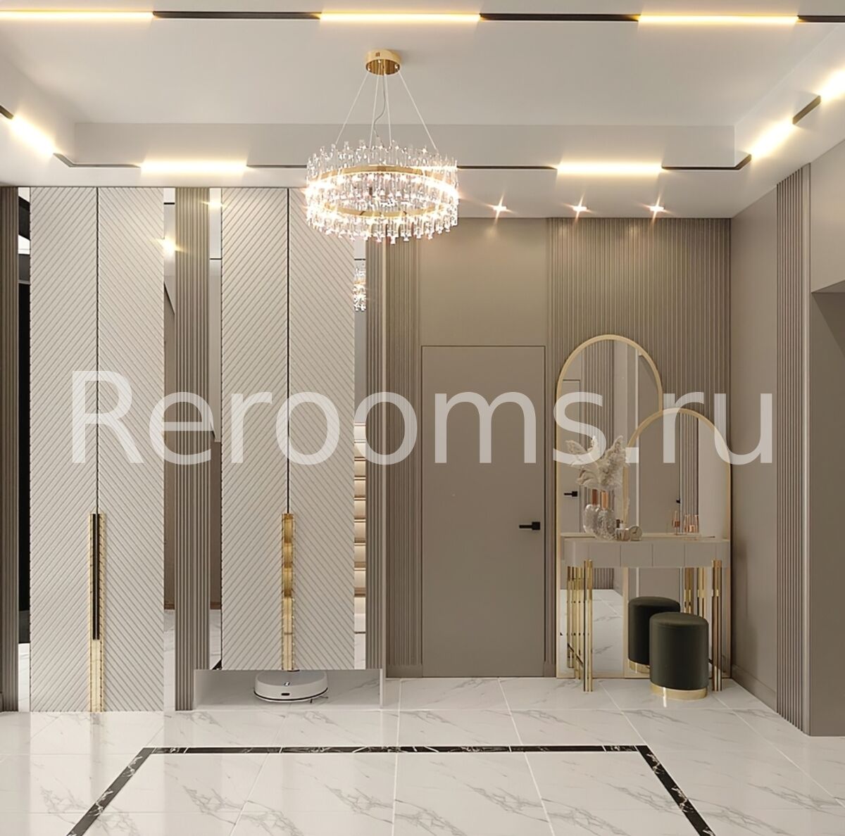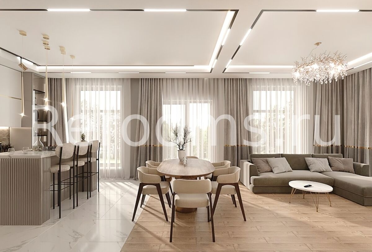 Дизайн-проект частного дома выполнен в стиле модернизм. Красивая архитектура пространства, изящный декор, гармоничное сочетание различных текстур в этом интерьере смотрятся необычайно изысканно и целостно. Разноплановое освещение придает пространству индивидуальный характер, а цветовая гамма в сложных бежево-коричневых тонах делает его стильным и респектабельным.