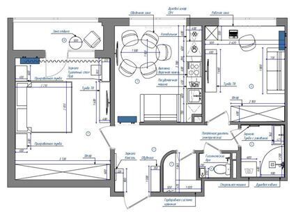 Дизайн этой двухкомнатной квартиры выполнен в современном стиле. Элегантная минималистичная мебель, разнообразие текстур, сдержанная палитра с яркими акцентами и стильные светильники создают в пространстве гармоничную и цельную атмосферу.