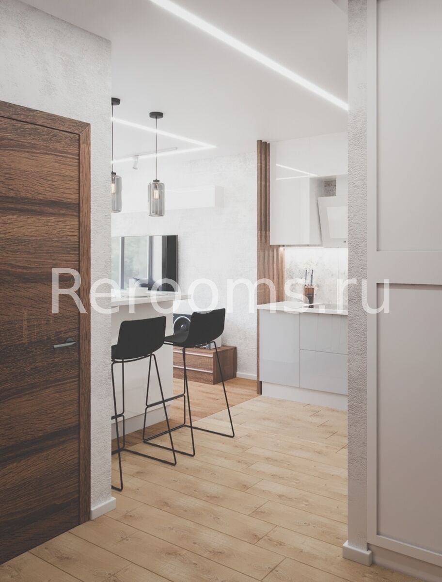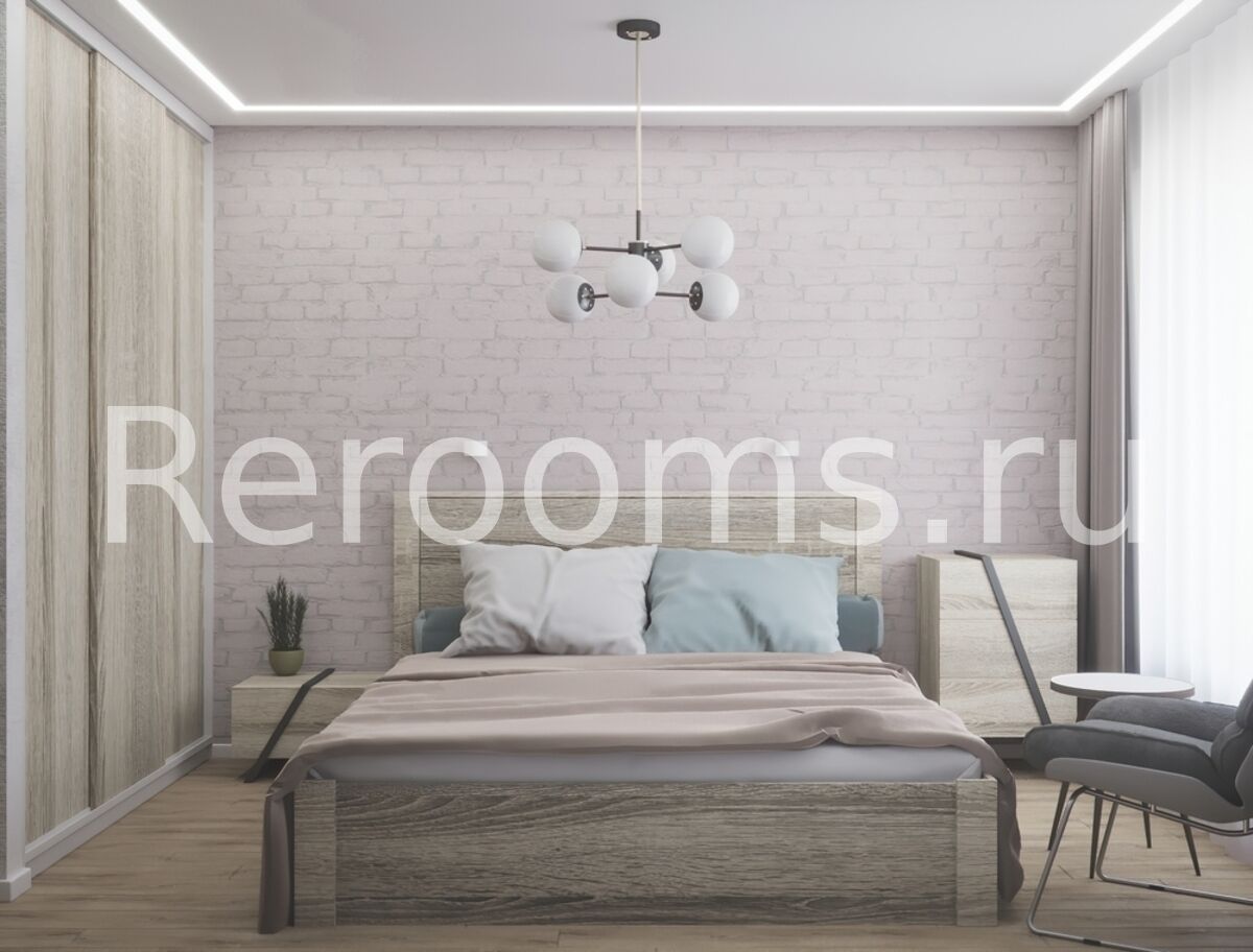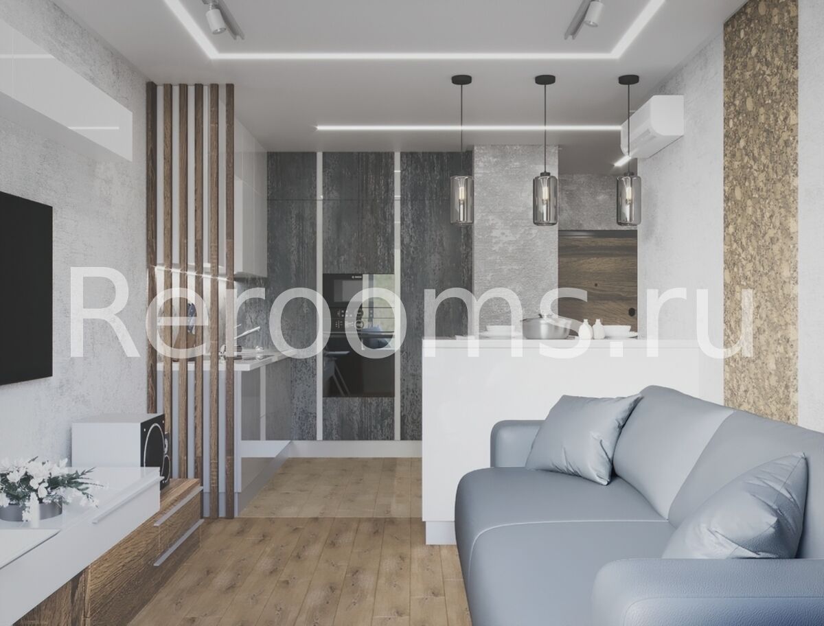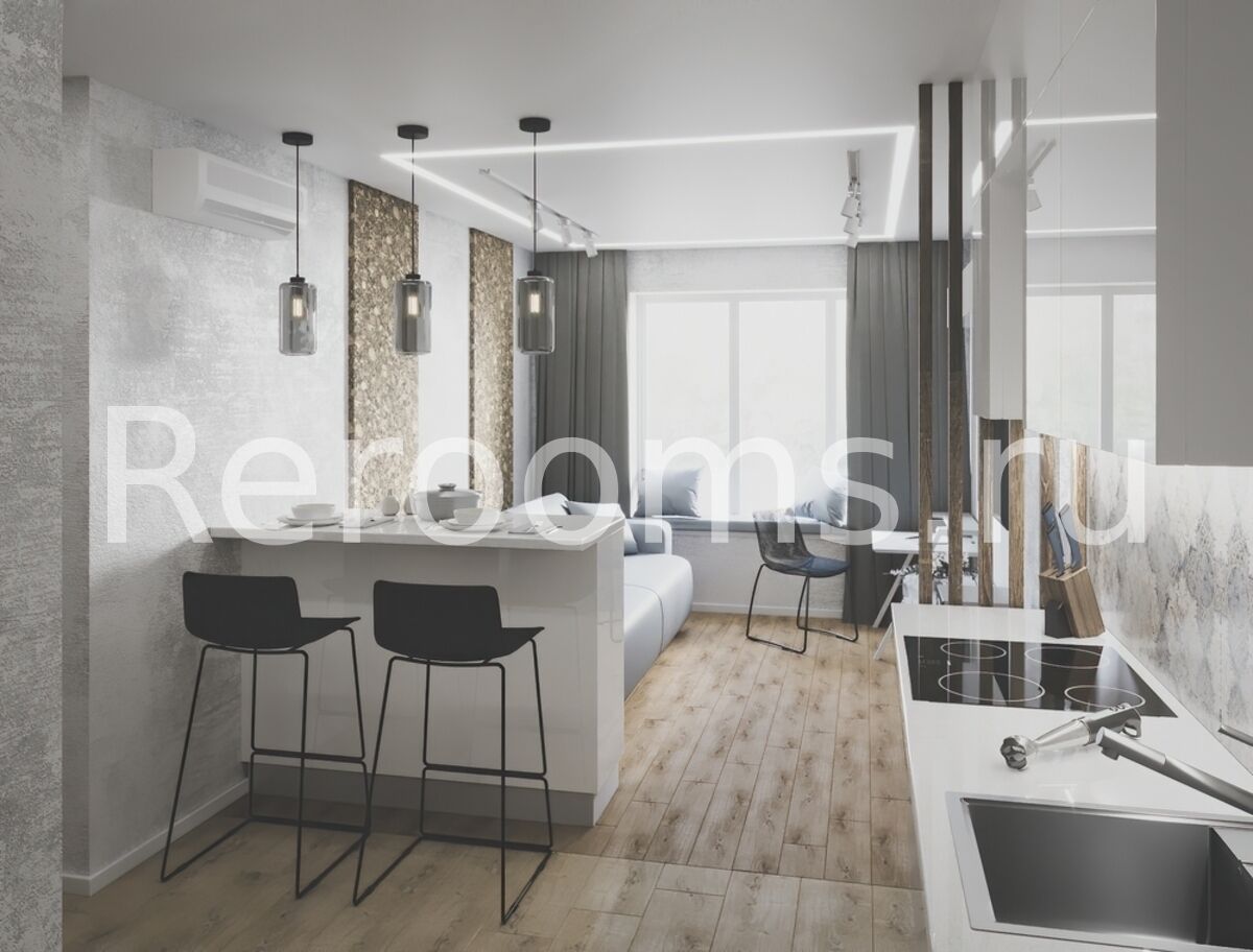 Проект, выполненный для этой небольшой двухкомнатной квартиры, отличается функционализмом и современным видом. В качестве базовых цветов использованы серый и белый. Такая гамма идеально сочетается с бежевым цветом, представленном в оформлении пола и некоторой мебели. Пространство одной из комнат поделено на две функциональные зоны - кухни и гостиной. Зонирование произвели при помощи барной стойки. В спальне все достаточно лаконично. В качестве акцента выступает стена с кирпичной кладкой. Она придает помещению ультрамодный вид.