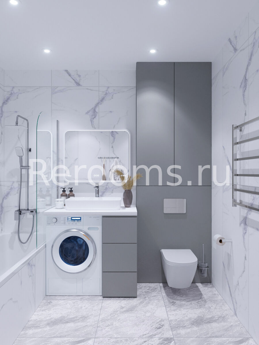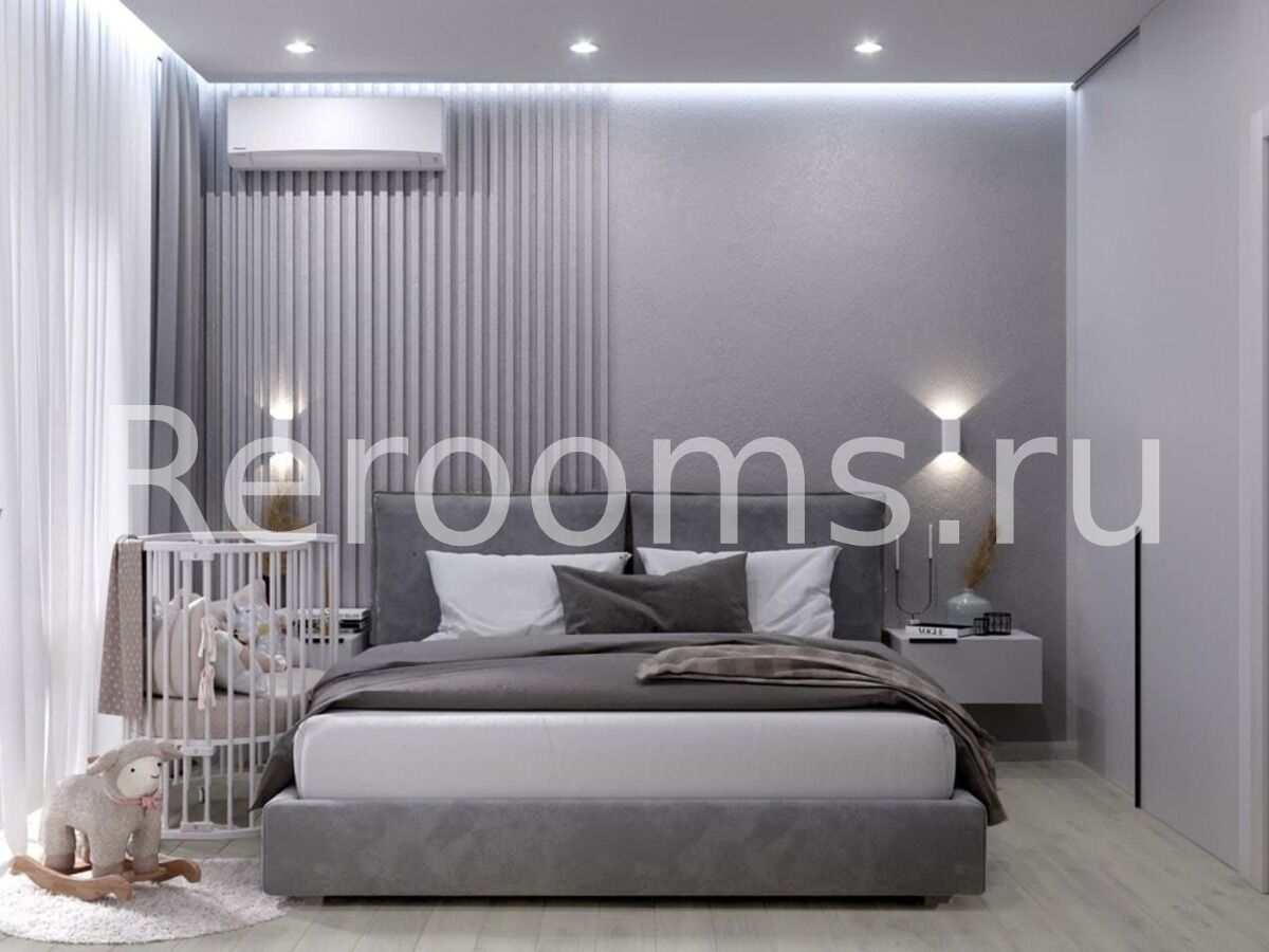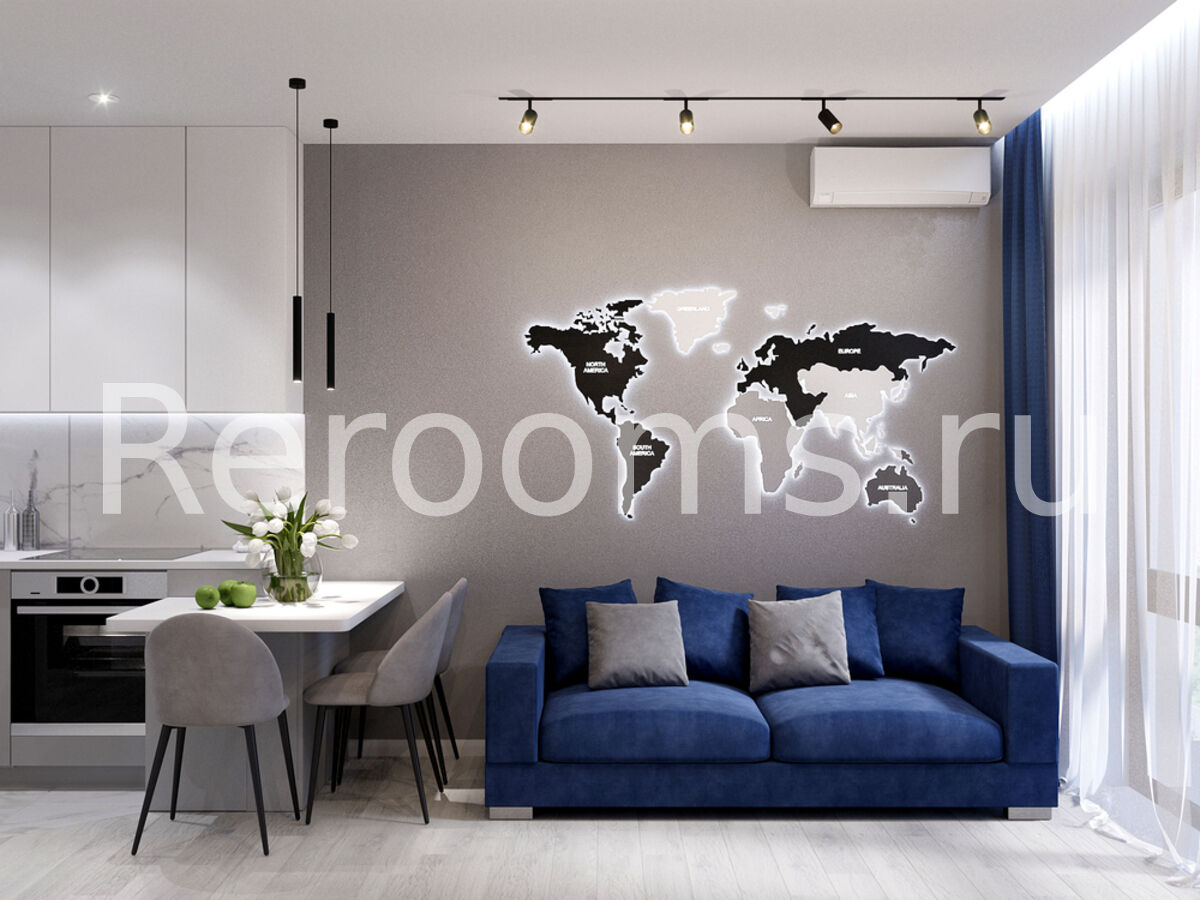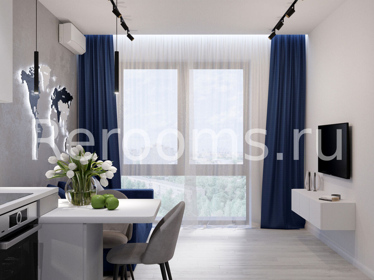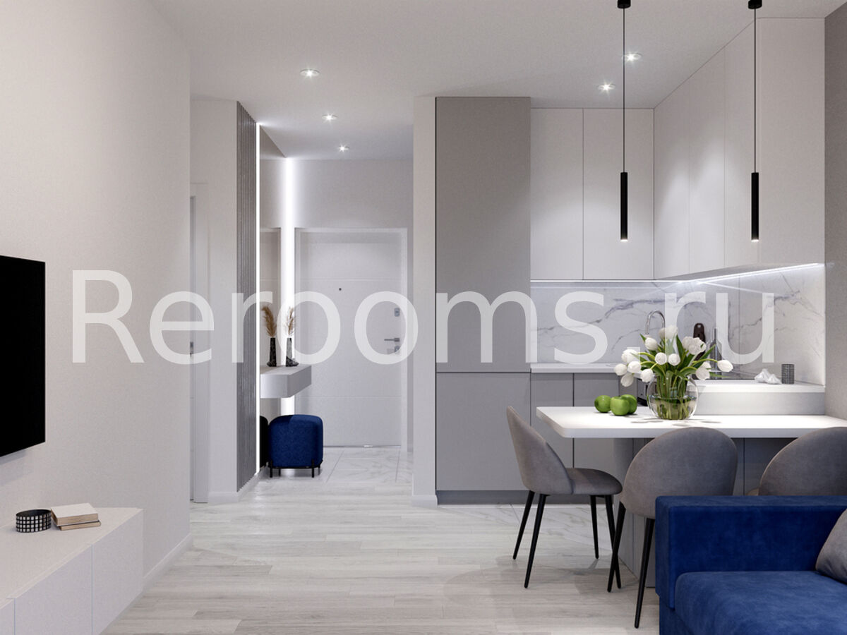 Разрабатывая проект этой двухкомнатной квартиры, дизайнер следовала основным принципам стилистики модернизма, благодаря чему помещение получилось необычайно стильным, современным и функциональным. Большое пространство кухни-гостиной сделали максимально комфортным. Лаконичный кухонный гарнитур дополнили обеденной группой в виде невысокой барной стойки. Помещение спальни очень практично и минималистично. Такой дизайн не отвлекает и позволяет полностью расслабиться.