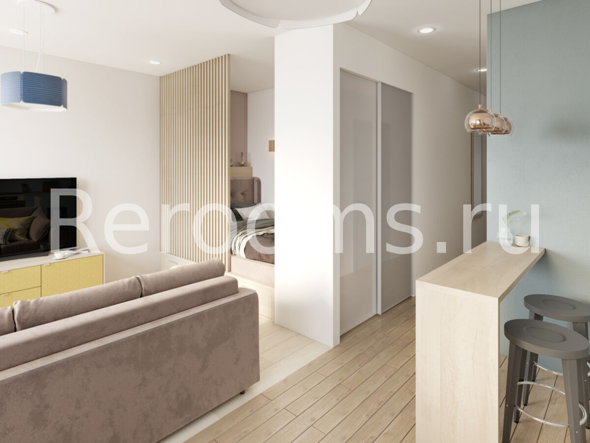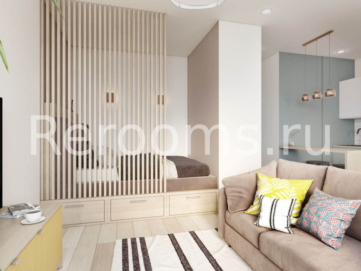 Проект этой небольшой однокомнатной квартиры выполнен в скандинавском стиле. Светлые тона с яркими акцентами, лаконичные линии и простые архитектурные формы создают в интерьере ощущение простора и свободы. Несмотря на то, что в одном пространстве объединено несколько функциональных зон, оно совсем не кажется перегруженным. Функциональные системы хранения позволяют разместить все самое необходимое, оставив максимум свободного места.