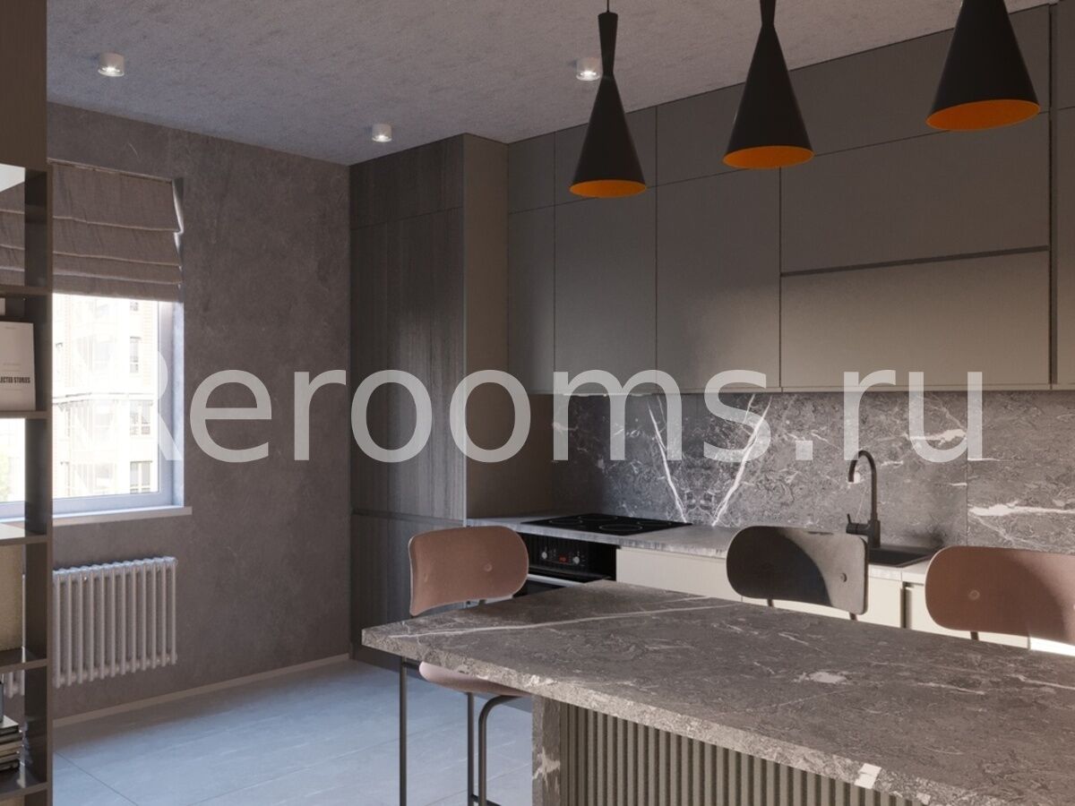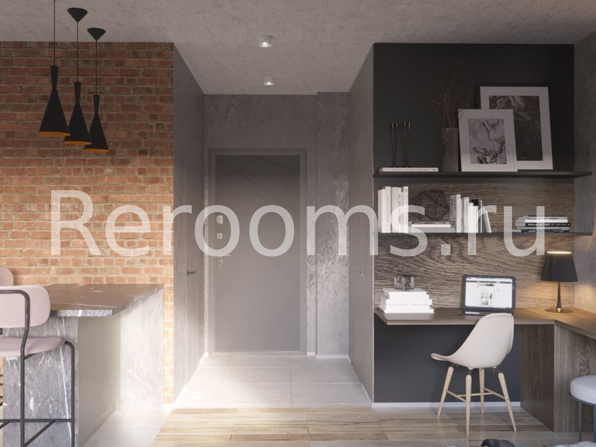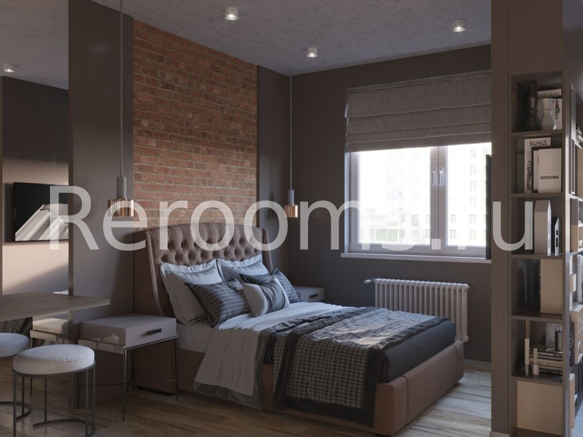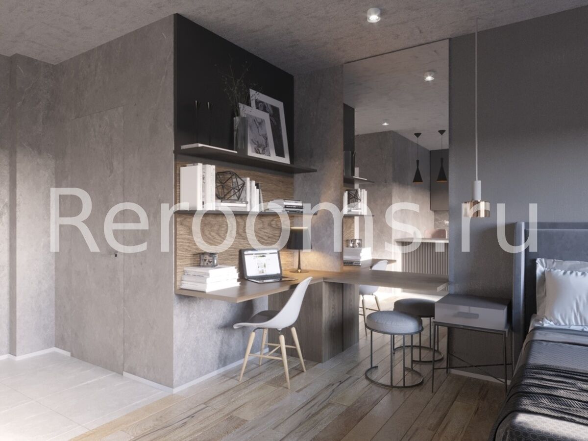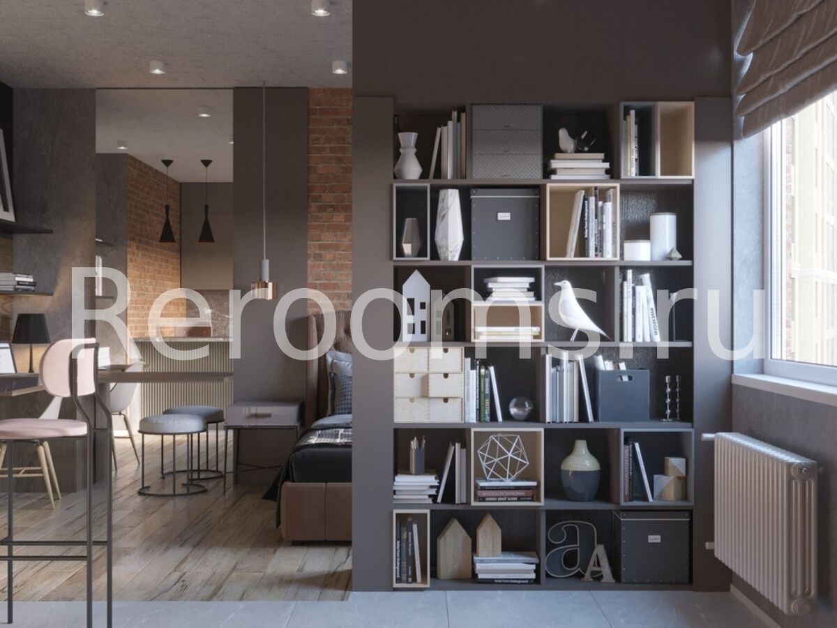 Интерьер этой квартиры-студии выполнен в стиле лофт. Тон в помещении задают характерные для этой индустриальной стилистики терракотовый и серый цвета. Пространство поделено на несколько функциональных зон - кухни, гостиной-спальни и рабочего кабинета. Зону гостиной отделили от кухонного помещения перегородкой в виде шкафа. Особое внимание уделено освещению. В каждой зоне предусмотрены свои светильники, также выполненные в фабричной стилистике. Кроме основной комнаты и ванной в квартире обустроили удобную гардеробную.