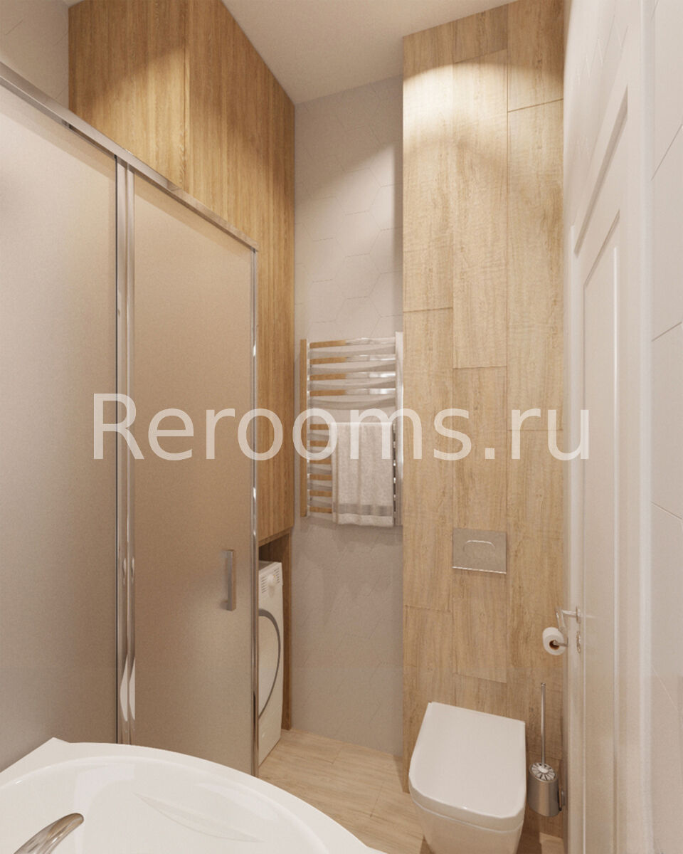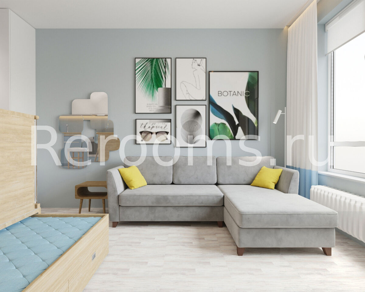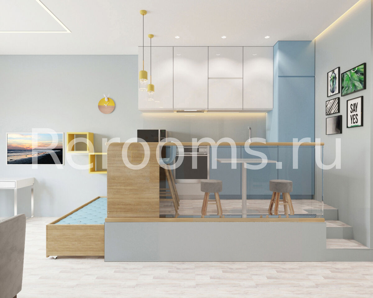 Эта небольшая квартира-студия отличается функциональностью и ультрасовременным видом. Дизайн-проект сочетает в себе некоторые черты скандинавской стилистики, модернизма и минимализма. Светлая цветовая гамма с использованием белых, голубых и серых тонов визуально расширяет пространство, а яркий текстиль и элементы декора делают его интересным и самобытным. Главная особенность интерьера - небольшой подиум, на котором оборудована кухонная зона, а также выдвижное спальное место.