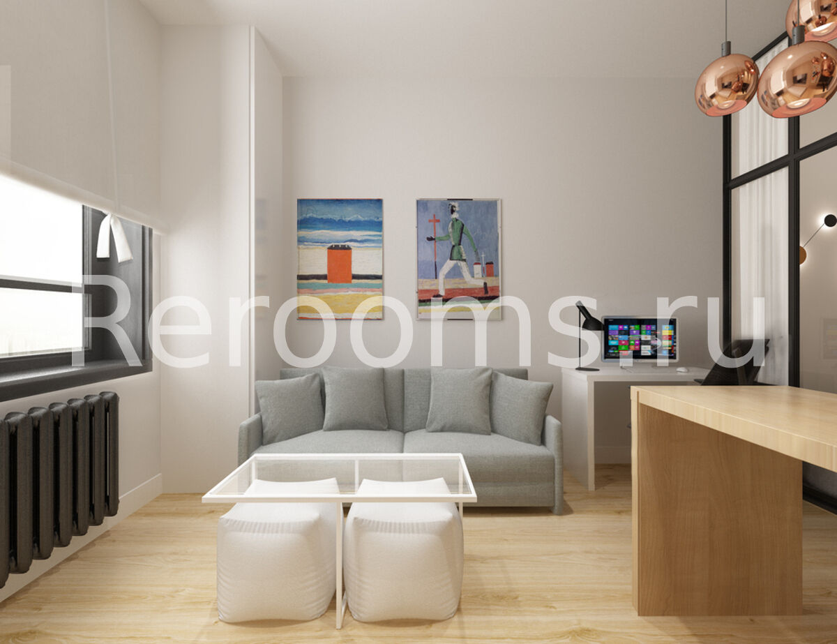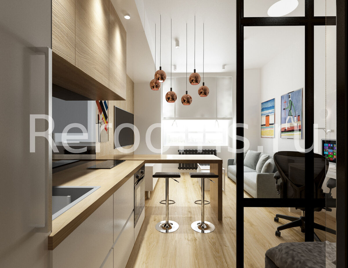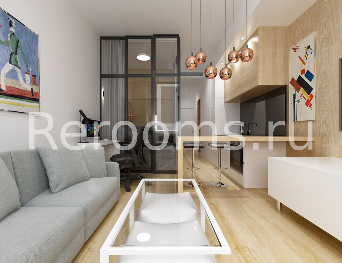 Дизайн-проект этой квартиры-студии выполнен в стиле минимализм. Светлые тона, лаконичные линии и архитектурные формы создают в интерьере ощущение простора и свободы. Здесь нет ничего лишнего и каждый предмет идеально вписан в пространство. Благодаря грамотному зонированию на небольшой площади удалось разместить кухню, гостиную, спальню и полноценное рабочее место. Особое место в квартире отведено свету: в каждой зоне использован свой стильный светильник.