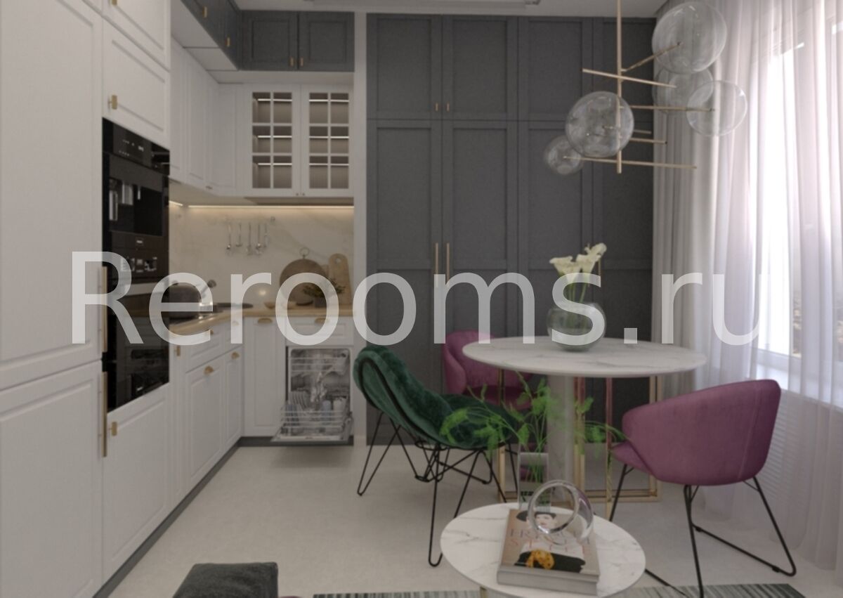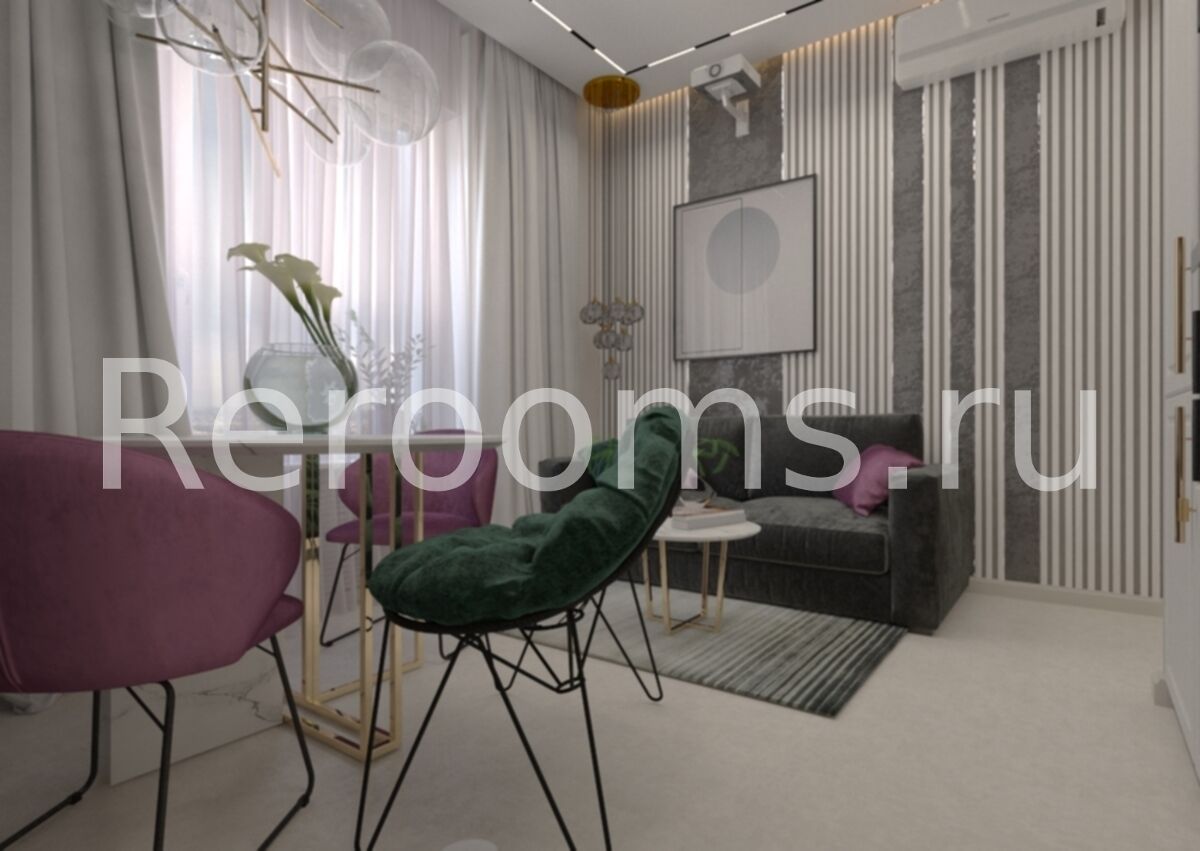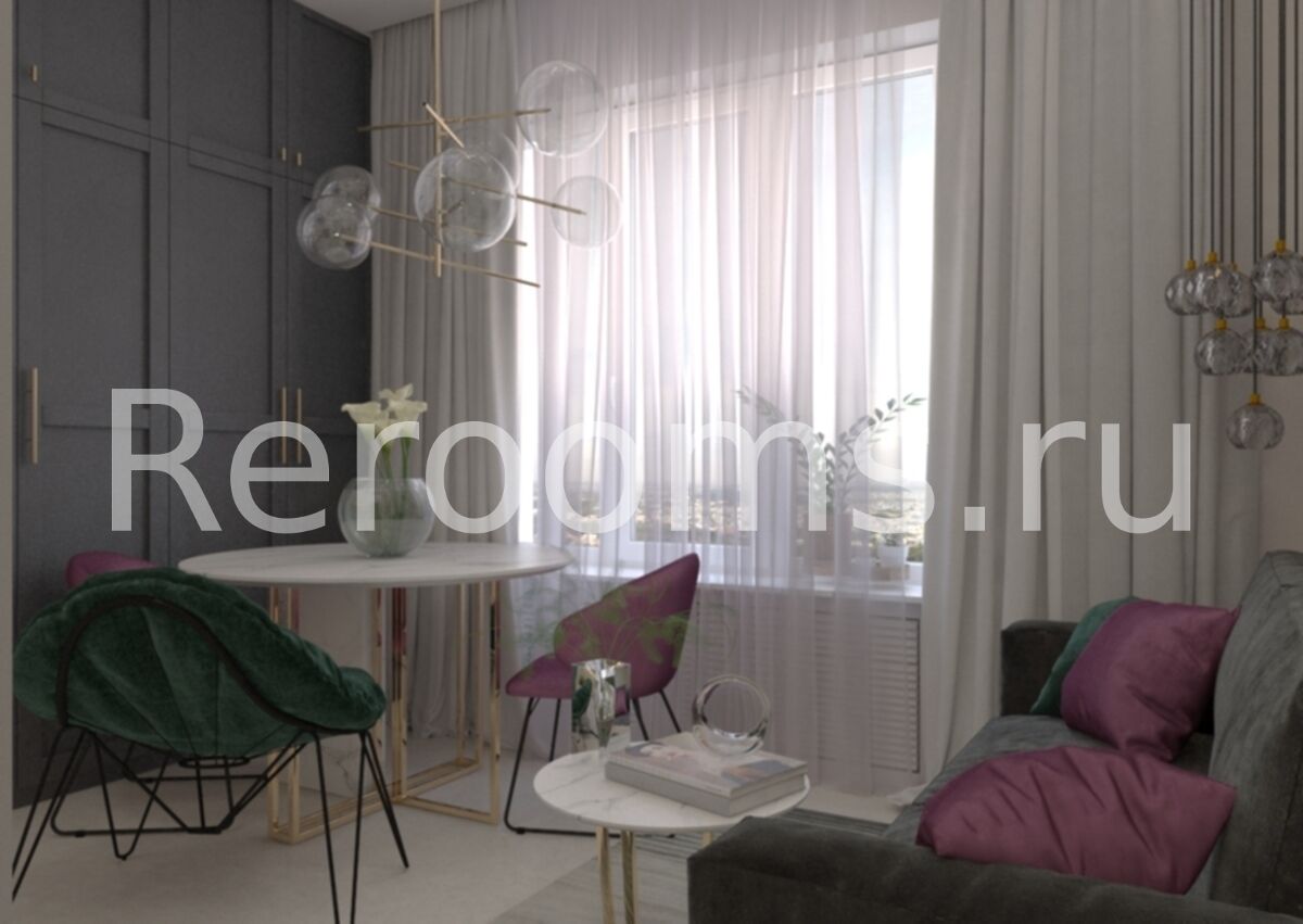 Дизайн-проект этой небольшой квартиры-студии получился очень современным и изысканным. Удачный микс различных стилистических направлений создает в ней неповторимую уютную атмосферу. В качестве основных цветов выбраны серый, глубокий зеленый, белый и акцентный цвет фуксии. Материалы, подобранные для отделки квартиры, отличаются высоким качеством и необычайно эстетичны. Вся мебель и системы хранения функциональны и идеально вписаны в пространство.