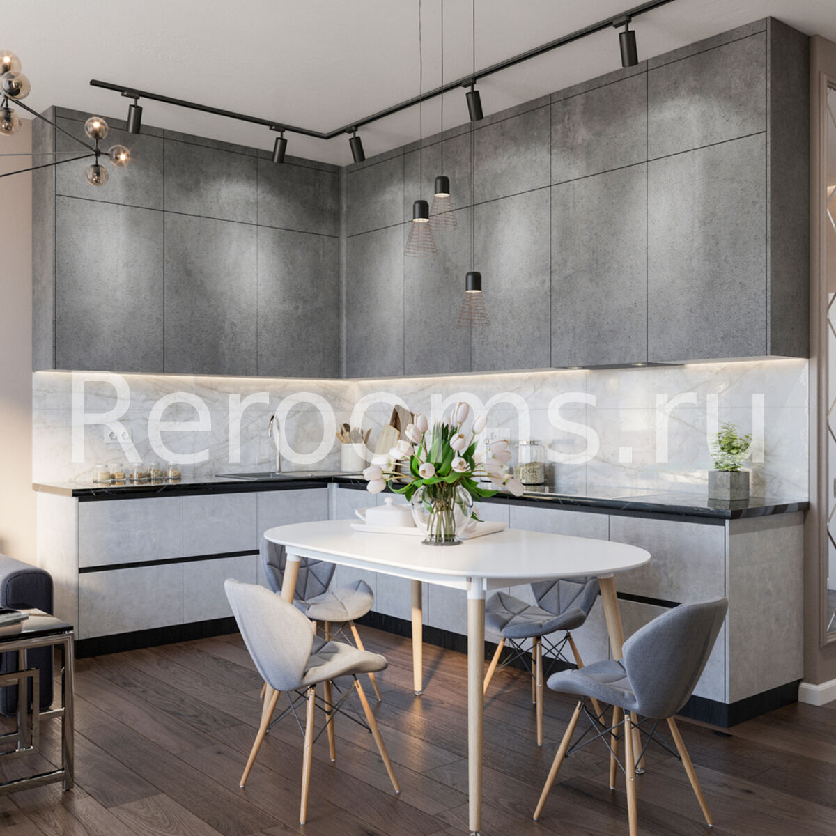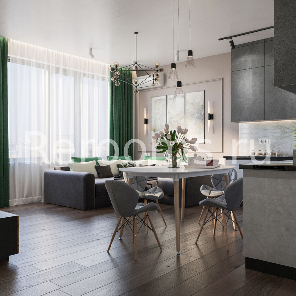 Интерьер этой квартиры получился достаточно эклектичным. Дизайнер умело объединила в нем элементы современной классики, лофта, модернизма и арт-деко. Все помещения обладают четкой геометрией. Цветовая гамма построена на контрастах. Красивый цвет какао здесь сочетается с хвойным зеленым, насыщенным синим и серым цветом. В интерьере удачно скомбинированы такие декоративные элементы как стеновые панели, зеркала и грубое дерево. Особое внимание уделено освещению. В каждом помещении помимо основного источника света присутствуют дополнительные осветительные элементы.