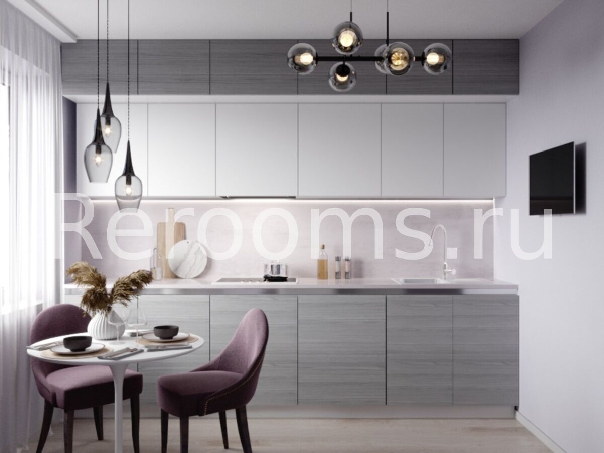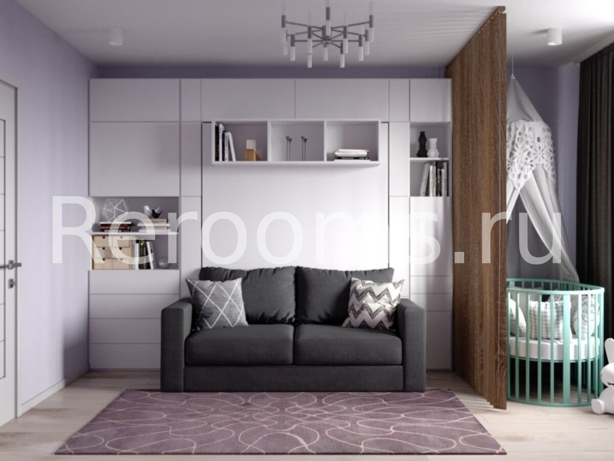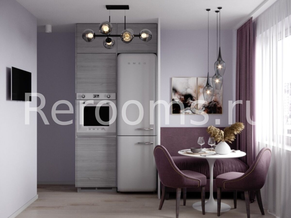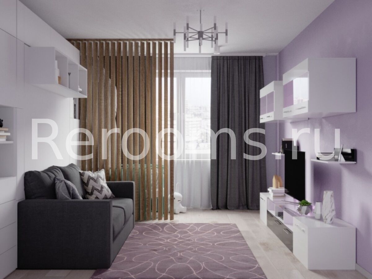 Целостность и логичность планировки, очевидная функциональность и доступность предметов интерьера - вот основные характеристики стиля контемпорари, которые легли в основу дизайн-проекта этой квартиры. Интерьер выполнен в светлой цветовой гамме. Здесь тон задают различные оттенки лилового и серого цветов. В комнате для зонирования использованы деревянные рейки. Они визуально отделяют гостиную от импровизированной детской и в то же время являются своеобразным декоративным элементом. Удачная планировка кухни позволила установить там не только полноценный мебельный гарнитур, но и небольшой диванчик.