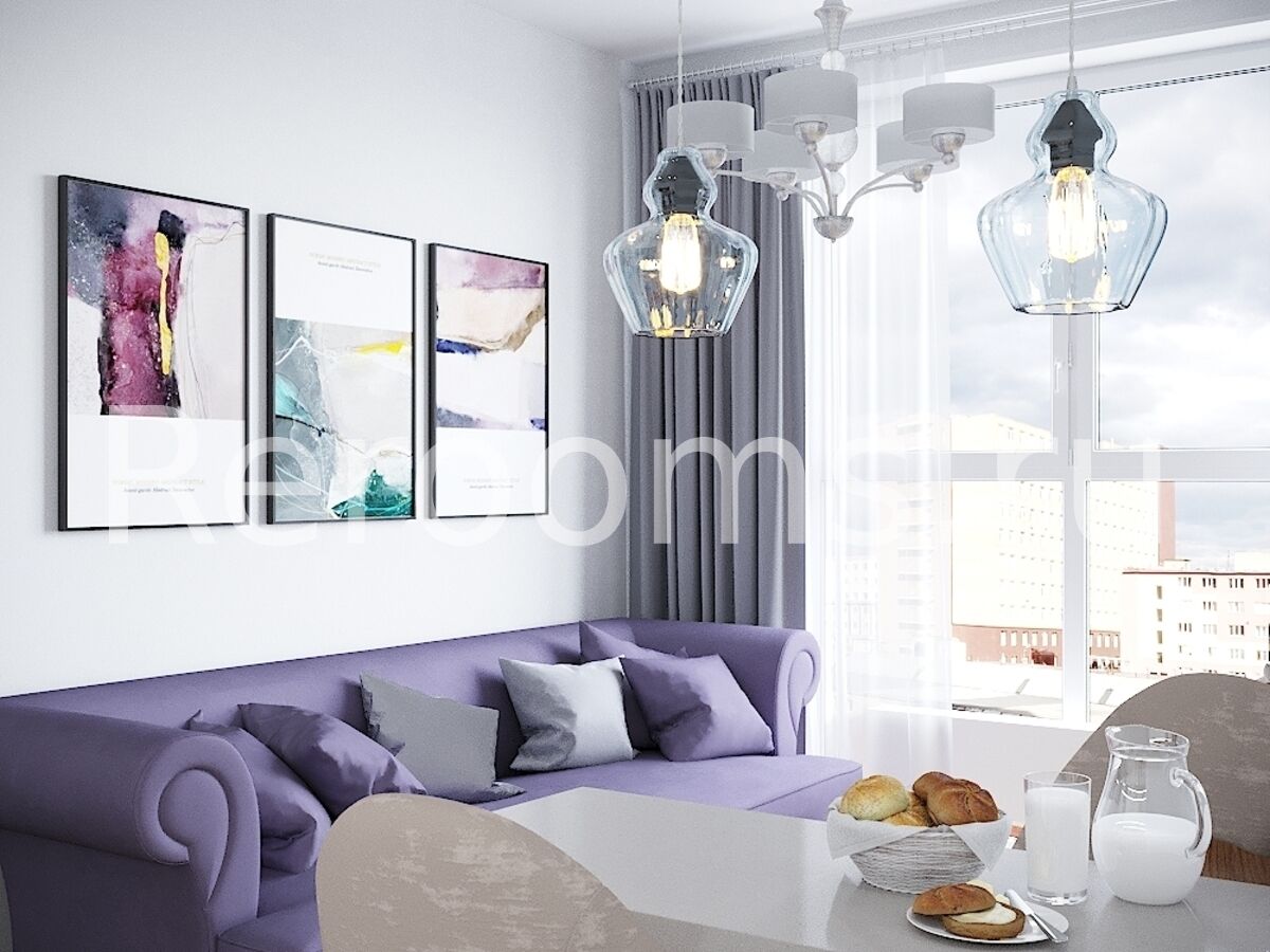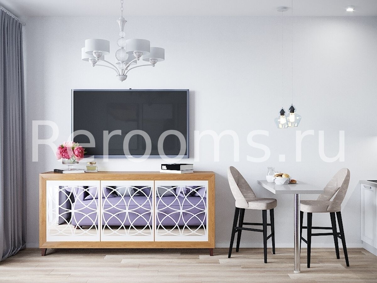 Этот красивый сдержанный по своему характеру интерьер выполнен в стиле современная классика. Зона гостиной достаточно минималистична. Она сделана в светлых тонах и отделена от спальни легкими стеклянными перегородками. Кухня идеально вписывается в общий ансамбль квартиры и подчеркивает изысканный вкус хозяев.