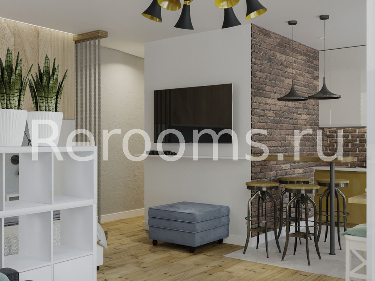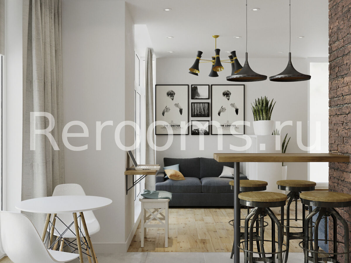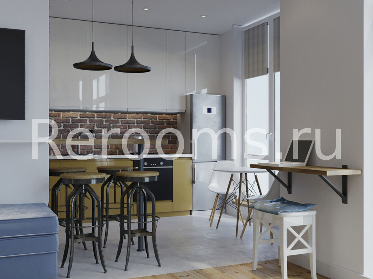 Дизайн-проект однокомнатной квартиры выполнен в стиле лофт. Интерьер выдержан в светлой цветовой гамме, с соблюдением всех правил лофтовой стилистики. Кирпичная кладка в кухонной зоне придает помещению ультрасовременный вид. Разноплановая отделка и декор позволяют визуально поделить пространство квартиры на несколько функциональных зон.