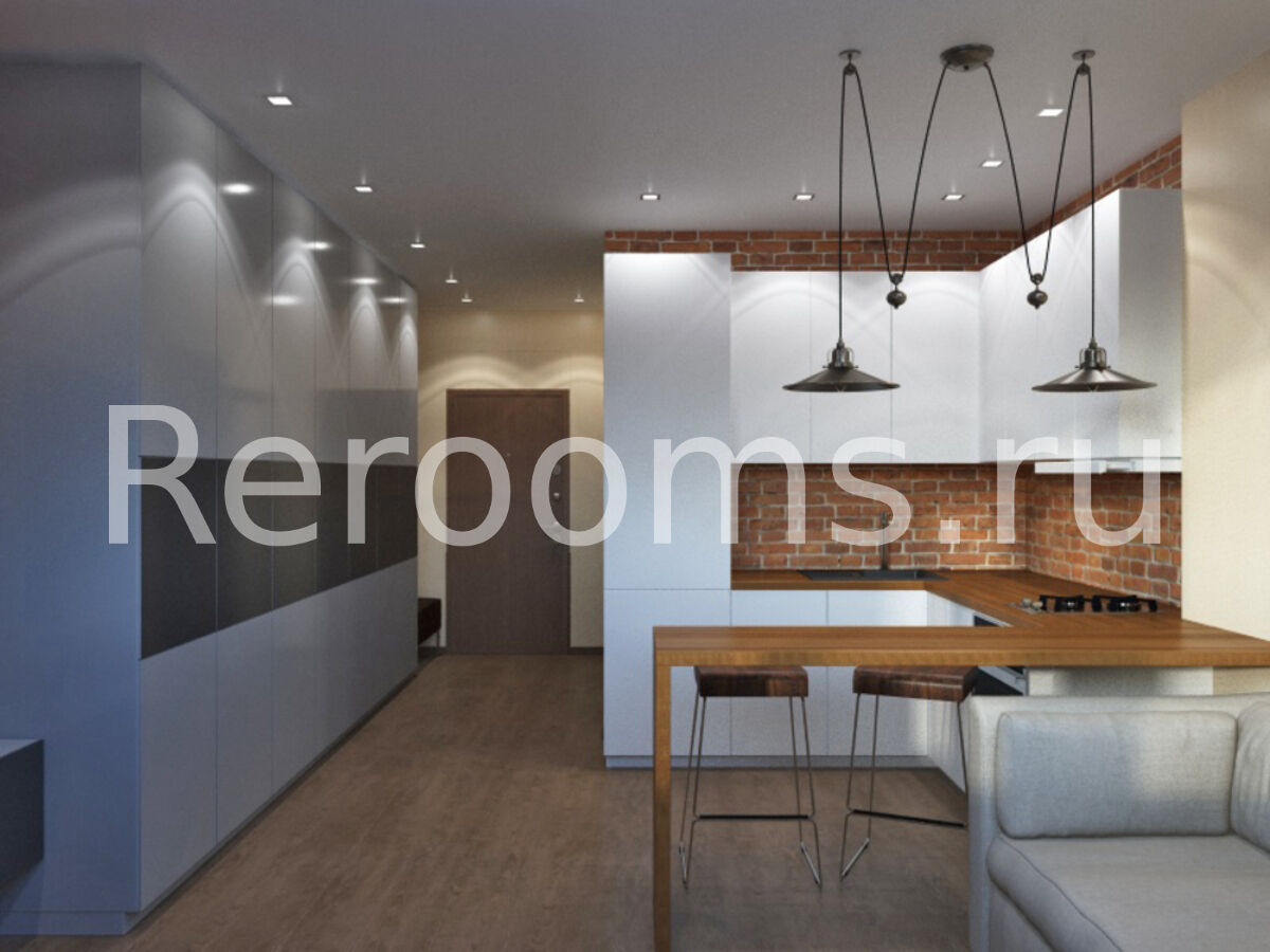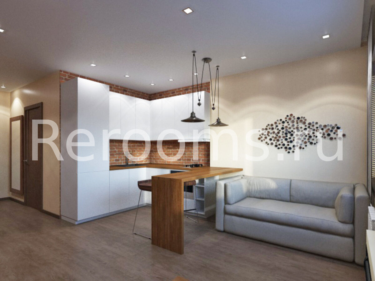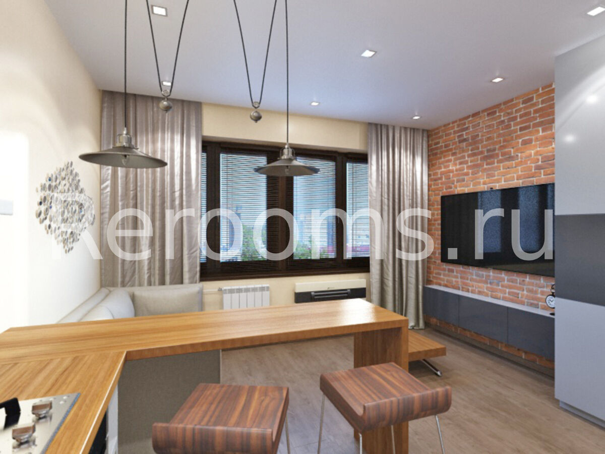 В качестве разделительного элемента использована барная стойка. Она поделила пространство на две функциональные зоны - кухню и гостиную.