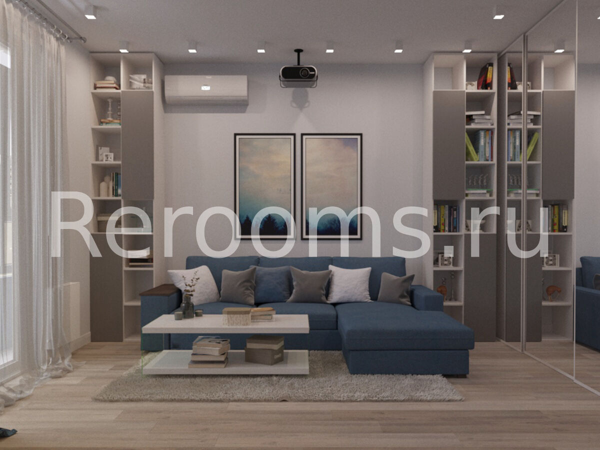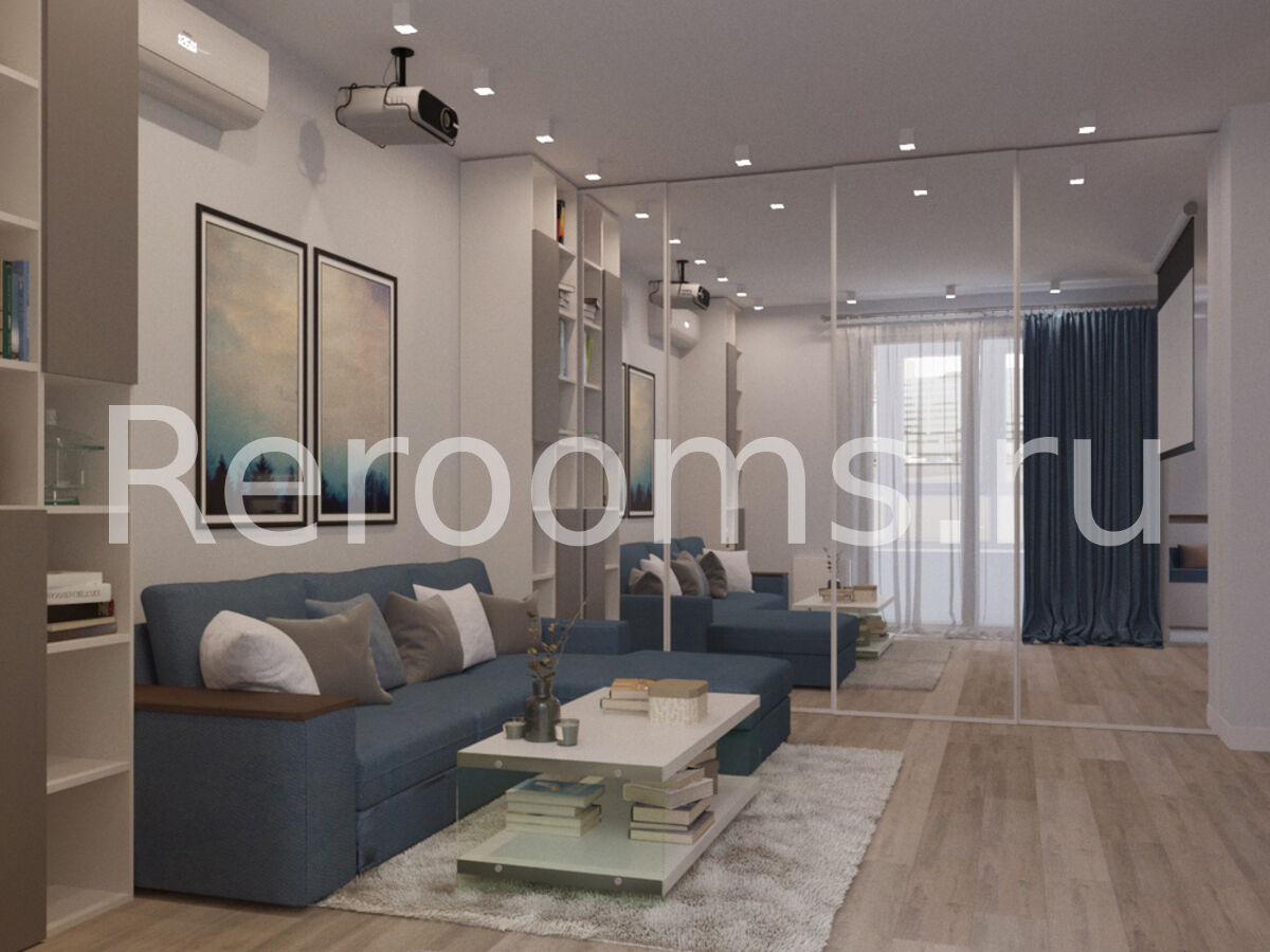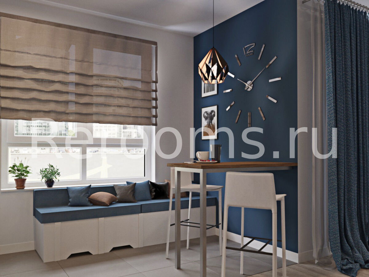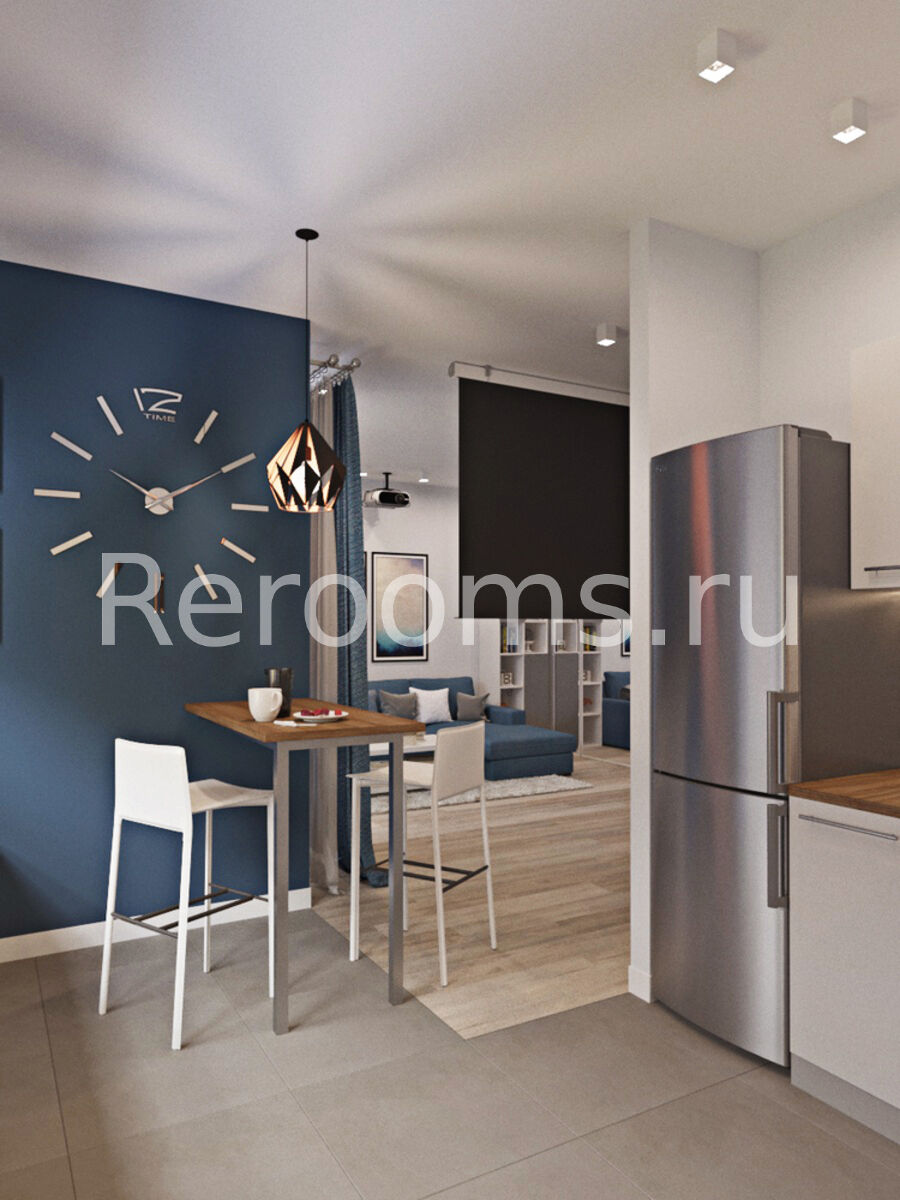 Разрабатывая проект этой квартиры-студии, дизайнеры руководствовались основными правилами скандинавского стиля. Интерьер нужно было сделать максимально просторным, уютным и функциональным. В качестве основных тонов отделки выбрали типичные для сканди-стиля белый, синий и серый цвета. В зоне гостиной установили удобный диван и большой зеркальный шкаф, который визуально увеличивает пространство. Функциональный кухонный гарнитур идеально вписан в пространство и полностью соответствует выбранной стилистике.