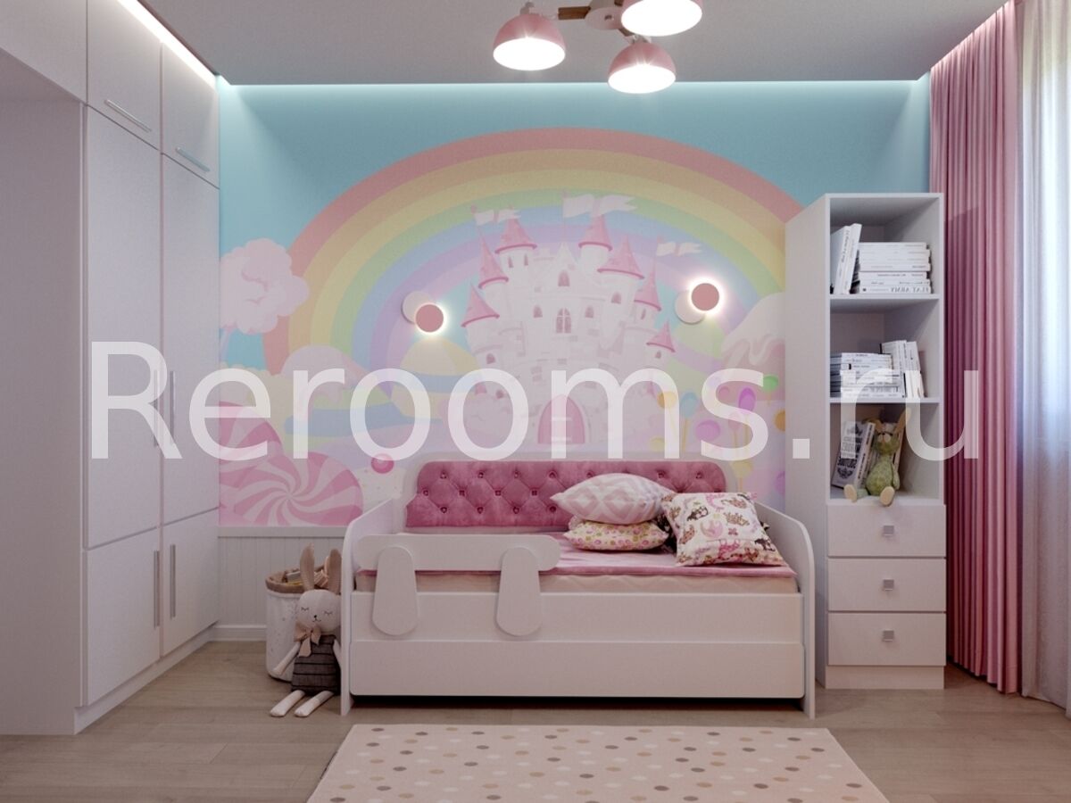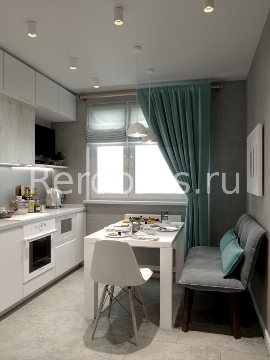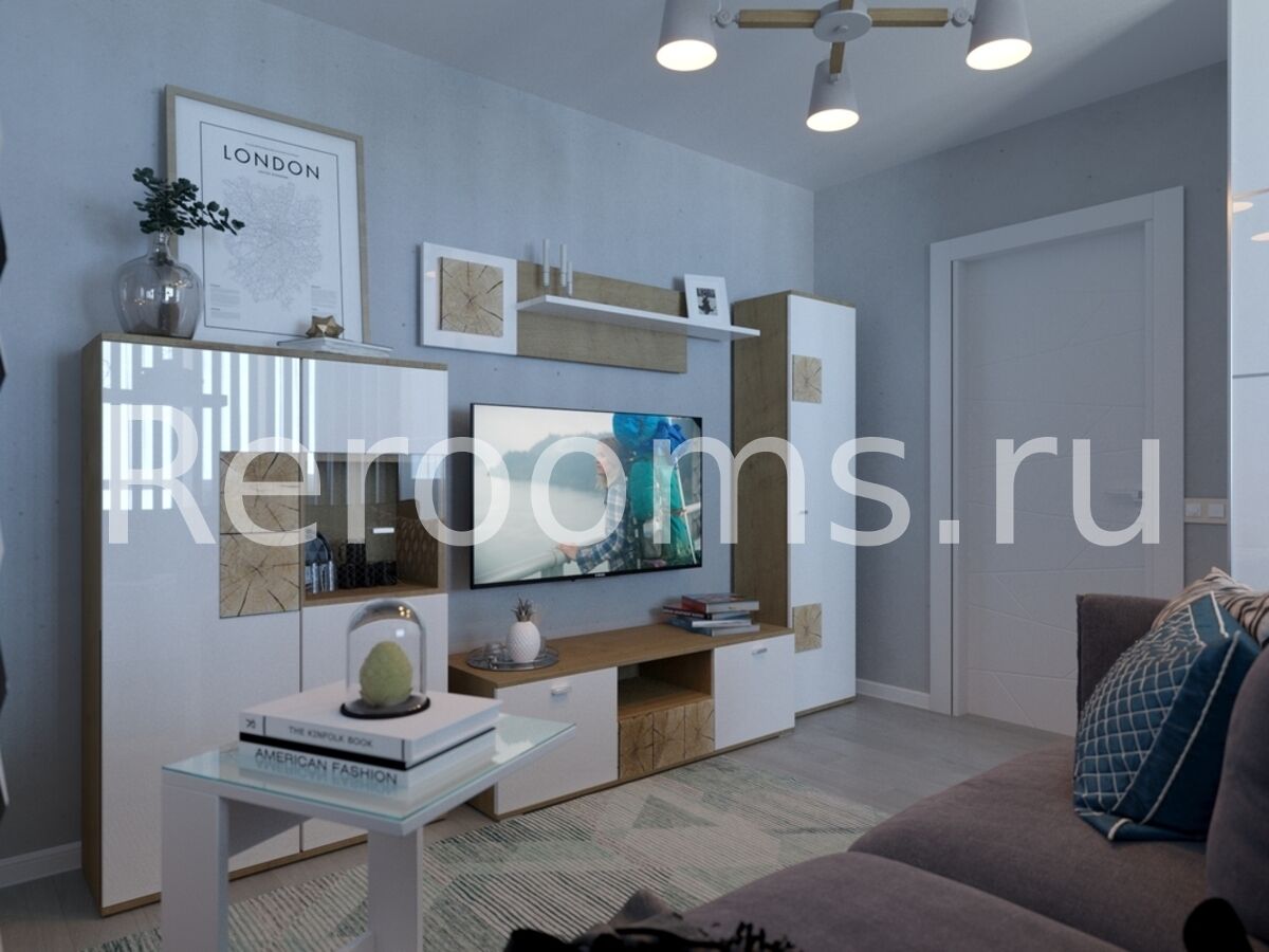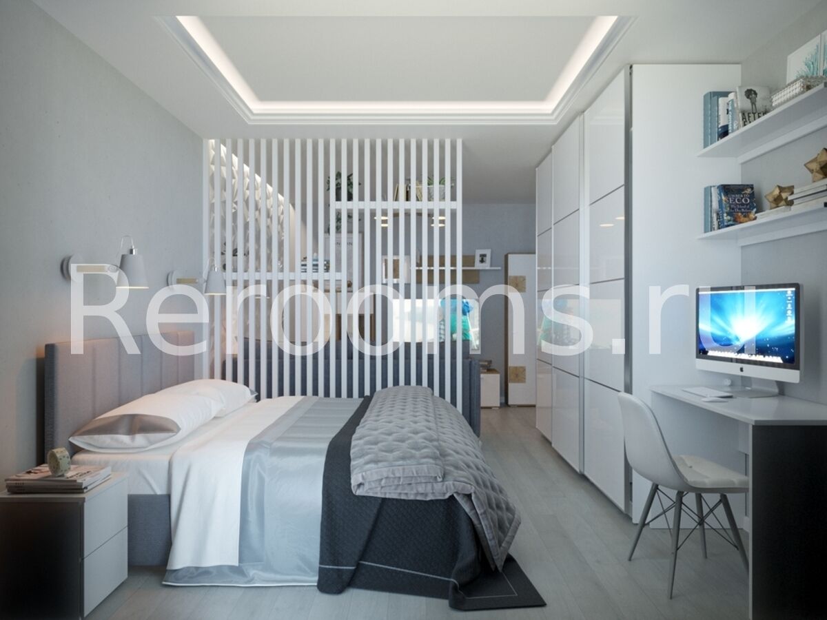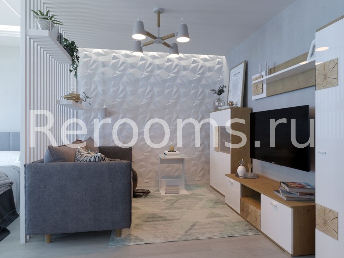Разрабатывая проект этой квартиры, дизайнеры руководствовались основными правилами скандинавского стиля, в результате чего получился просторный, уютный и функциональный интерьер. В качестве основных тонов отделки выбрали типичные для сканди-стиля белый и серо-голубой цвета. Яркие оттенки решили использовать в детской. Для всех помещений подобрали удобную мебель лаконичных форм. В комнате, отведенной под гостиную и спальню установили рейчатую перегородку, которая отлично разделила пространство на две функциональные зоны. В кухне лаконичный гарнитур идеально вписан в пространство и полностью соответствует выбранной стилистике.