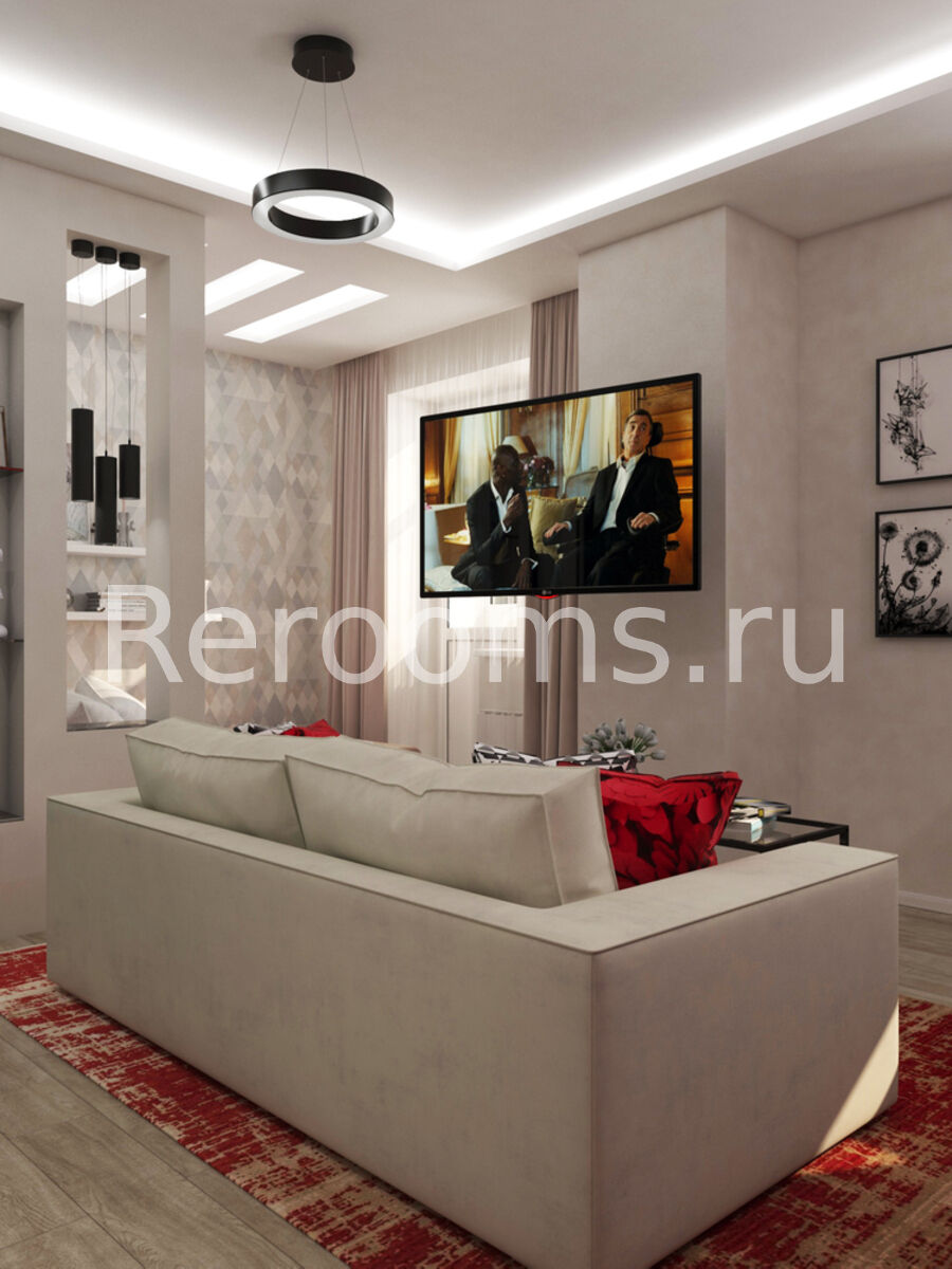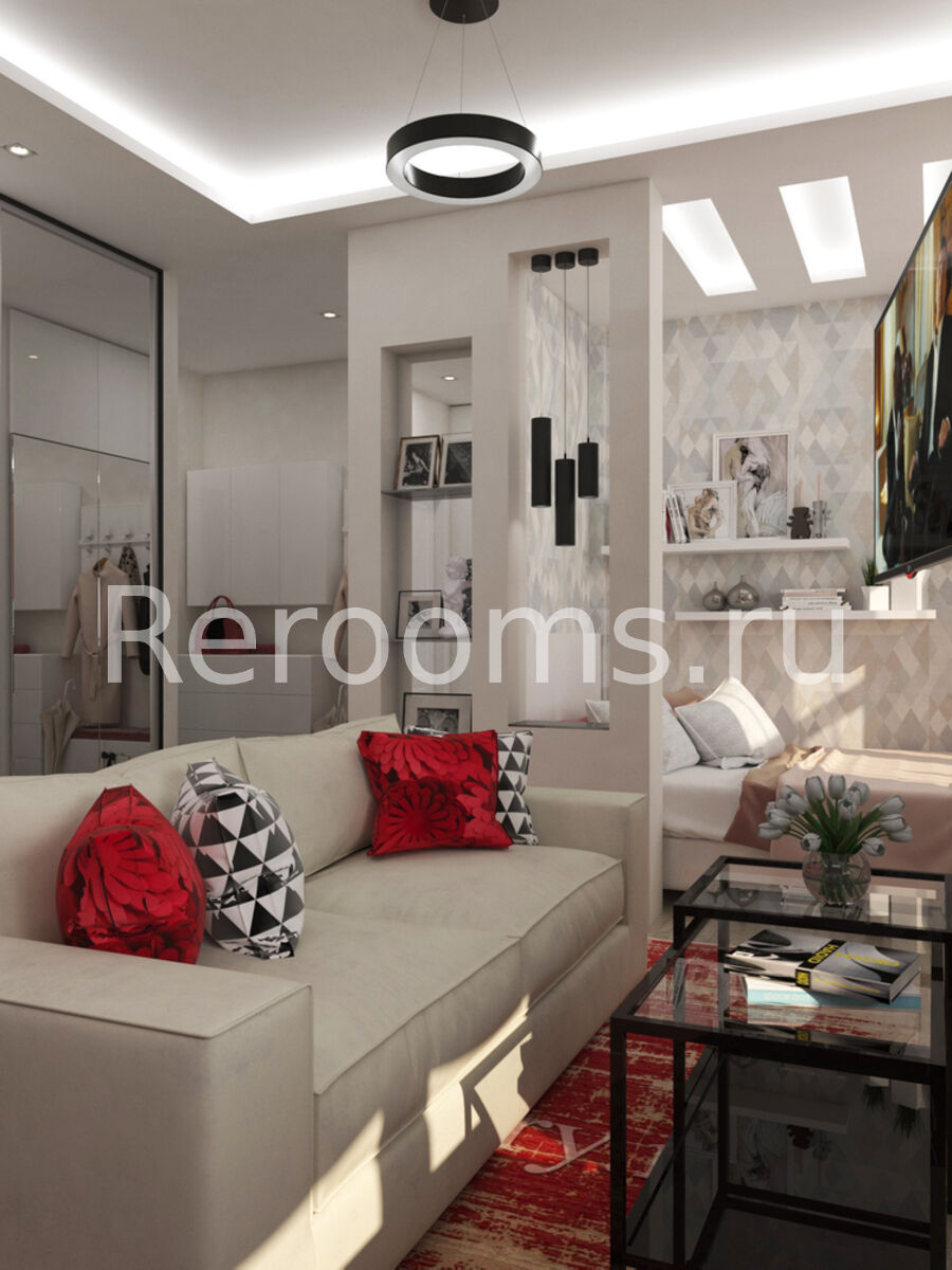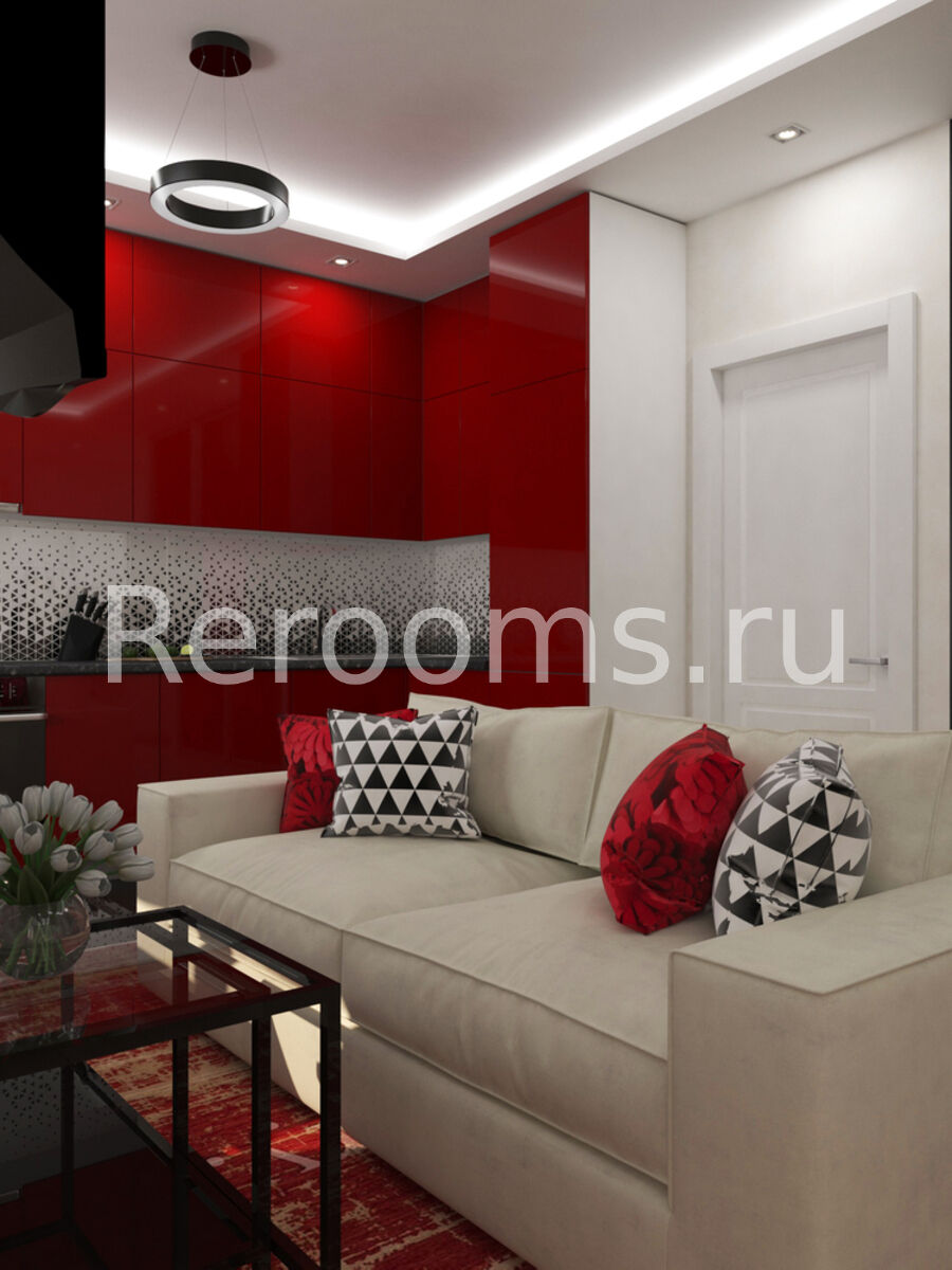 Дизайн-проект этой однокомнатной квартиры выполнен в стиле модернизм. На небольшой площади удалось разместить функциональную кухню, удобную гостиную зону и полноценную спальню. В кухонном пространстве все компактно и удобно. Массивный обеденный стол заменили барной стойкой, установленной у окна. В гостиной есть все для полноценного отдыха - удобный диван, телевизор и вместительный шкаф с зеркалами, визуально расширяющими рамки пространства. В зоне, выделенной под спальню, установили полноценную кровать, и минималистичные полки для хранения полезных мелочей. Яркие цветовые акценты делают пространство ультрасовременным и модным.
