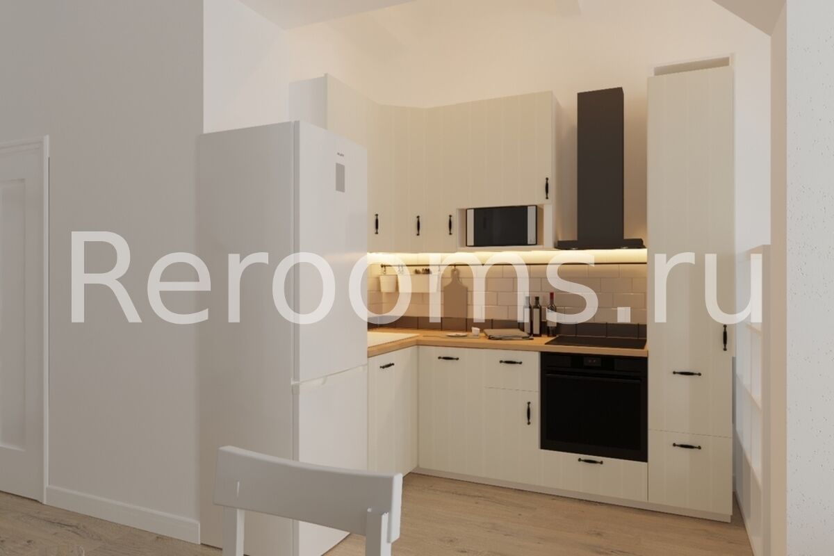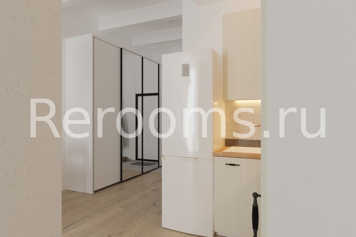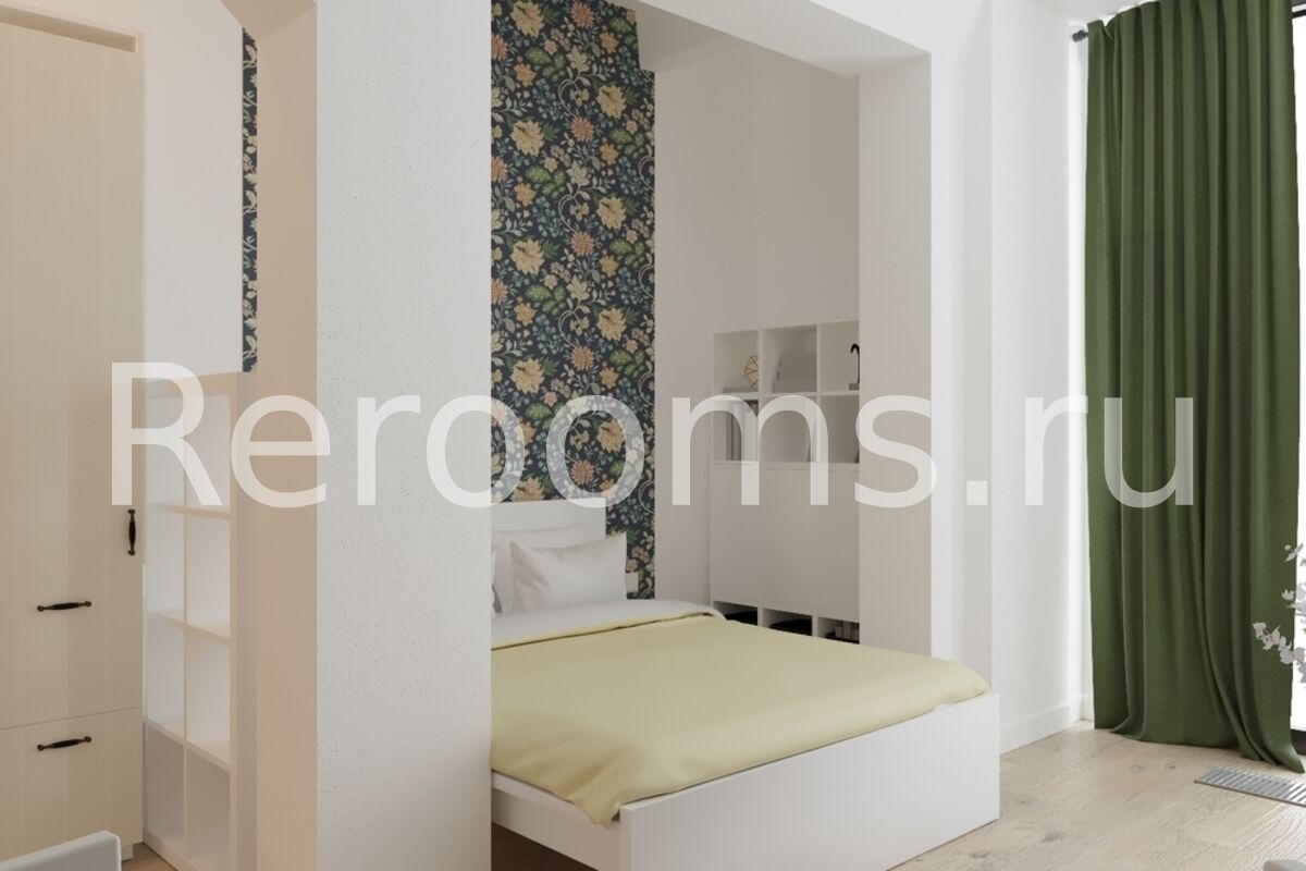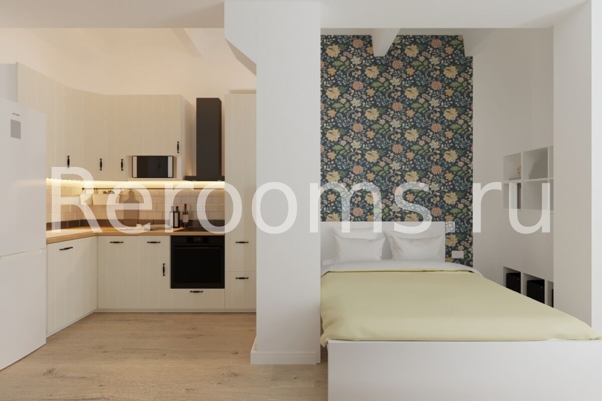 Дизайн-проект квартиры выполнен в современной сканди-стилистике. В качестве основного тона отделки выбрали типичный для этого направления белый цвет. Он визуально расширяет пространство и делает интерьер более просторным и светлым. Обеденную зону выделили при помощи цветочных обоев, а зону спальни отделили от кухни при помощи шкафа открытого типа. Функциональный кухонный гарнитур идеально вписан в пространство и полностью соответствует выбранной стилистике.