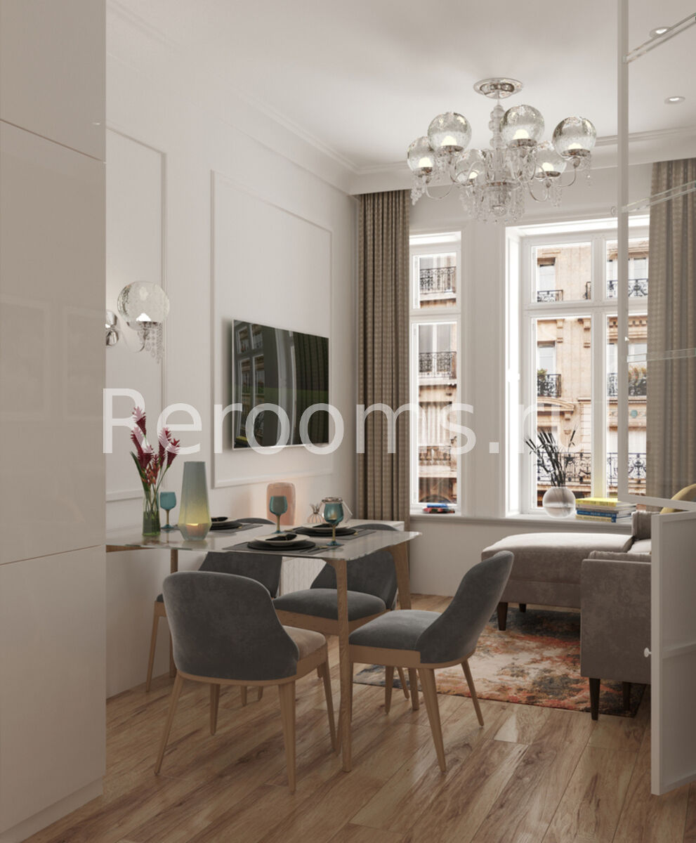 Интерьер этой двухкомнатной квартиры, выполненный в стиле арт-деко, отличается необычайным изяществом и легкостью. Строгие геометрические формы и четкие линии сочетаются с обилием дорогих текстур и декоративных элементов. Нейтральная цветовая гамма и эксклюзивные материалы полностью соответствуют концепции изысканного арт-деко.