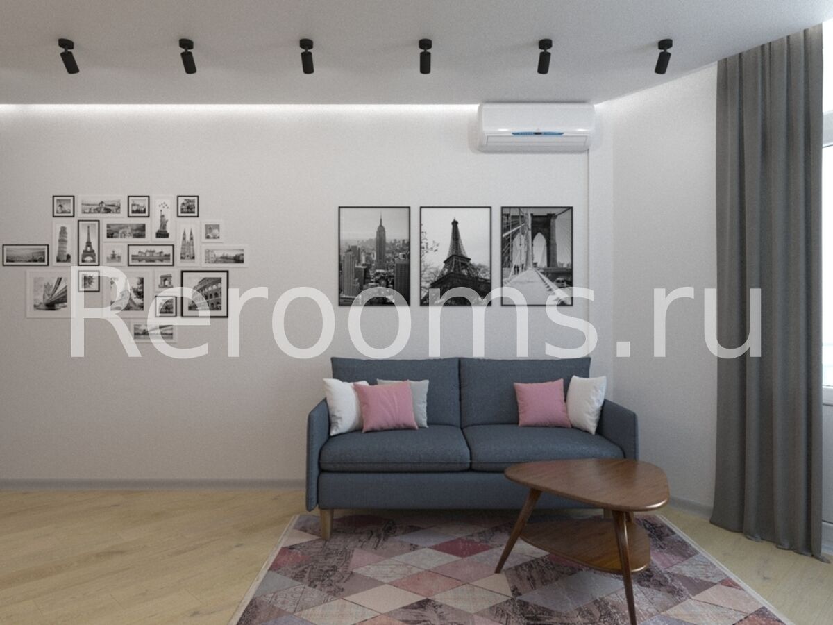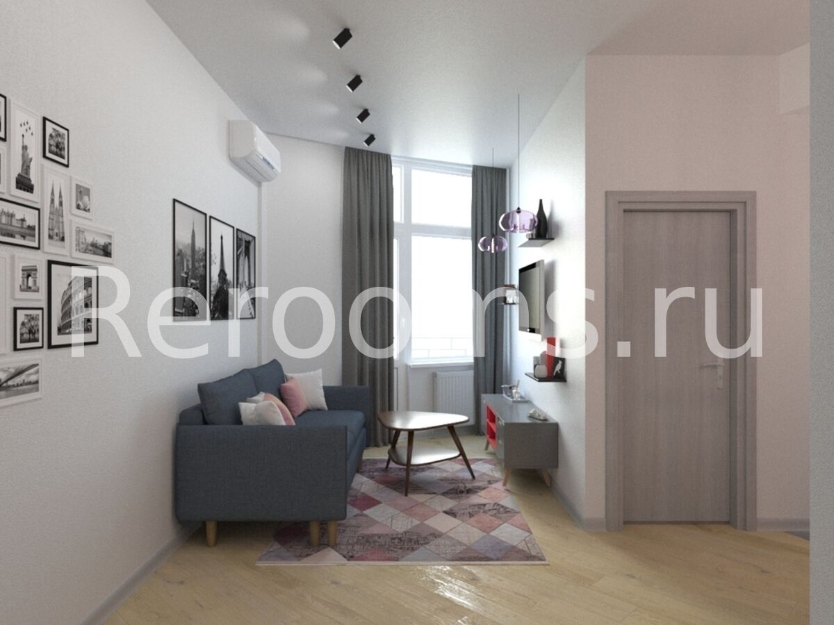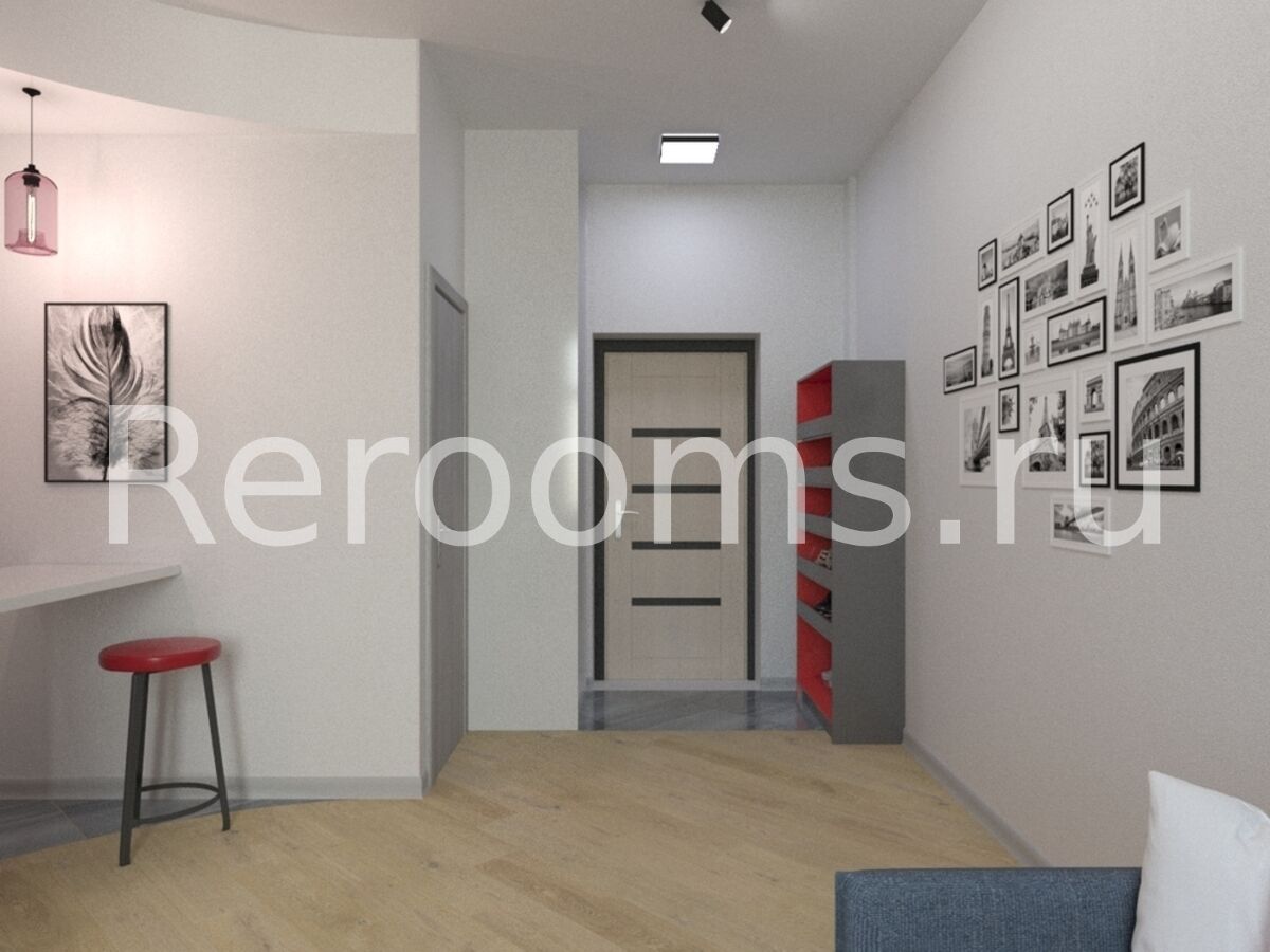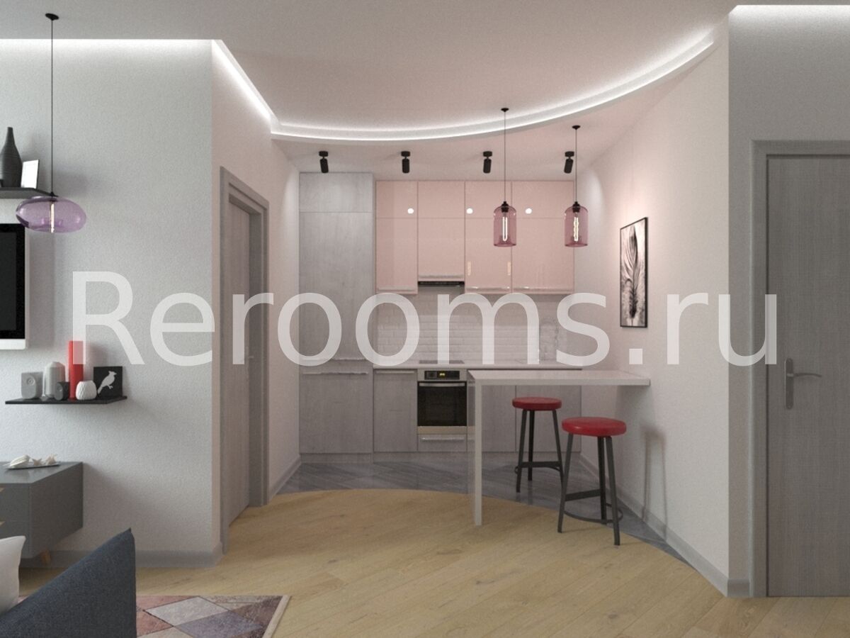 Проект этой однокомнатной квартиры с нестандартной планировкой дизайнеры выполнили в стиле модернизм. Интерьер получился достаточно неординарным и интересным. Единое пространство было разделено, в результате чего появилась отдельная комната, отведенная под спальню. В кухне вместо массивного стола установили удобную барную стойку, а в гостиной разместили небольшую лаунж-зону. Пространство решено в пастельных тонах с яркими акцентами.