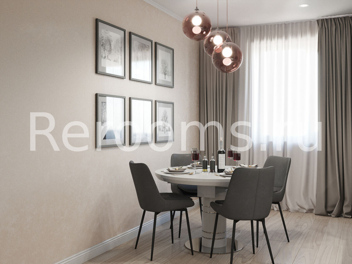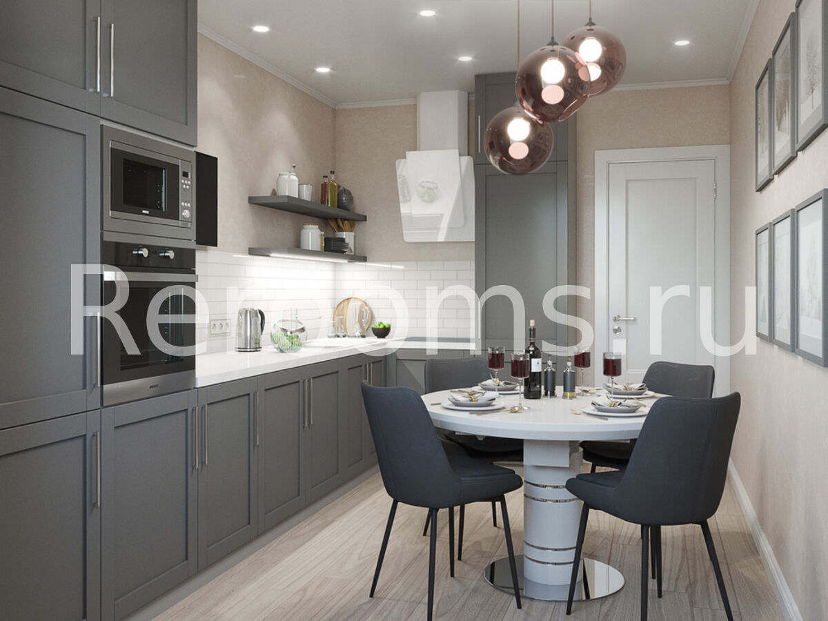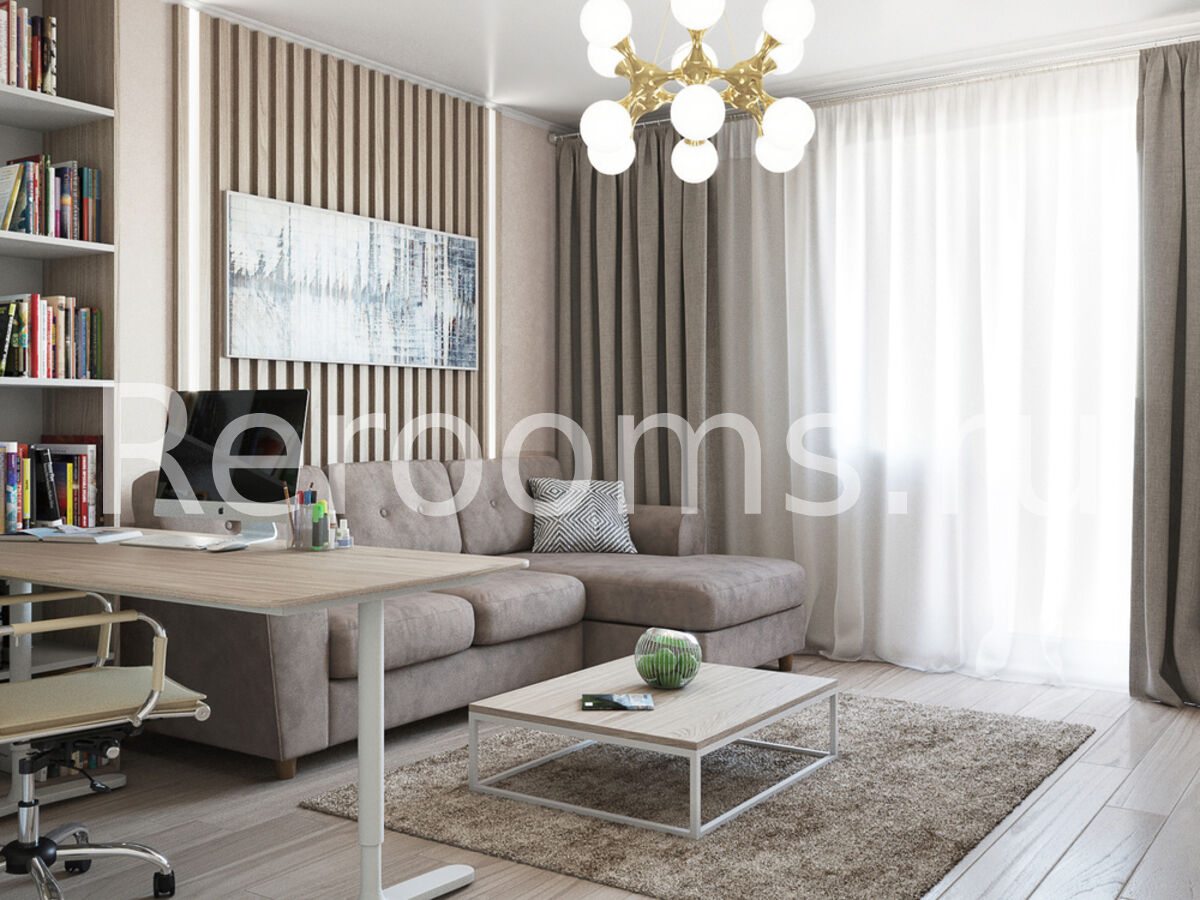 Проект этой двухкомнатной квартиры выполнен в стиле эклектика. Дизайнеры удачно объединили в одном интерьере черты, характерные для разных стилистических направлений. Здесь в рамках одного пространства гармонично сосуществуют модернизм и современная классика, стиль контемпорари и всеми любимый сканди. Благодаря такому яркому миксу интерьер выглядит очень интересно и современно. В отделке дизайнеры отдали предпочтение светлым нейтральным цветам. Так в гостиной и спальне мы видим различные оттенки бежевого, серого и древесного. Кухня отличается функционализмом: зона хранения сделана в нижних и в вертикальных шкафах.
