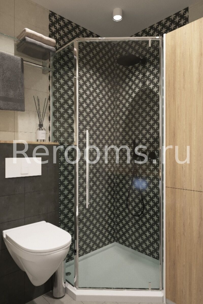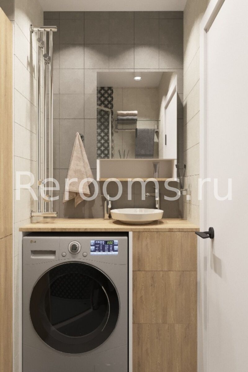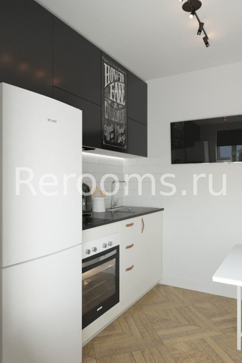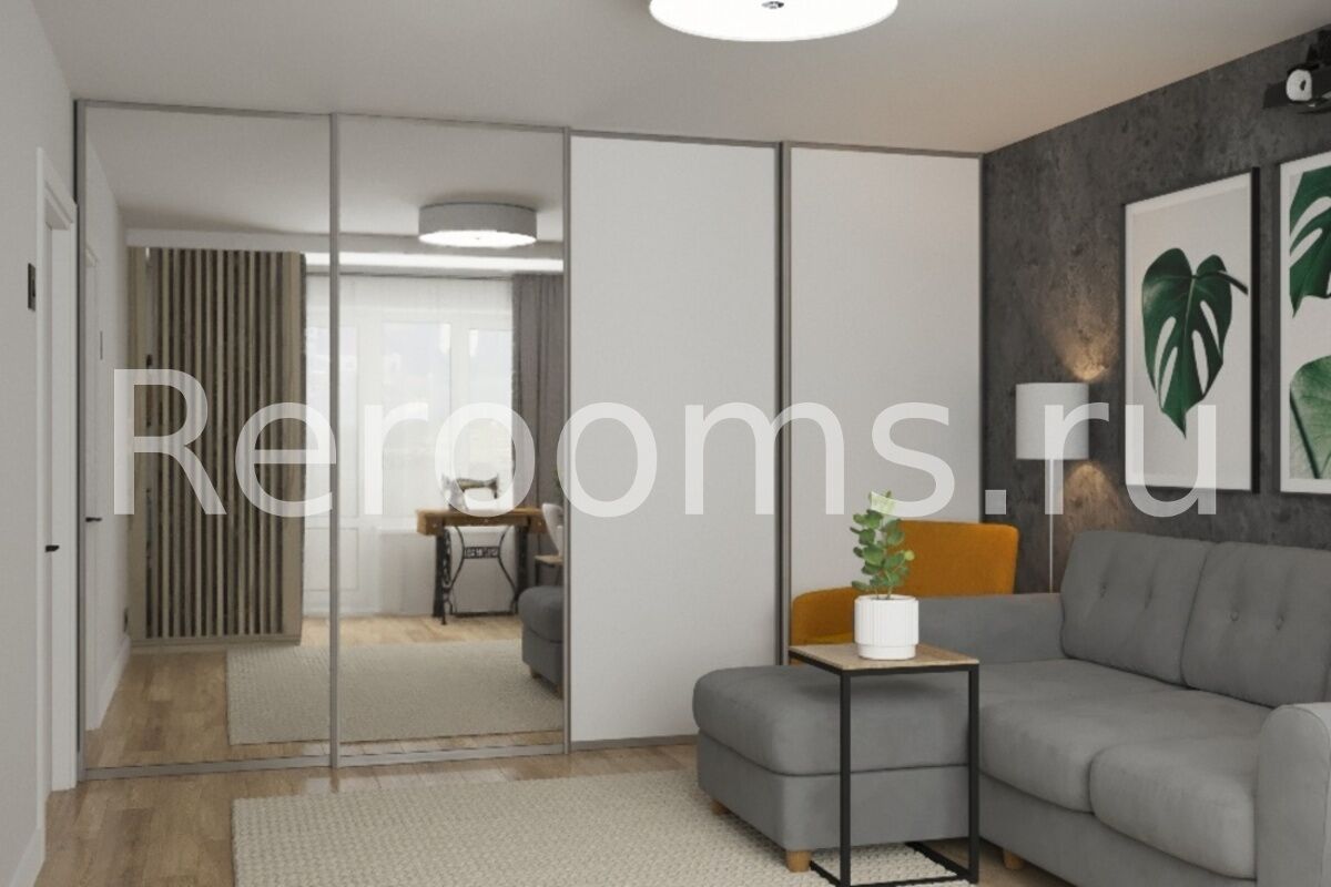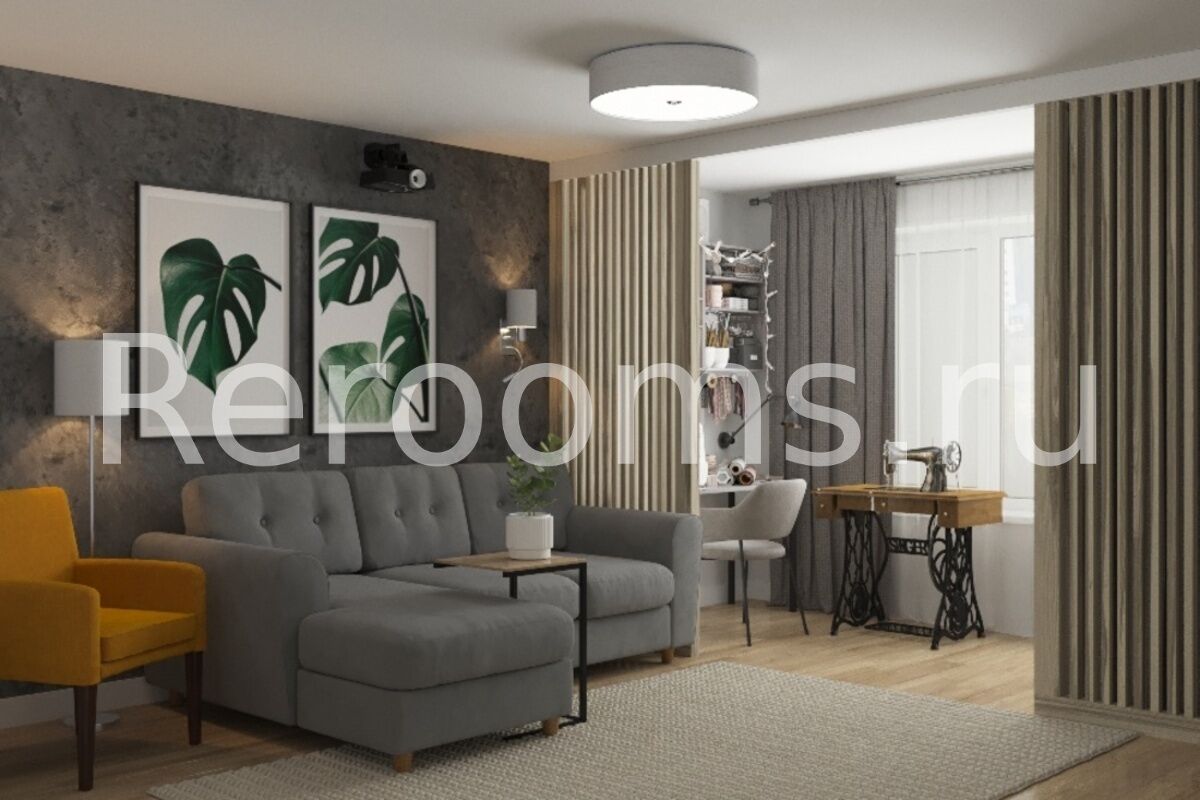 Интерьер этой однокомнатной квартиры выполнен в стиле лофт. Тон в помещении задают серый и белый цвета. Это отличная база, которая идеально сочетается с другими цветами. Пространство гостиной разделено на две функциональные зоны при помощи декоративных реек. Такой дизайнерский ход позволил организовать в помещении полноценный кабинет. Компактная кухня функциональна и эстетична. В целом, дизайн квартиры получился очень стильным и гармоничным.