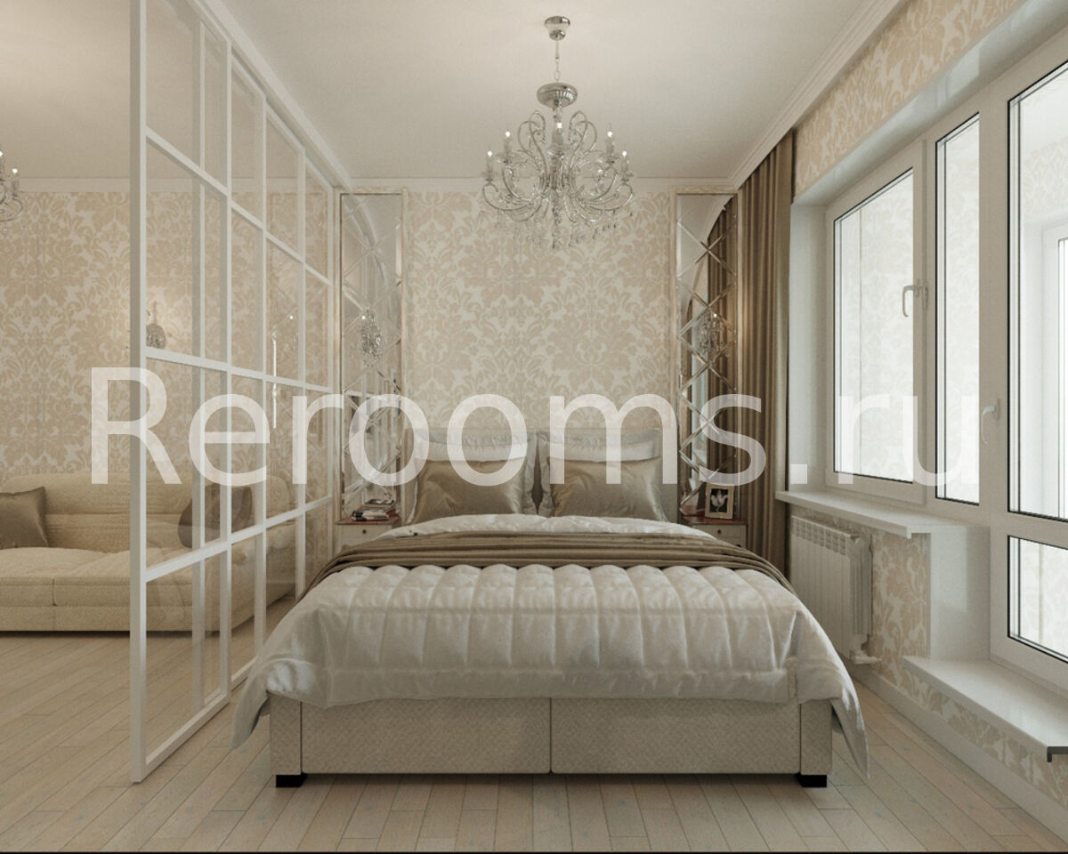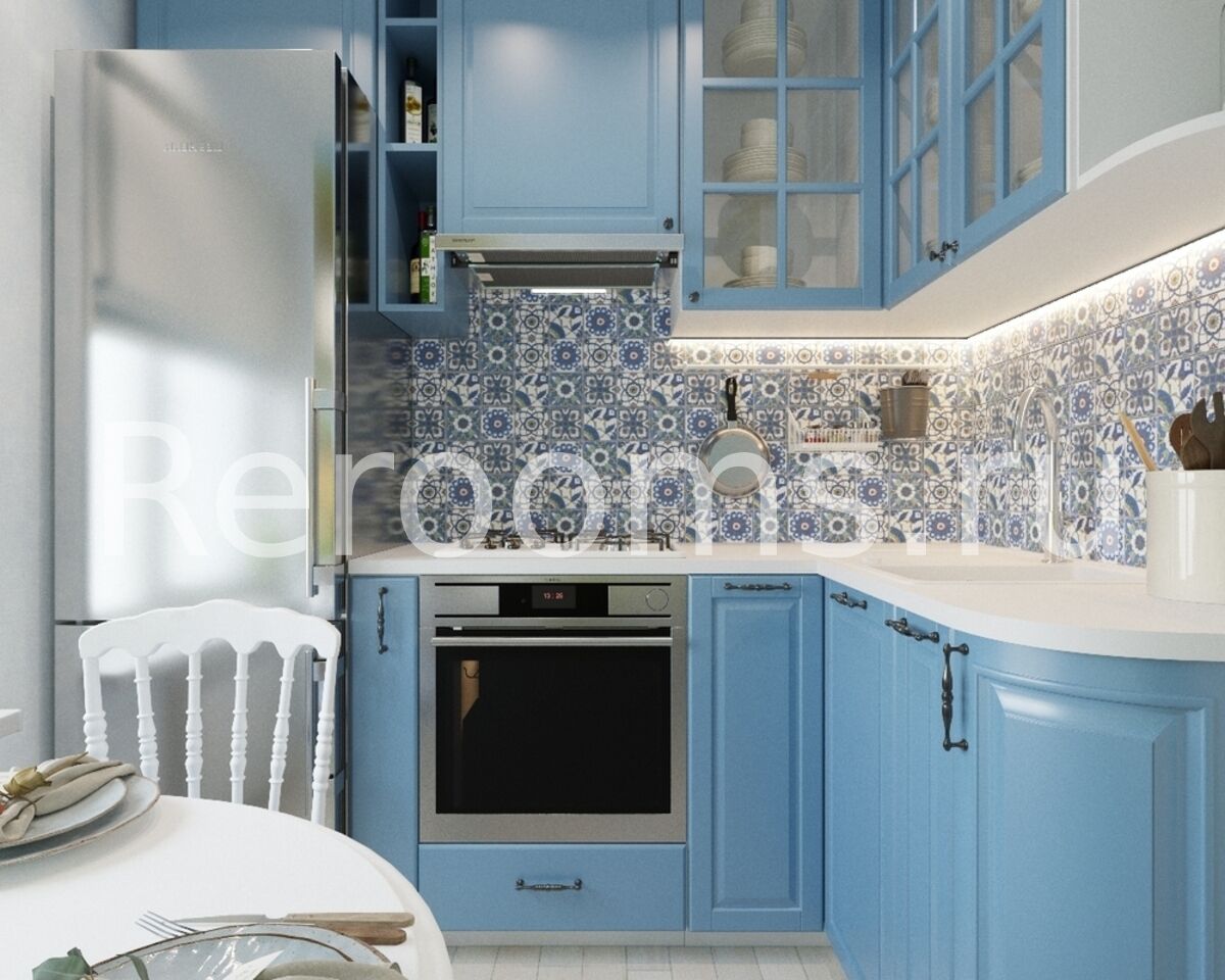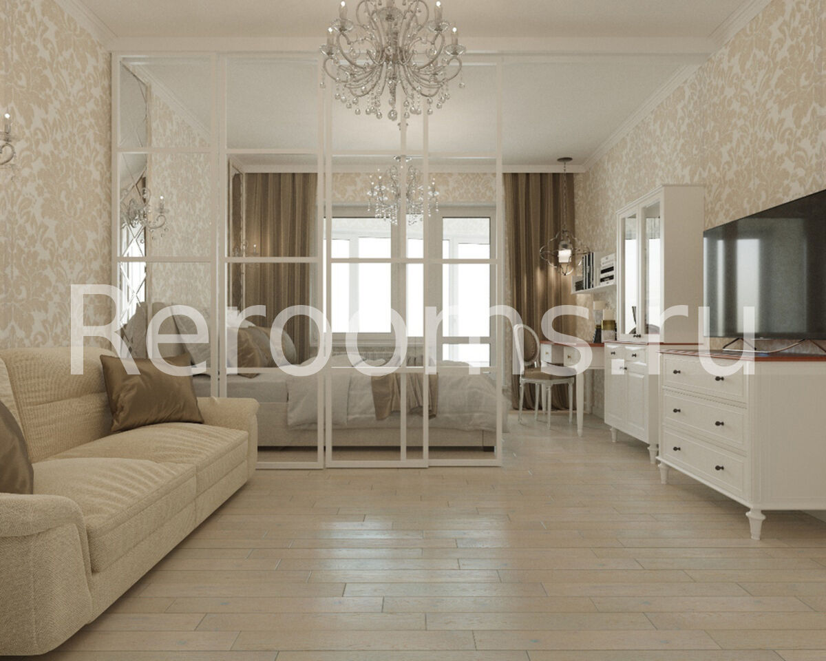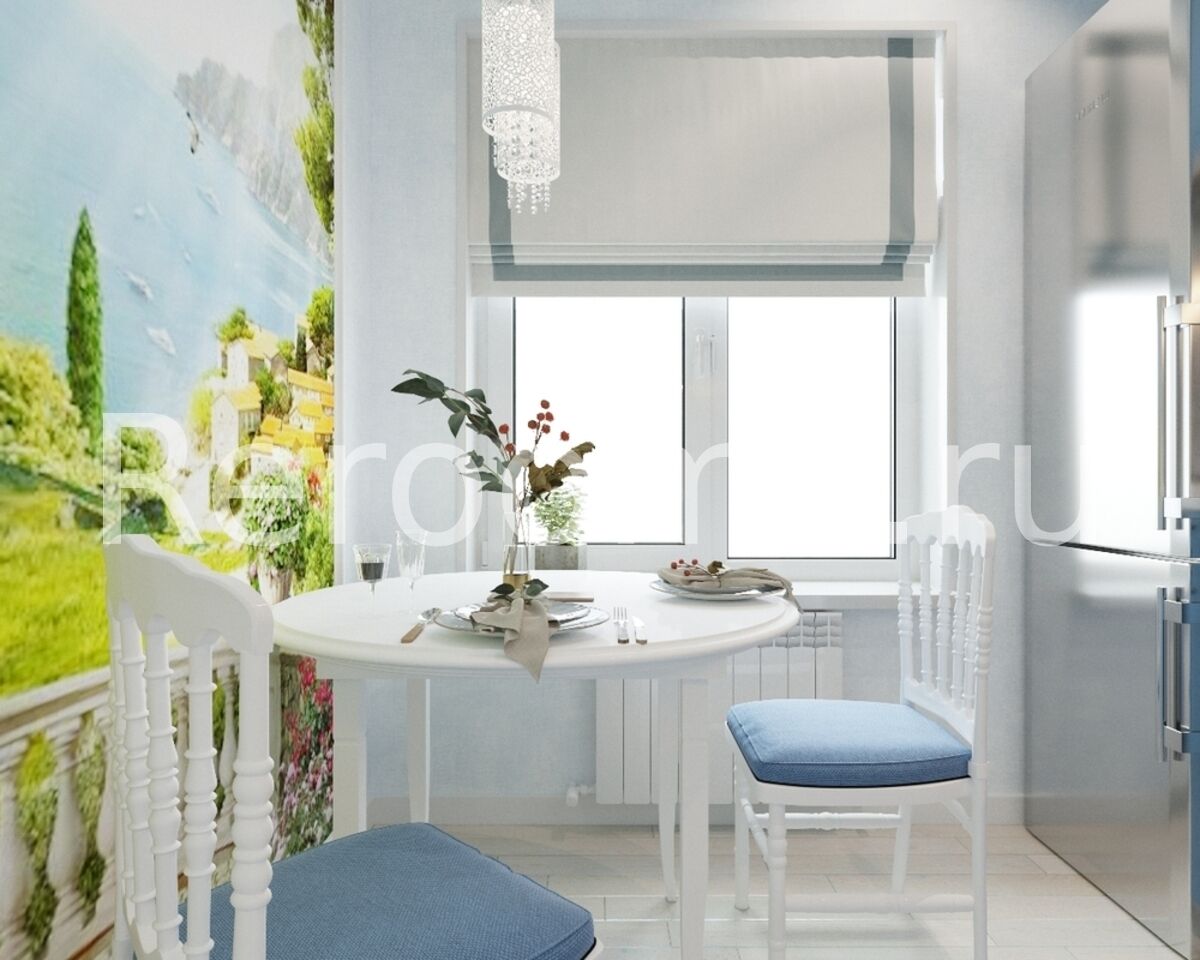 Интерьер этой однокомнатной квартиры - гармоничное сочетание элегантной американской классики и солнечного Прованса. Пространство комнаты поделено на две функциональные зоны - гостиной и спальни. Зонирование выполнено при помощи полупрозрачных раздвижных перегородок. Такой дизайнерский прием позволяет отделить одно помещение от другого, не утяжелив при этом пространство. В кухне царит атмосфера южного Прованса. Лаконичный гарнитур идеально вписали в пространство, оставив максимум свободного места. Акцентный элемент помещения - стена с изображением Средиземноморского побережья.