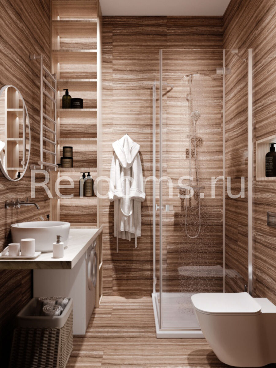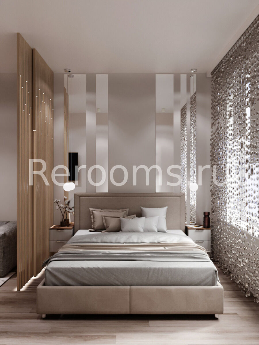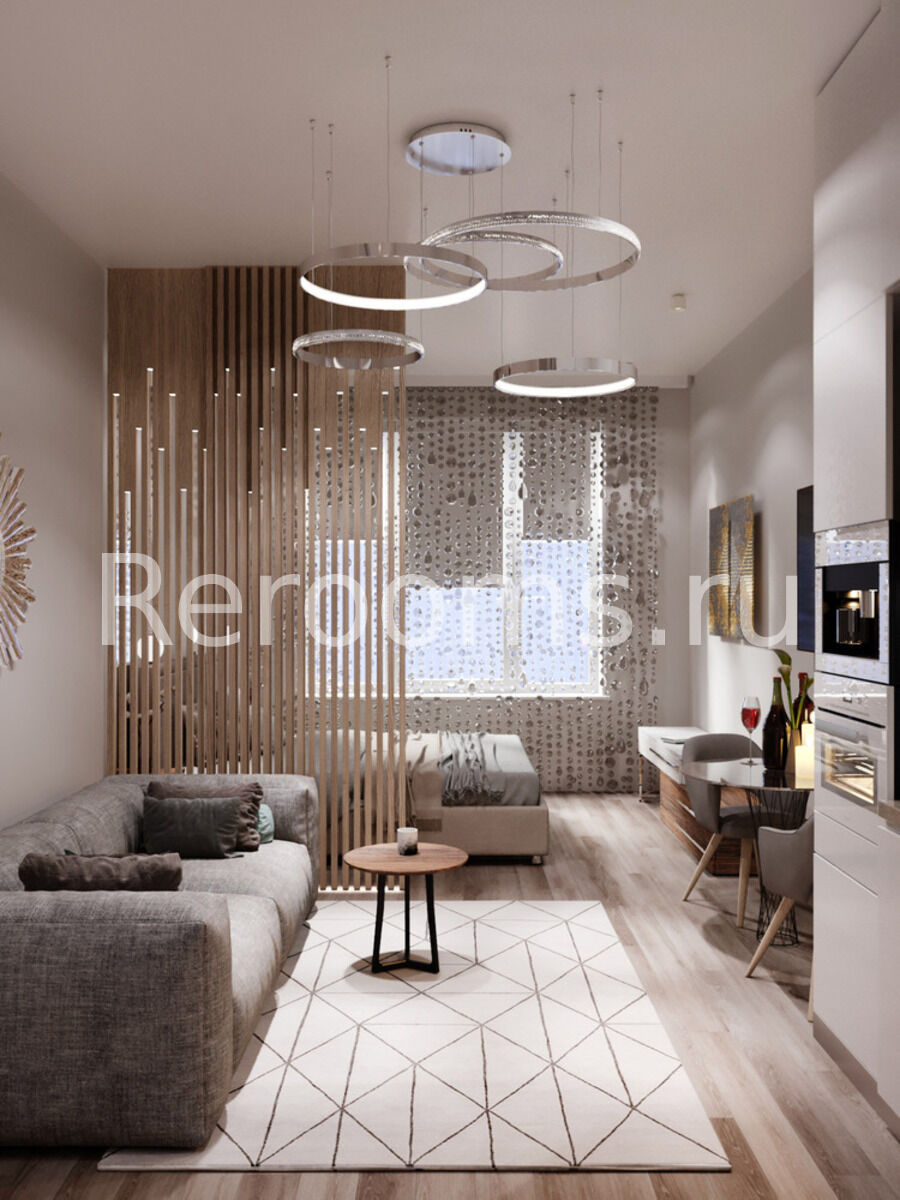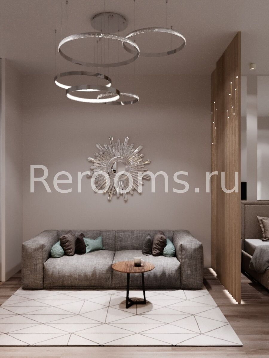Геометрия небольшого пространства этой квартиры-студии четко разграничена. Комната совмещает в себе сразу несколько функциональных зон - гостиной, кухни-столовой и спальни. Благодаря правильному разделению каждая из этих зон выглядит приватно и несет свою функциональную нагрузку. Тон в квартире задает красивый серо-кофейный цвет. Металлические поверхности светильников и декоративных элементов добавляют помещению торжественности и изящества.