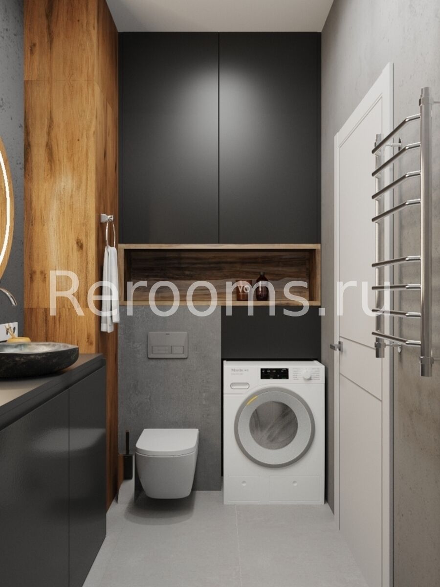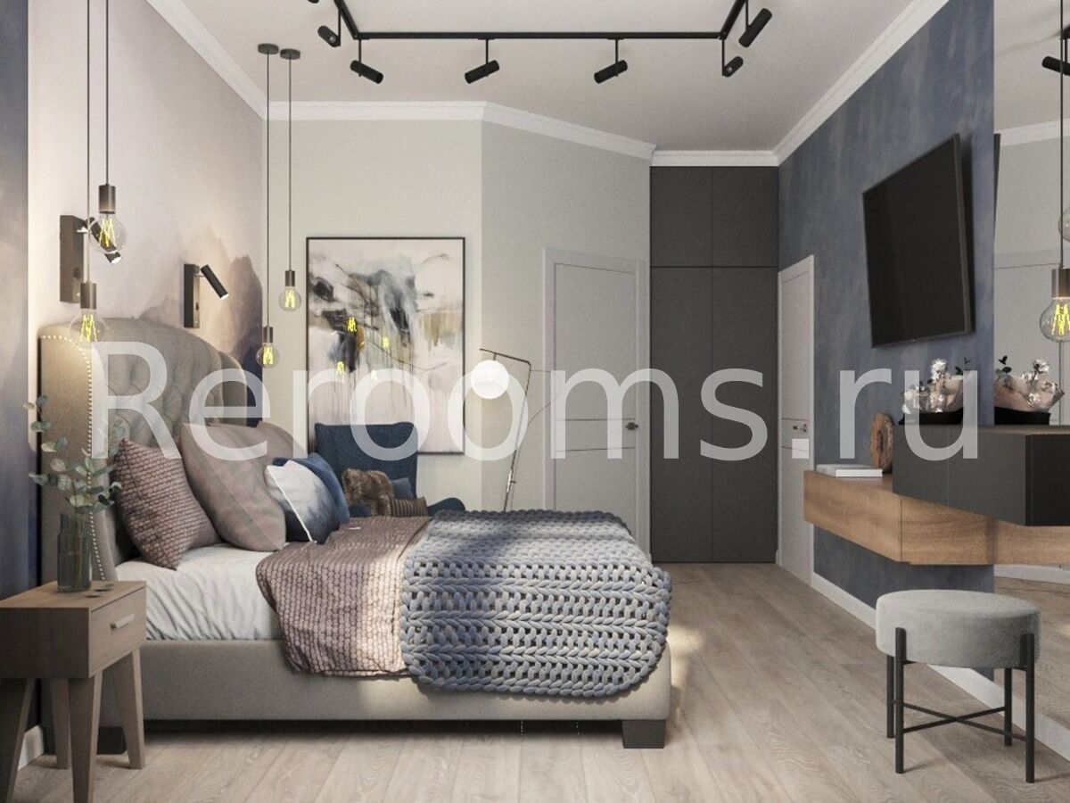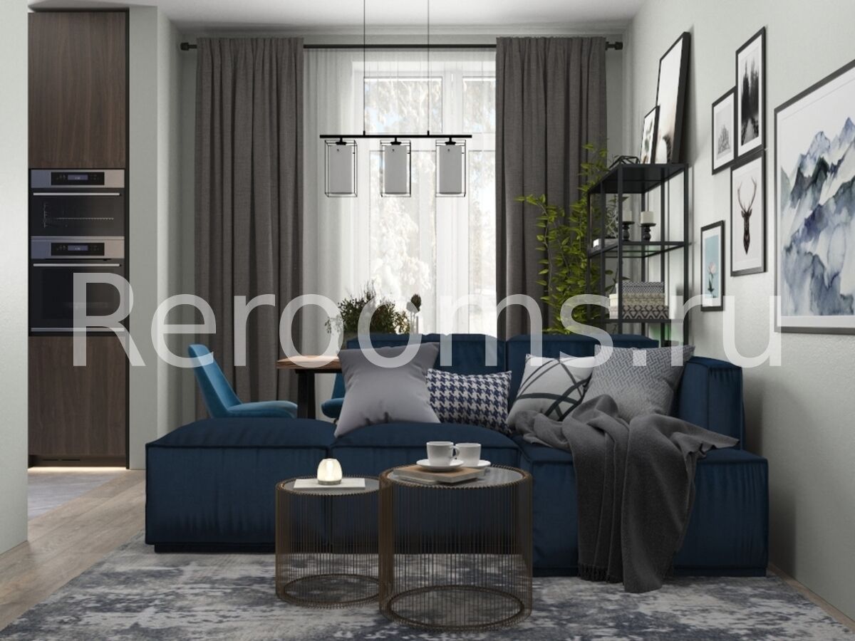 Разрабатывая проект этой квартиры, дизайнер руководствовалась основными принципами скандинавского стиля и стиля лофт, в результате чего получился современный, просторный и функциональный интерьер. В качестве основных тонов отделки и декора выбрали различные оттенки серого, графитовый и цвет светлого дерева. Пространство кухни и гостиной разделили стеной с открытым проемом, что визуально сделало эти зоны более приватными, но не изолированными друг от друга. В спальне возвели конструкцию полузакрытого подиума с подсветкой.