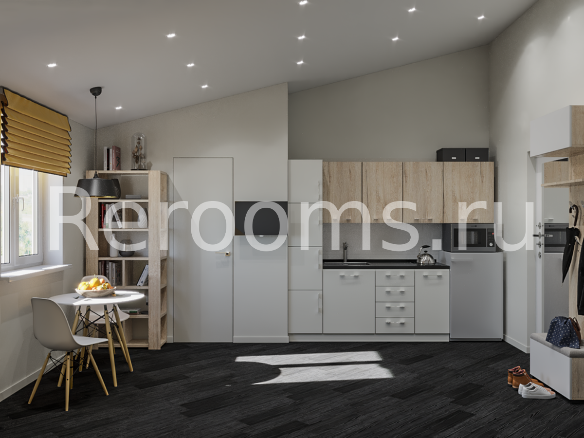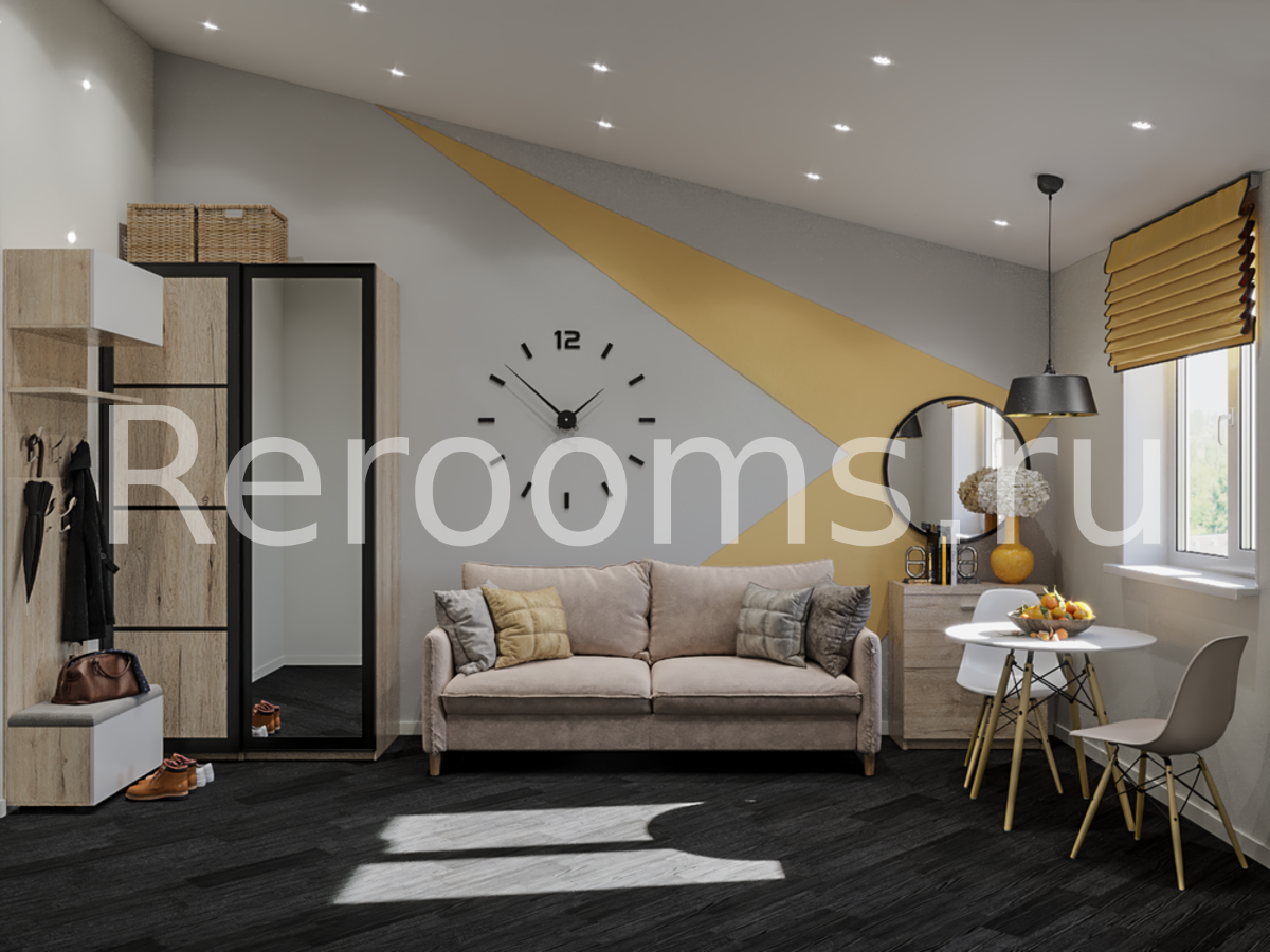 Эта небольшая квартира-студия выполнена в скандинавском стиле. Здесь в рамках одного помещения гармонично соседствуют гостиная и кухня с обеденной зоной. Все пространство квартиры выдержано в светлых тонах. Здесь главенствует серо-жемчужный, а в ансамбль к нему подобраны насыщенный желтый и коричневый цвета. Не смотря на маленькую площадь, помещение получилось достаточно функциональным и эстетически привлекательным.