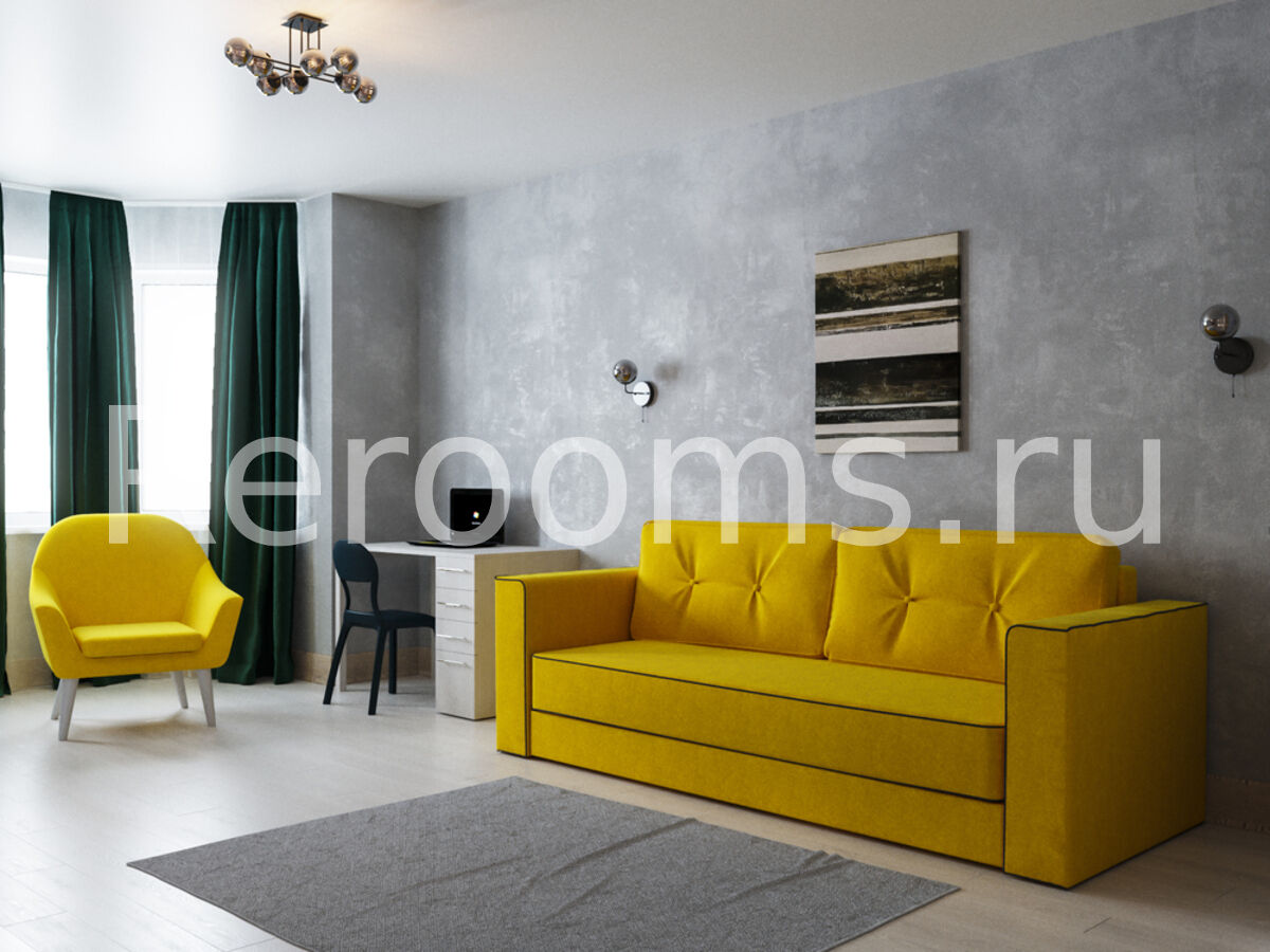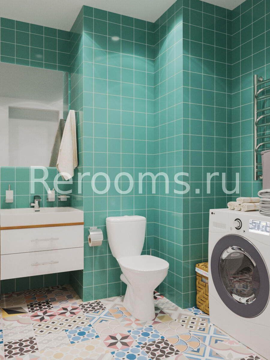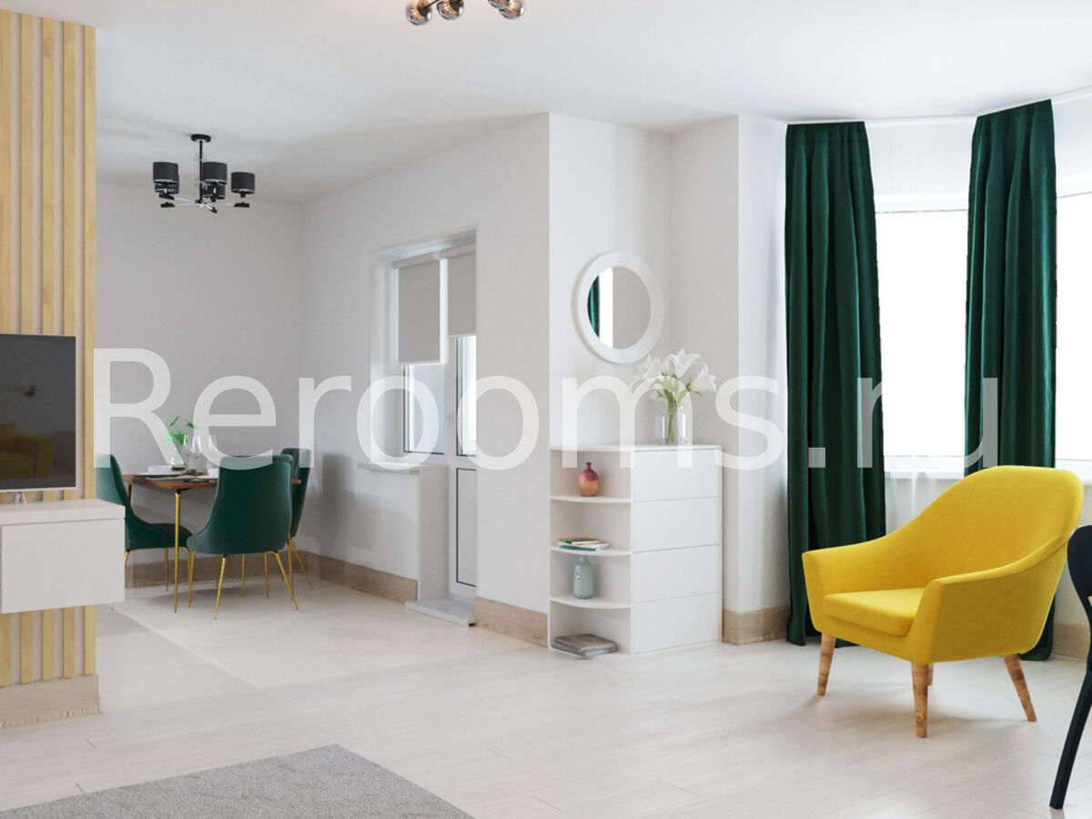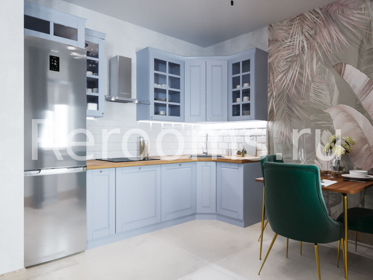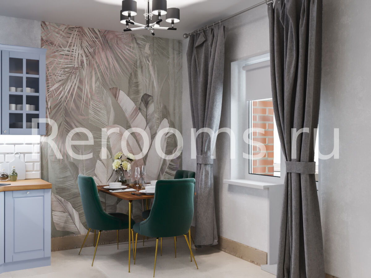 Дизайн-проект этой однокомнатной квартиры выполнен в современном стиле модернизм. На небольшой площади удалось разместить функциональную кухню, удобную гостиную и рабочую зону. Часть комнаты отделили от кухни стеной с декоративными рейками, а часть оставили открытой. Такой прием позволил сделать эти помещения более приватными, не утяжелив при этом пространство. Акцентным элементом в кухне является стена с флористическим декором. В цветовом решении остановились на светлой гамме, но разбавили ее яркими цветами.