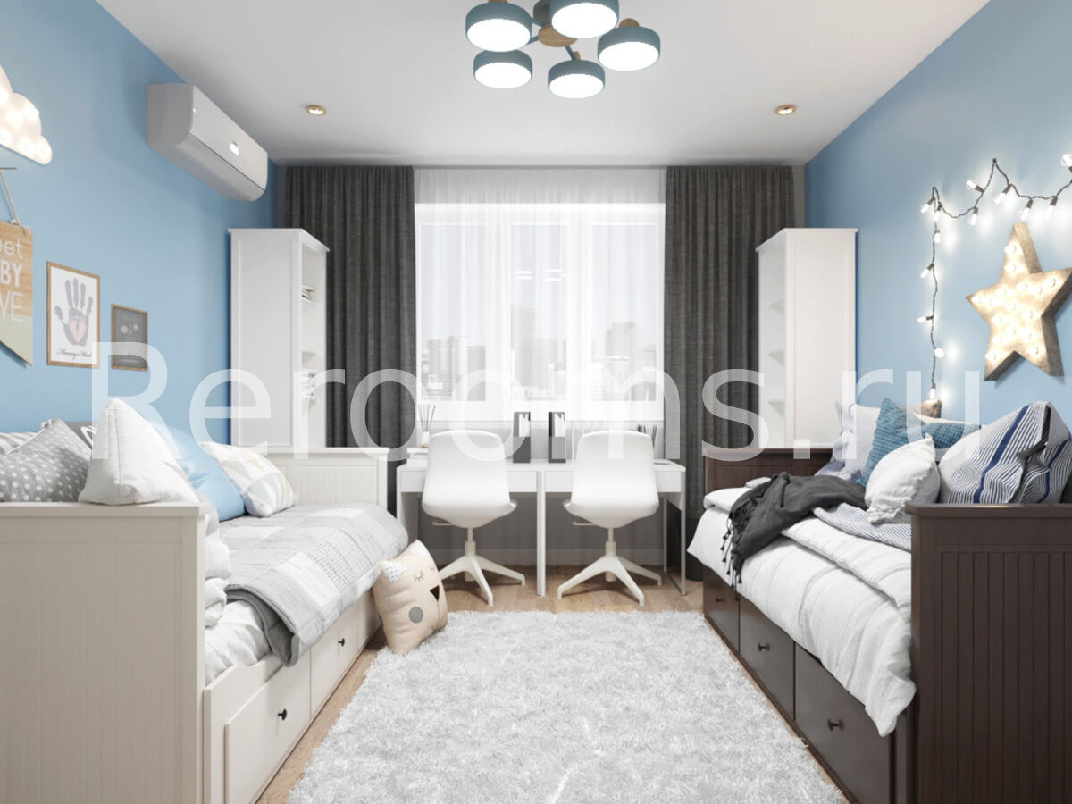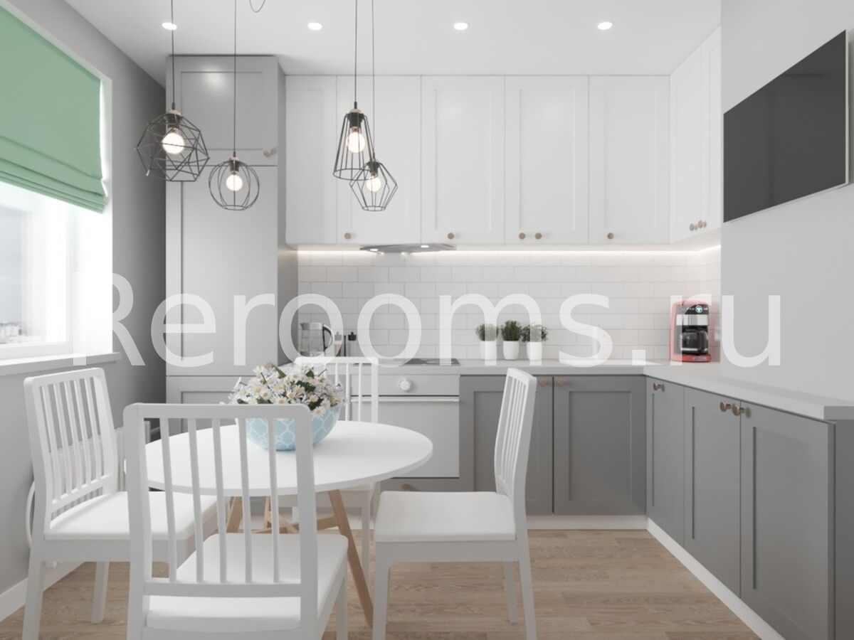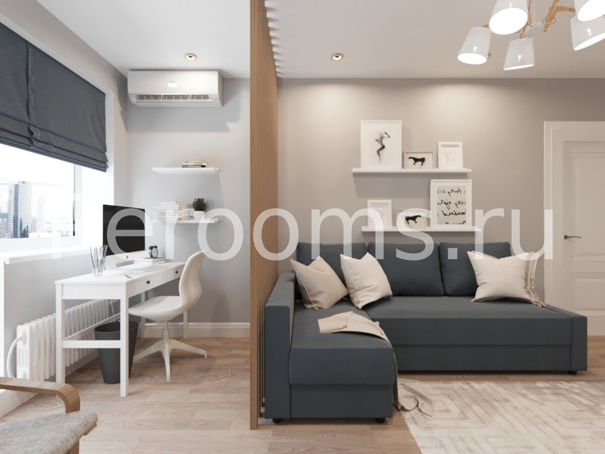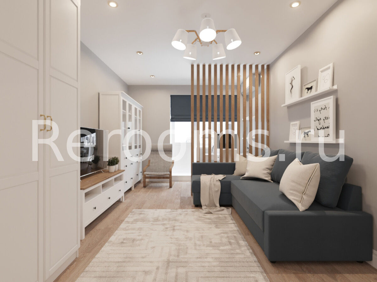 Разрабатывая проект этой двухкомнатной квартиры, дизайнеры руководствовались основными правилами скандинавского стиля. Интерьер нужно было сделать максимально просторным, уютным и функциональным. В качестве основных тонов отделки выбрали типичные для сканди-стиля серый, белый и цвет натурального дерева. Гостиную разделили на две зоны при помощи деревянных реек, благодаря чему получилось отдельное приватное помещение, которое отвели под рабочий кабинет. На кухне функциональный гарнитур идеально вписан в пространство и полностью соответствует выбранной стилистике. Детская комната, рассчитанная на двух детей, отличается удобством и эстетическим видом.