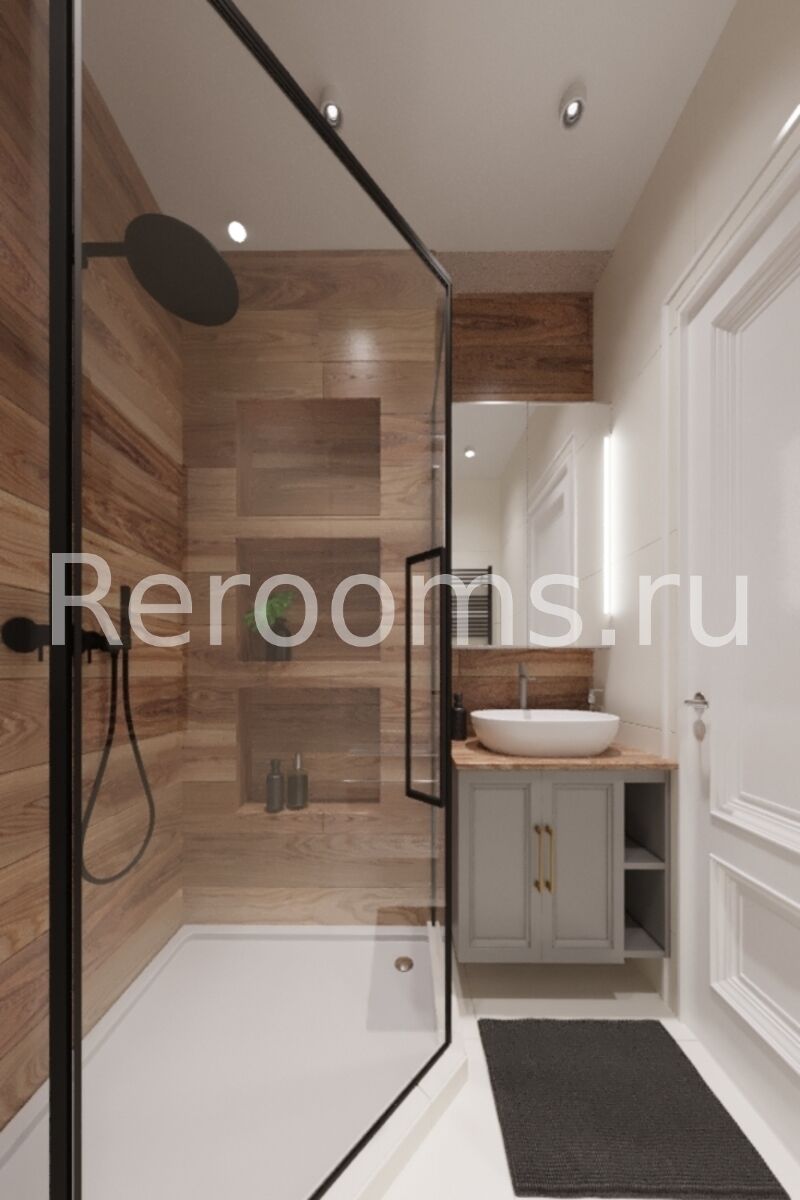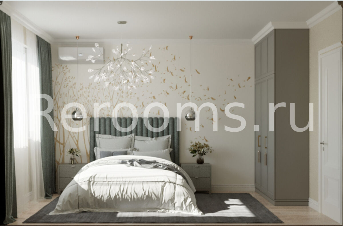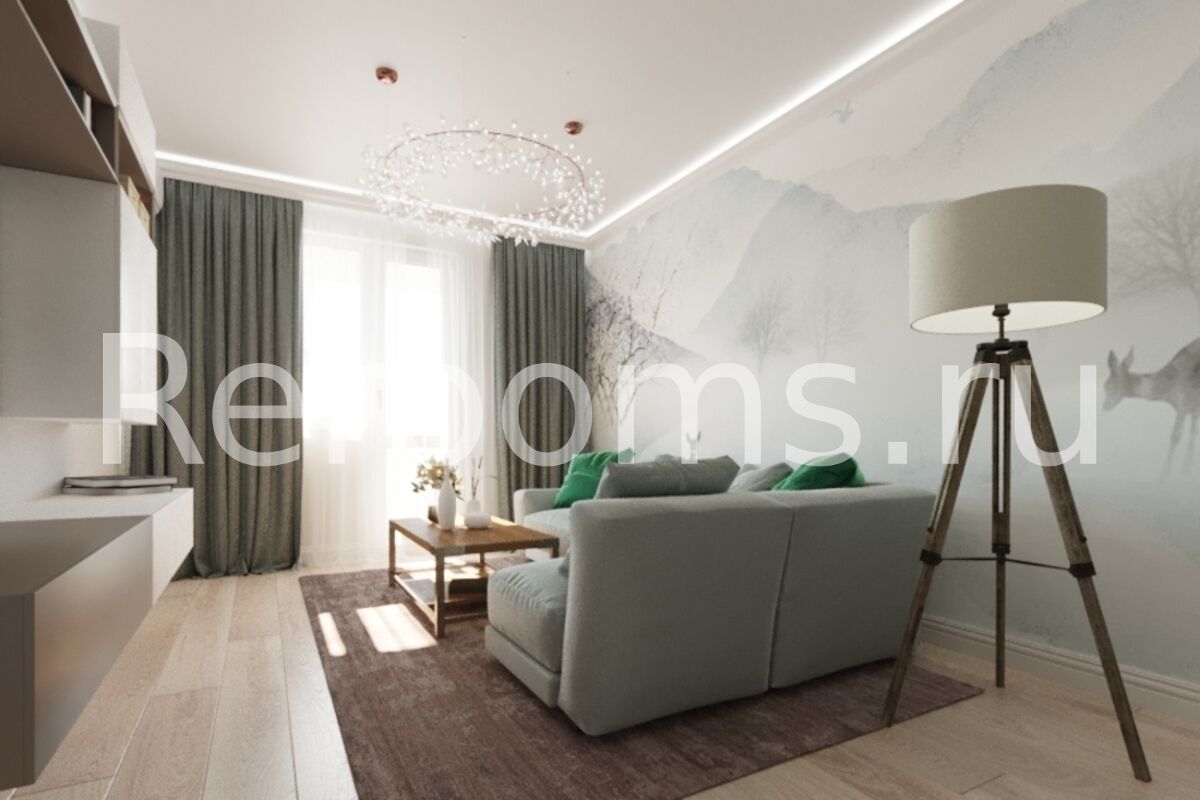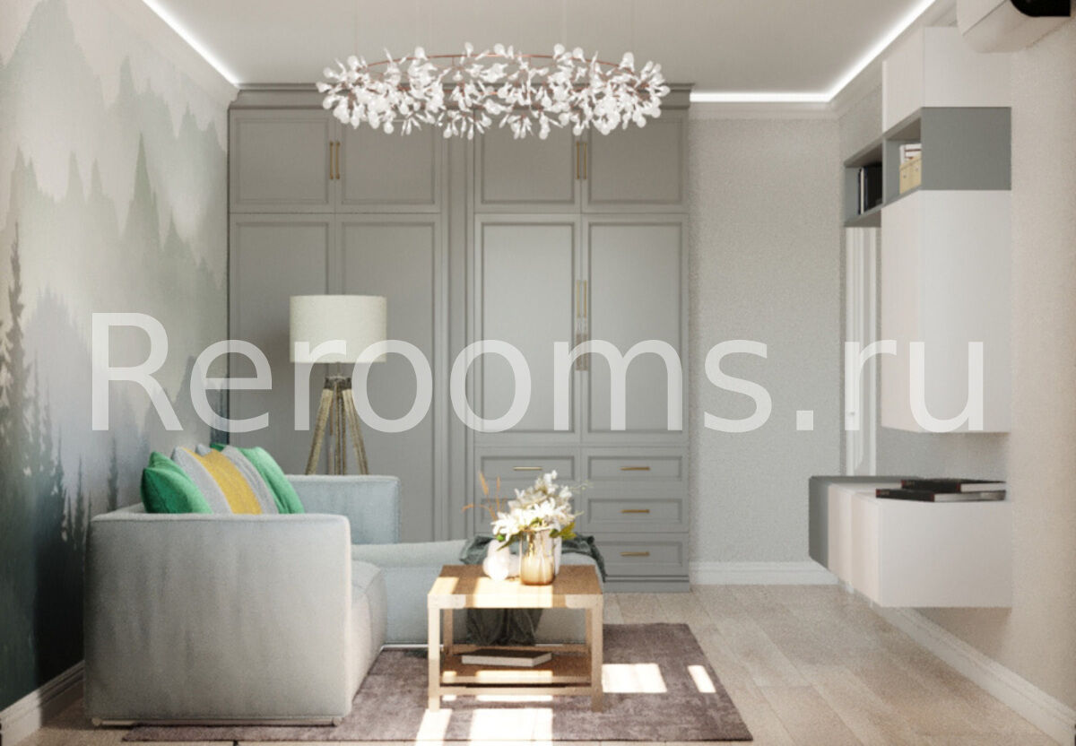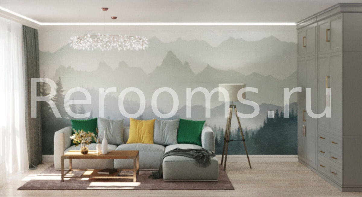 Дизайн-проект этой двухкомнатной квартиры выполнен в современном стиле. В интерьере гармонично сочетаются элементы модернизма и всеми любимого сканди. В цветовом отношении помещение выдержано в серых тонах с яркими цветовыми акцентами. Особое внимание в гостиной привлекает стена с декоративным принтом. Он придает пространству дополнительную глубину и объем.