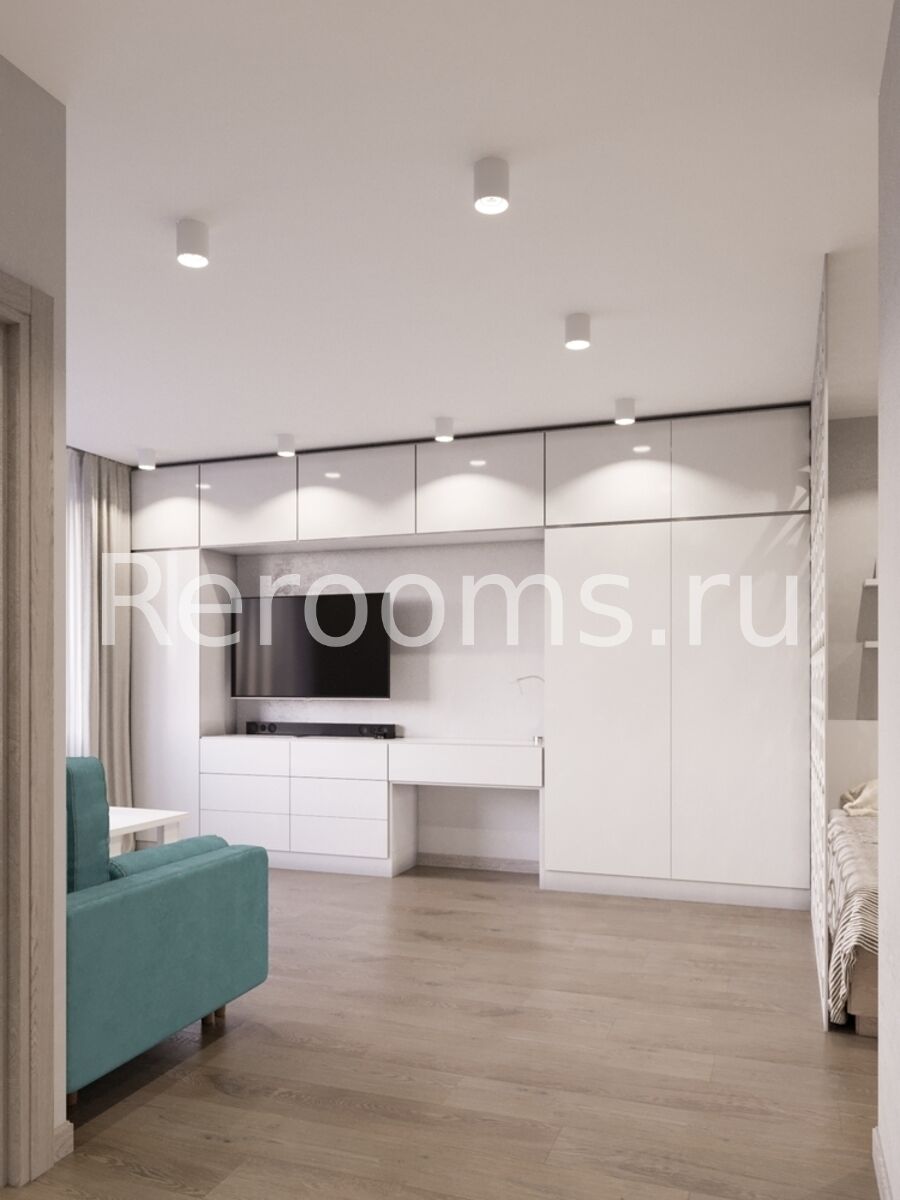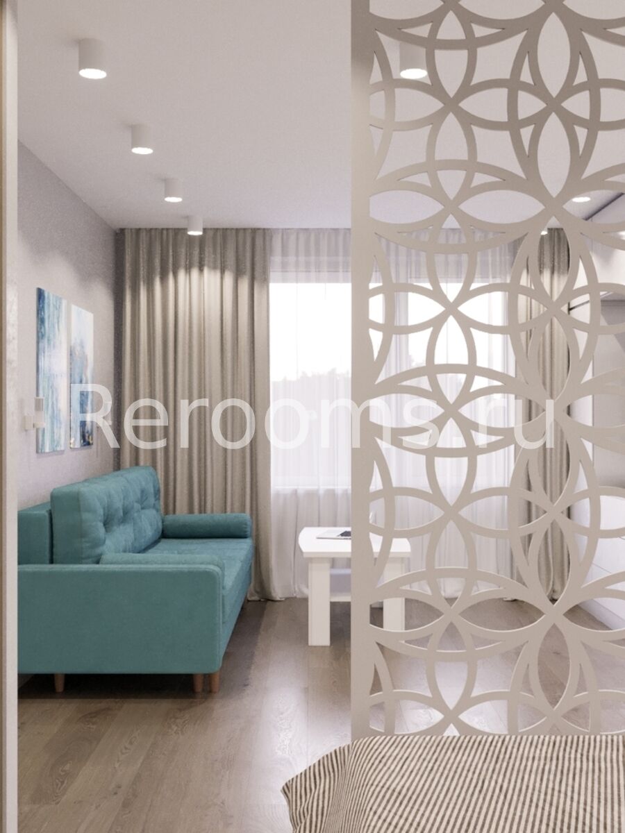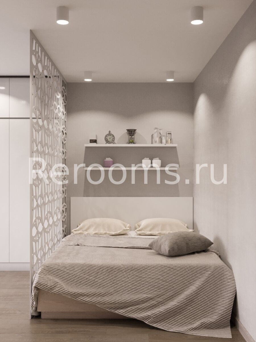 Дизайн-проект этой квартиры выполнен в стиле минимализм. Светлые тона, лаконичные линии и простые архитектурные формы создают в интерьере ощущение простора и свободы. Здесь нет ничего лишнего и каждый предмет идеально вписан в пространство. Зонирование помещения выполнили при помощи ажурной перегородки. Она отделила спальную зону от гостиной и стала изящным элементом декора. Особое место в квартире отведено свету. Разноплановые светильники наполняют ее мягким светом и формируют атмосферу чистоты и уюта.