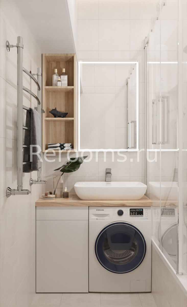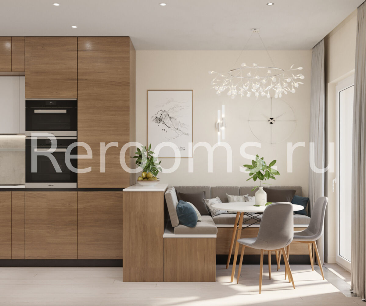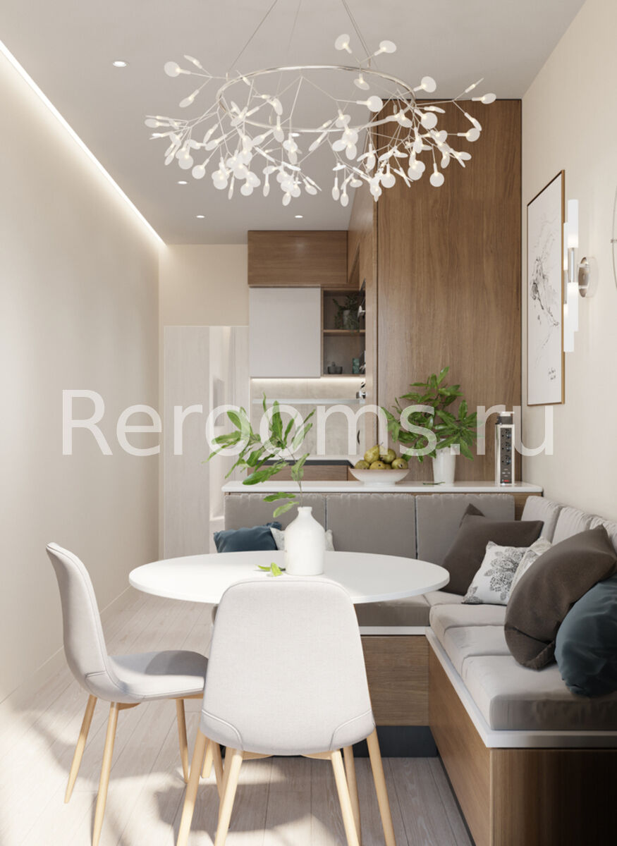 Проект двухкомнатной квартиры выполнен в модном стиле модернизм. Геометрия небольшого пространства четко разделена. Одна из комнат совмещает в себе две функциональные зоны - гостиной и кухни. Зону приготовления пищи отделили от основного помещения мебельным гарнитуром. Благодаря такому дизайнерскому приему оба пространство выглядит гармонично и целостно. Детская комната получилась очень функциональной и современной. Тон в квартире задают спокойные цвета - белый, серый и различные оттенки бежевого.