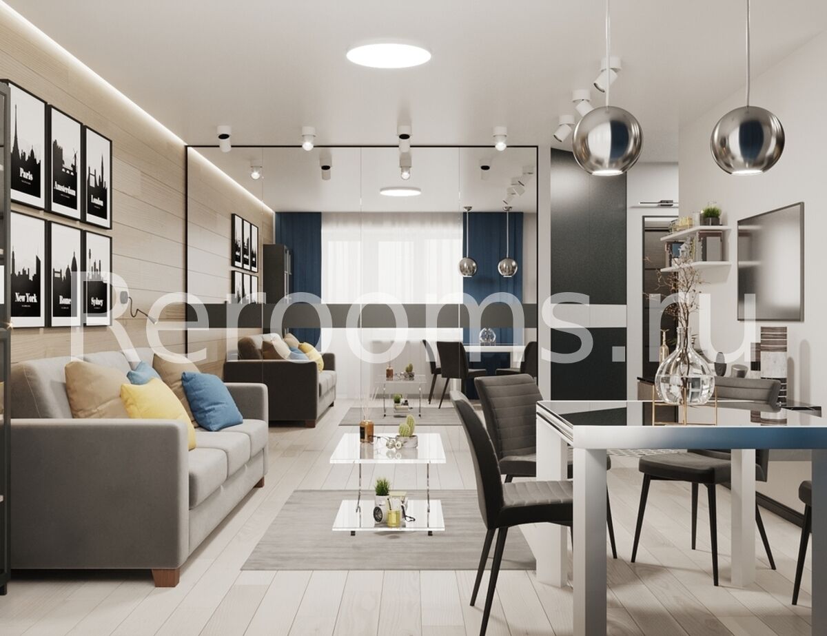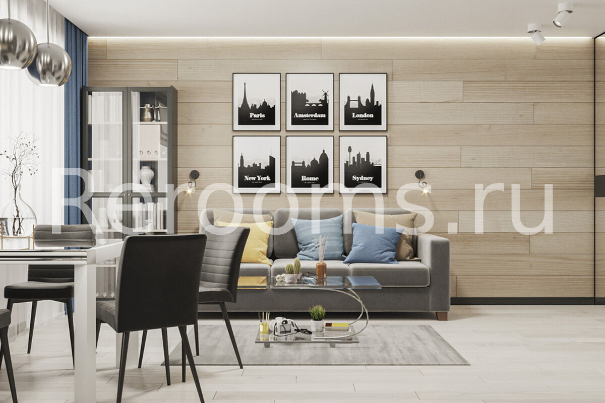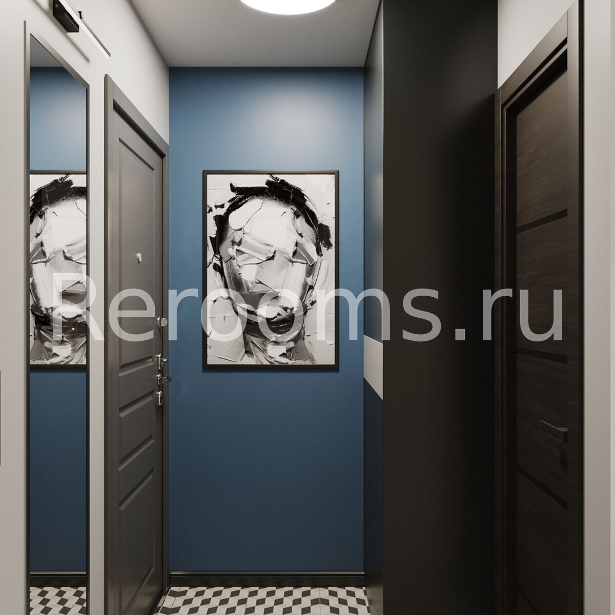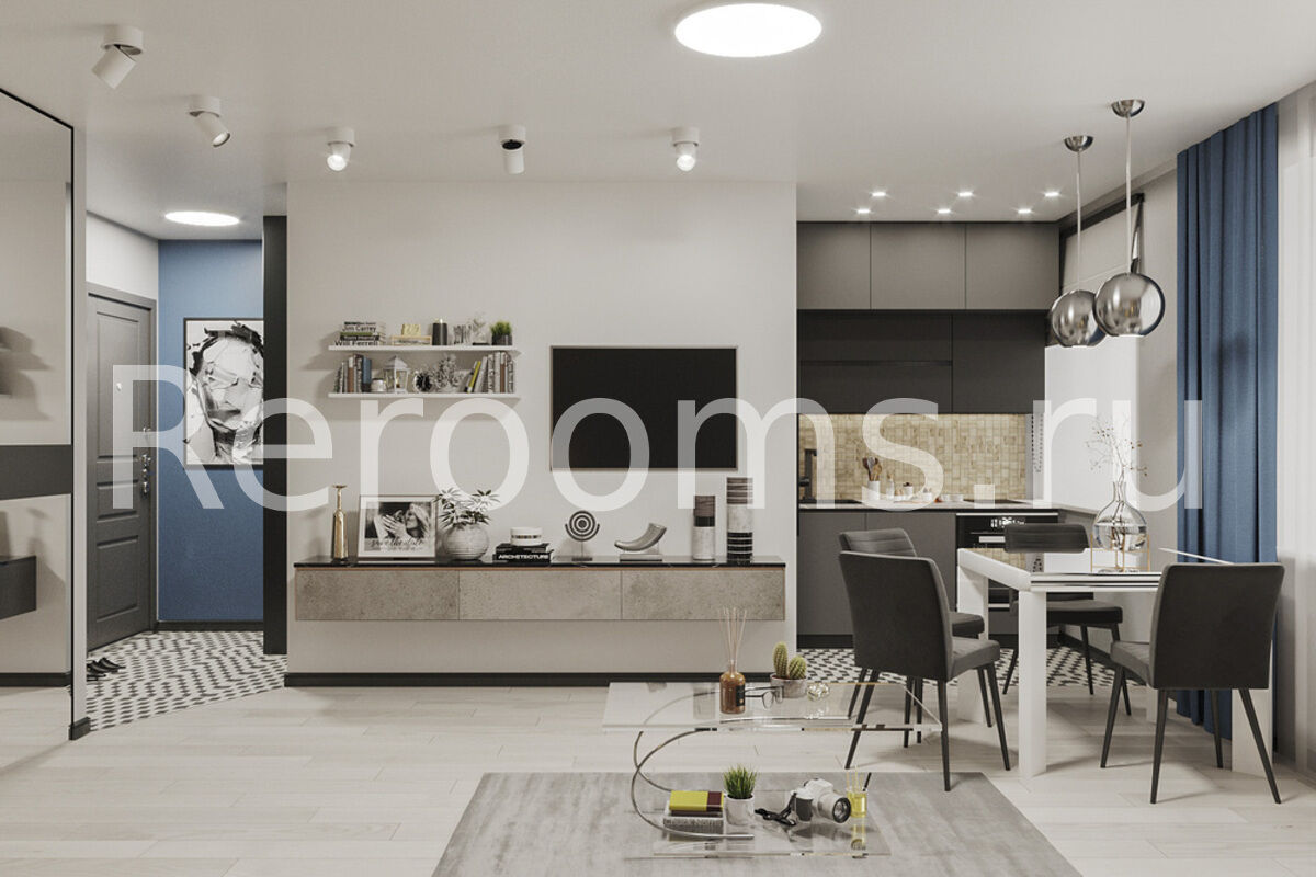 Дизайн-проект этой однокомнатной квартиры выполнен в стиле модернизм. В результате интерьер получился необычайно удобным и эргономичным. Все предметы сочетаются друг с другом и в полной мере отражают специфику стиля. Спокойная цветовая гамма с преобладанием бежевого, белого и акцентного синего создает в помещении атмосферу спокойствия и умиротворения.