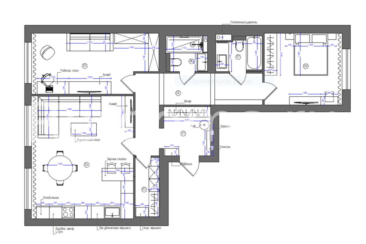 Дизайн-проект трехкомнатной квартиры выполнен в стиле модернизм. Четкая геометрия пространства, интересные архитектурные формы, обилие разнообразных текстур, современные элементы декора в интерьере этой квартиры смотрятся необычайно гармонично и целостно. Разноплановое освещение придает пространству индивидуальный характер, а конрастная цветовая гамма делает его стильным и уникальным.