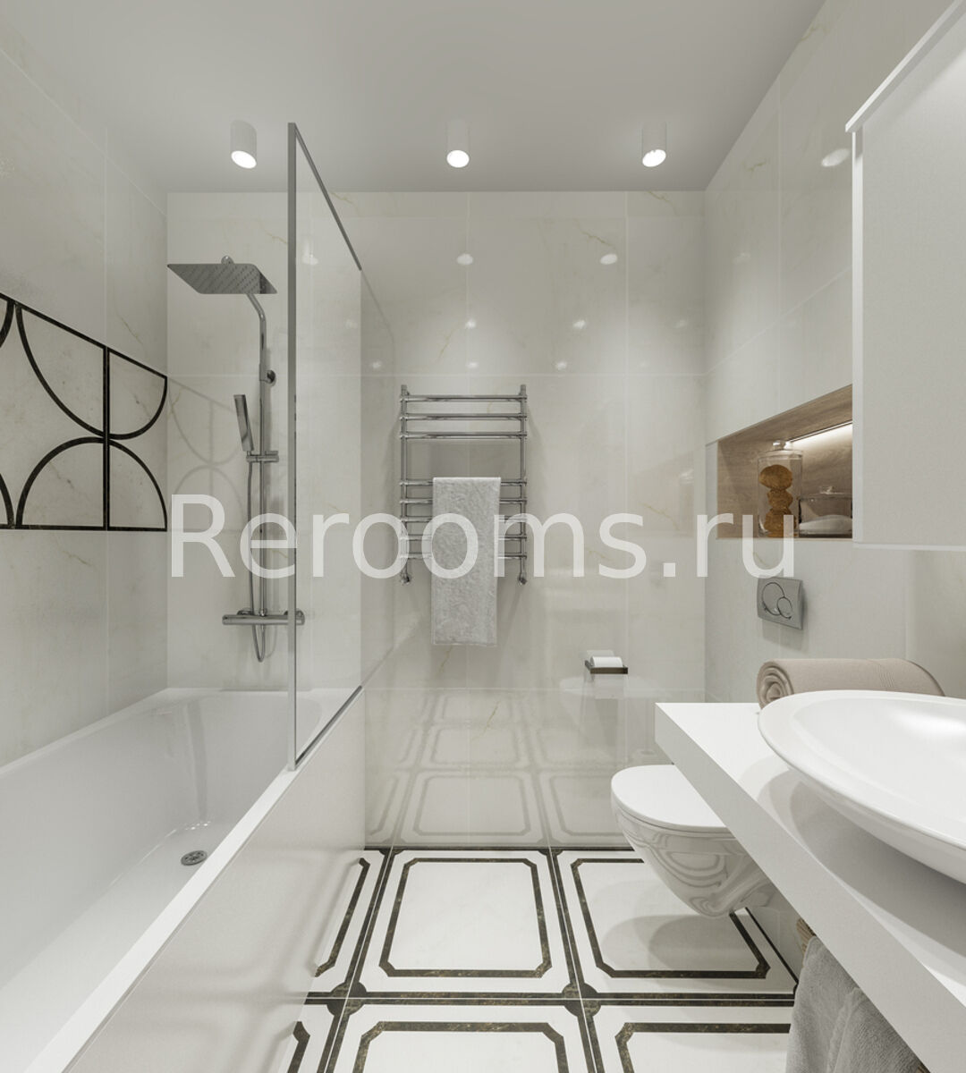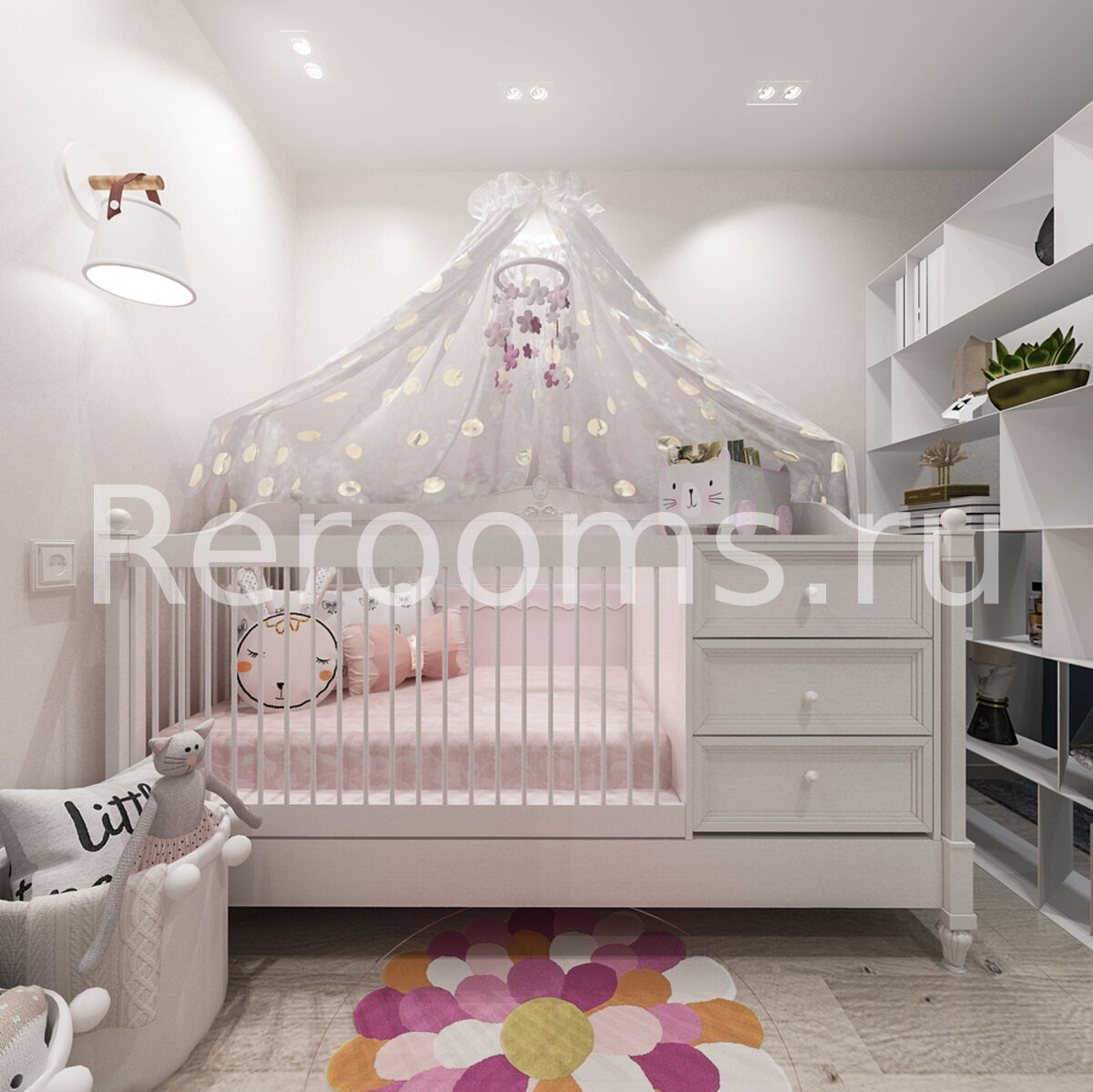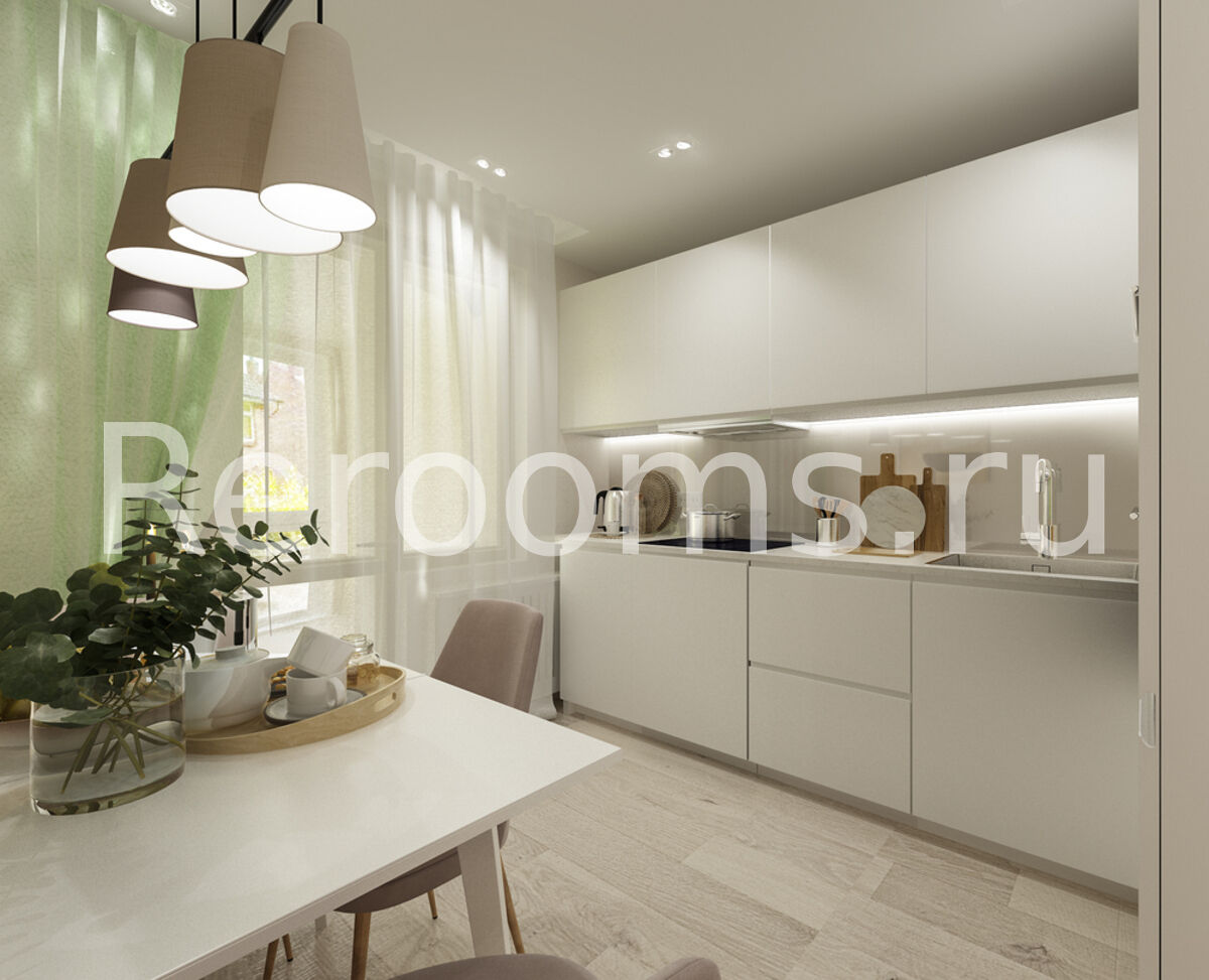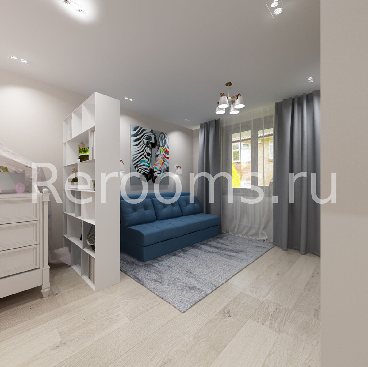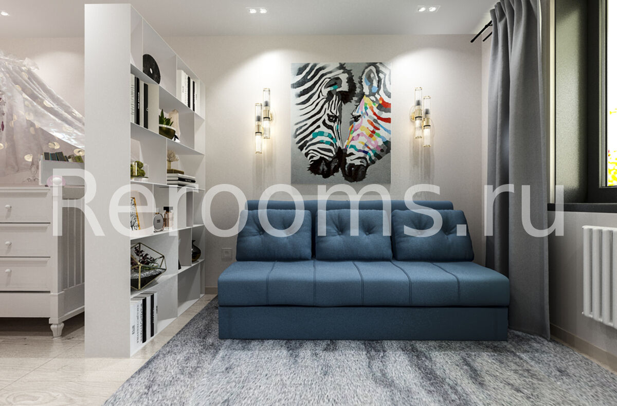 Дизайн-проект однокомнатной квартиры выполнен в стиле модернизм. Помещение комнаты зонировали с помощью открытого стеллажа, который пропускает достаточное количество света и служит функциональным декоративным элементом. В гостиной установили диван и оборудовали зону с телевизором. Ворую часть комнаты отвели под детскую, разместив там кроватку и вместительный шкаф. Кухонное помещение достаточно минималистично. В качестве основного цвета отделки квартиры остановились на базовом белом. Он помог визуально увеличить пространство и сделать его более нарядным.