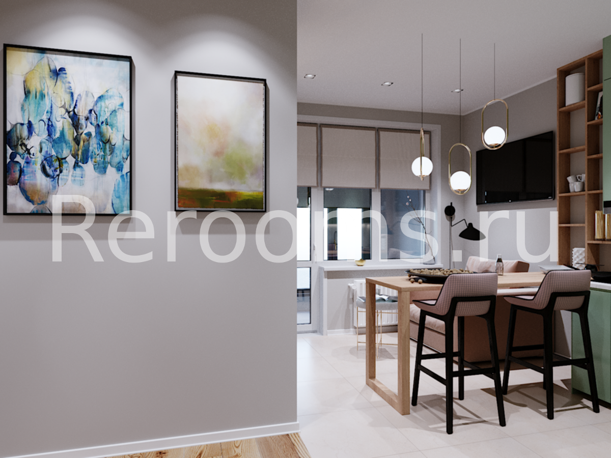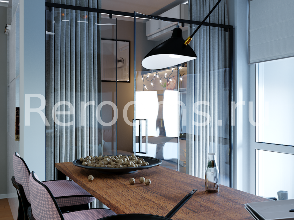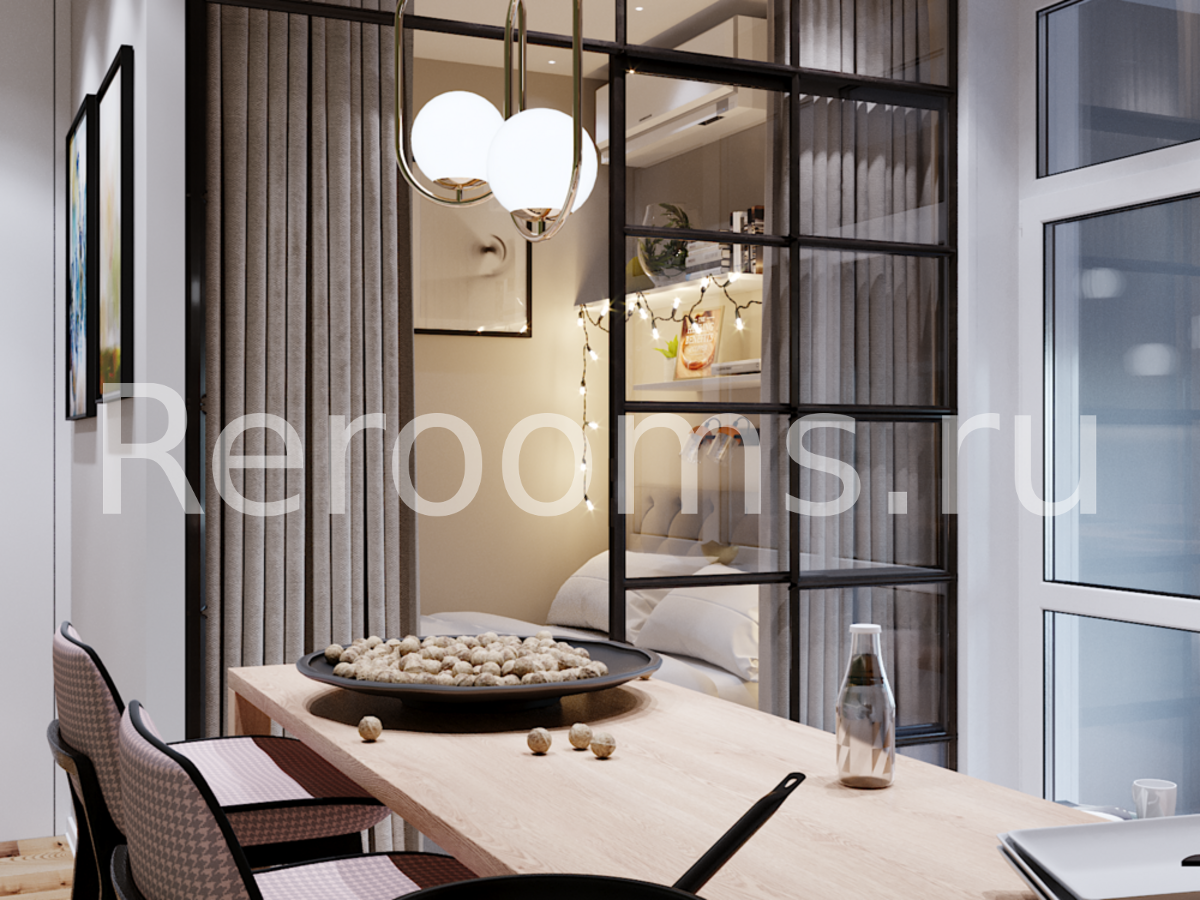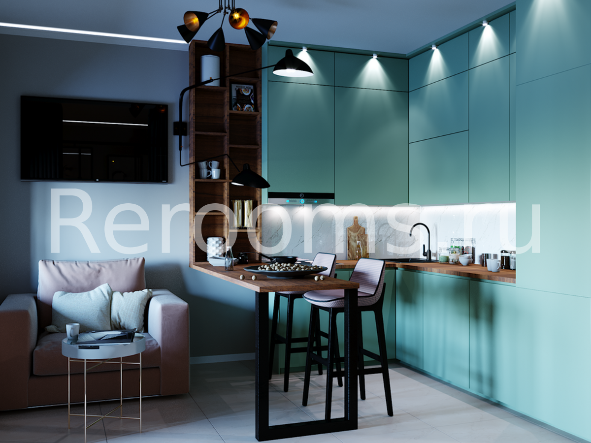 Интерьер этой квартиры-студии выполнен в стиле модернизм. Помещение кухни-гостиной очень функционально и красиво. Минималистичный мебельный гарнитур со встроенной техникой эргономичен и эстетически привлекателен. Разделить пространство, выделив зону для отдыха и место приготовления пищи помогло грамотное зонирование. Своеобразным разделительным элементом в интерьере служит барная стойка. Она не только несет свою функциональную нагрузку, но и является стильным элементом декора. Спальня отделена от общего помещения стеклянными перегородками. Благодаря этому она смотрится как логичное продолжение гостиной, хотя и имеет приватный характер.