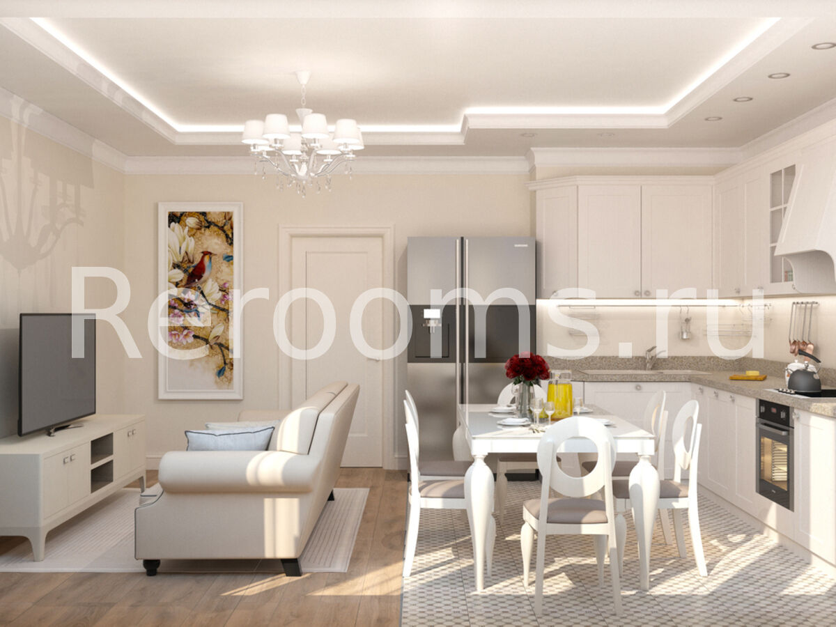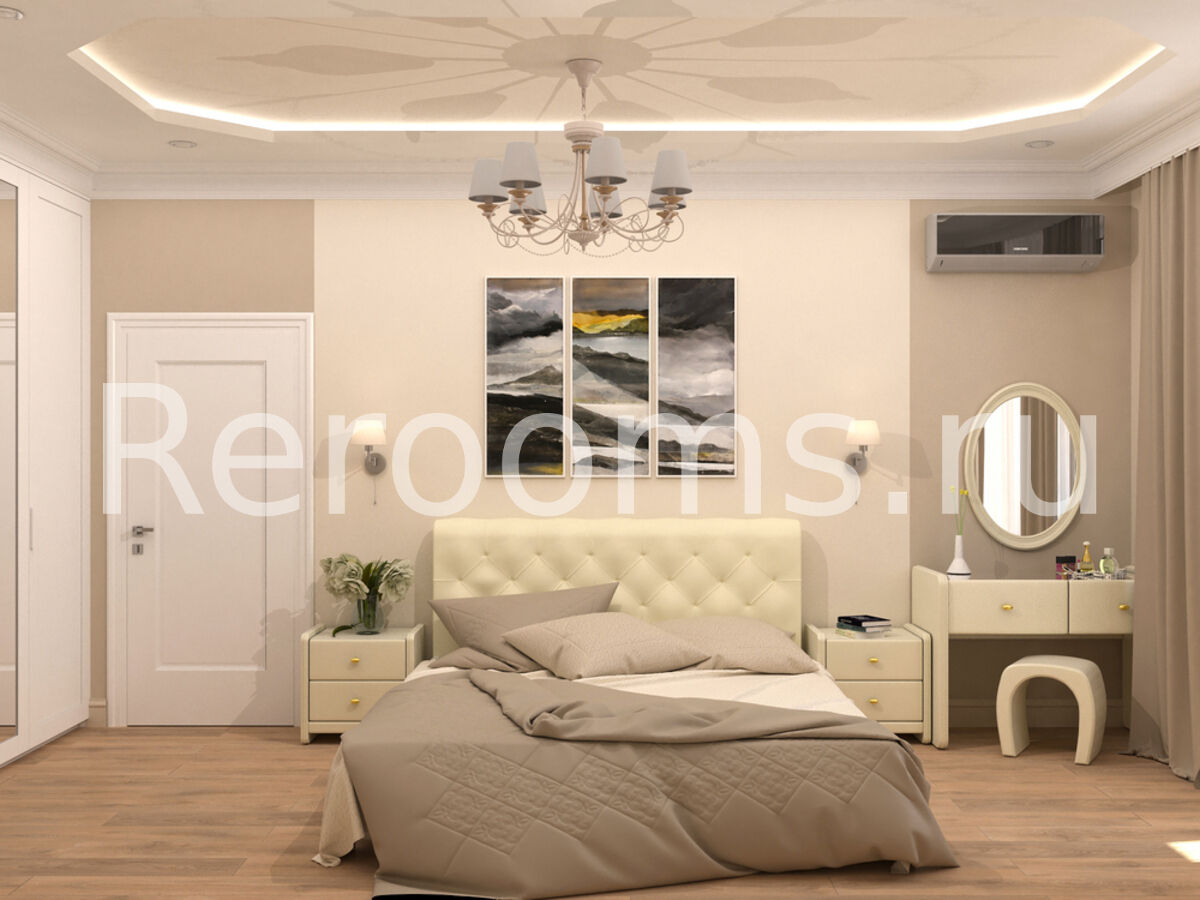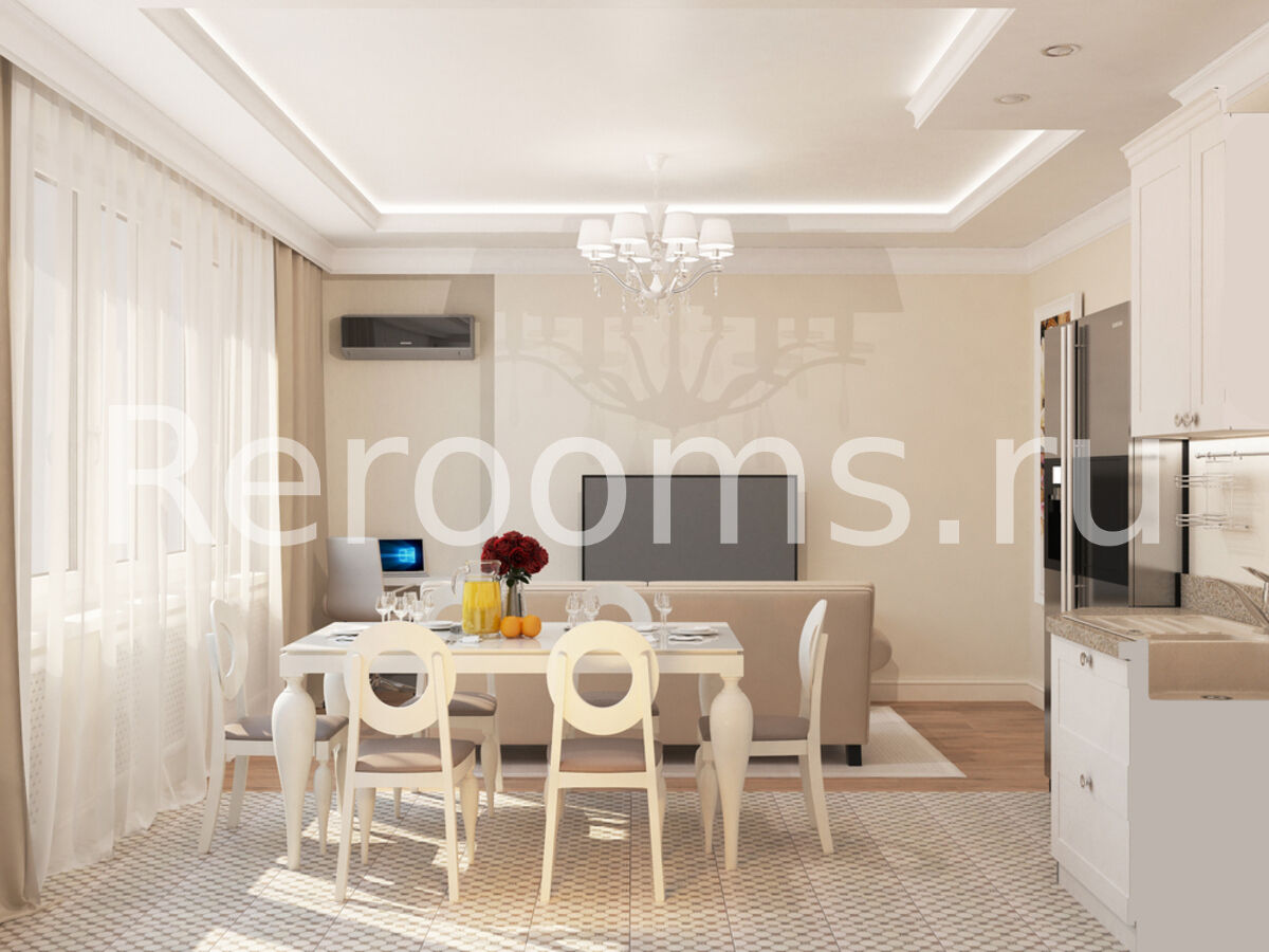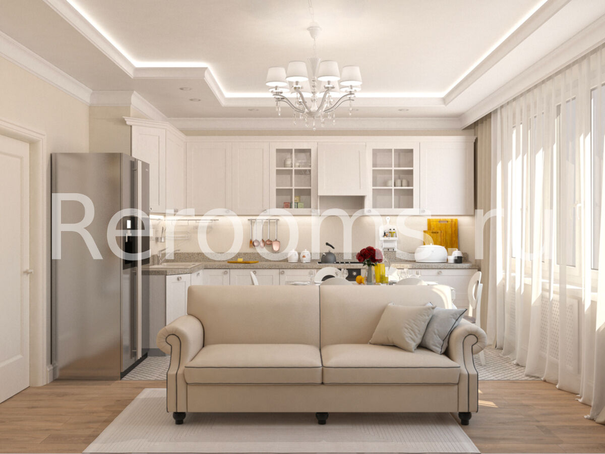 Пространство данной квартиры выполнено в светлых тонах. Здесь присутствуют различные оттенки бежевого и белого цветов. Для пола дизайнеры выбрали ламинат под дерево. Многоуровневые потолки привлекают внимание изящными формами и декоративной подсветкой. Стены выкрашены в теплые тона и вместе с текстилем образуют гармоничный ансамбль.