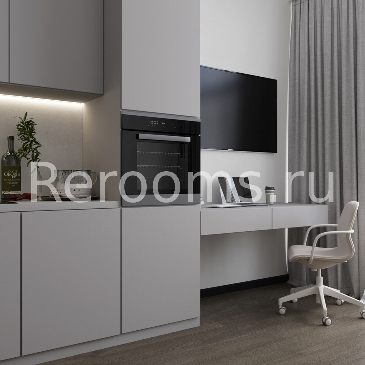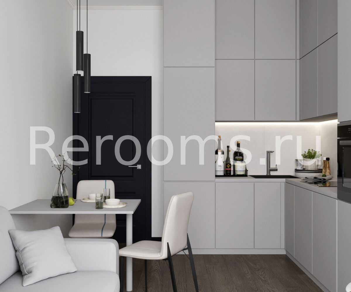 Дизайн этой однокомнатной квартиры выдержан в современном стиле. Интересная архитектура пространства, сдержанная цветовая гамма, комбинация различных материалов и оригинальный световой сценарий - все это работает на общую концепцию интерьера.
