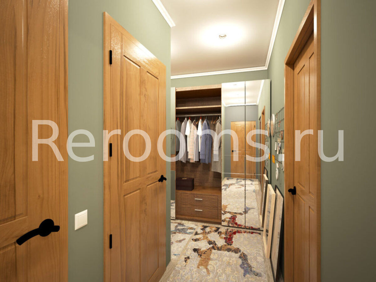 В прихожей расположен вместительный шкаф-купе с зеркальными дверцами, которые расширяют пространство.