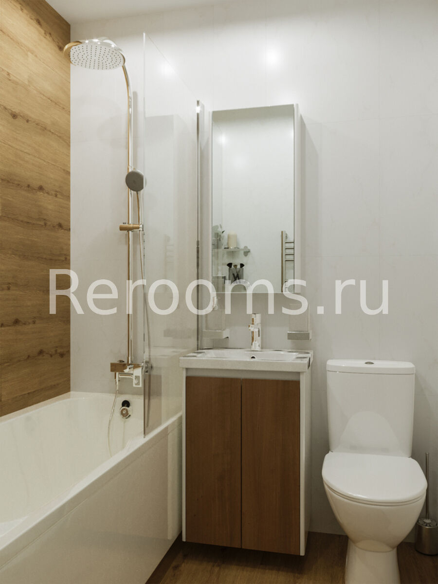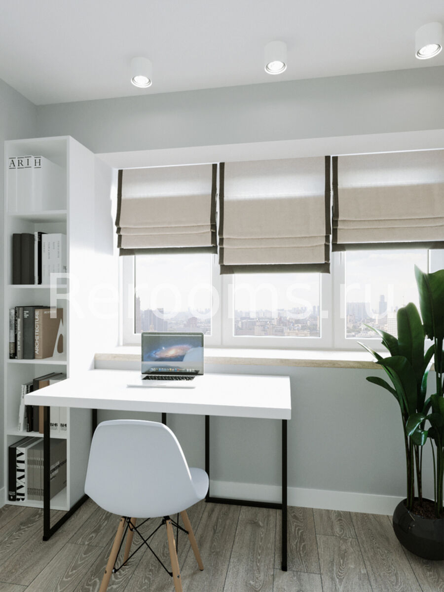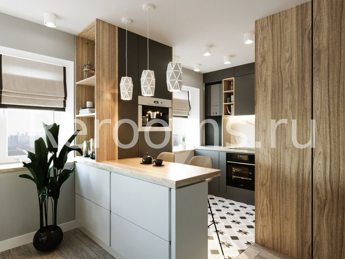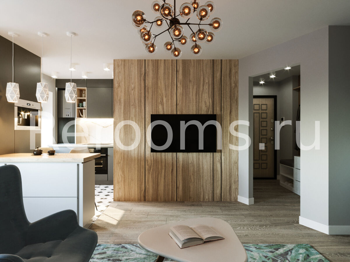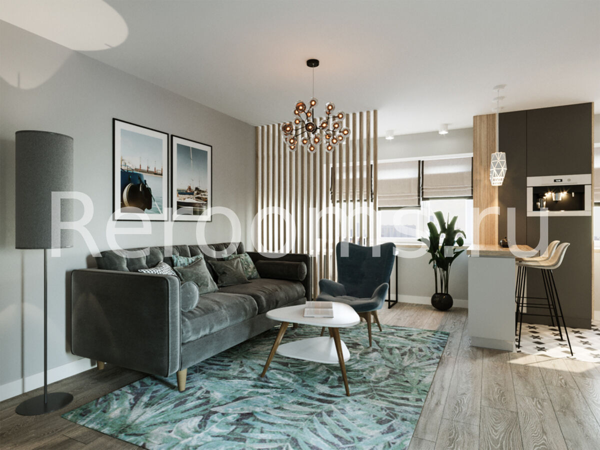 Дизайн-проект этой однокомнатной квартиры выполнен в стиле модернизм. Помещение комнаты зонировано с помощью деревянной рейчатой перегородки, которая пропускает достаточное количество света и служит функциональным декоративным элементом. С помощью такого дизайнерского приема удалось выделить приватную зону с рабочим местом. Кухонное пространство отделено от гостиной барной стойкой, которую установили вместо массивного стола.