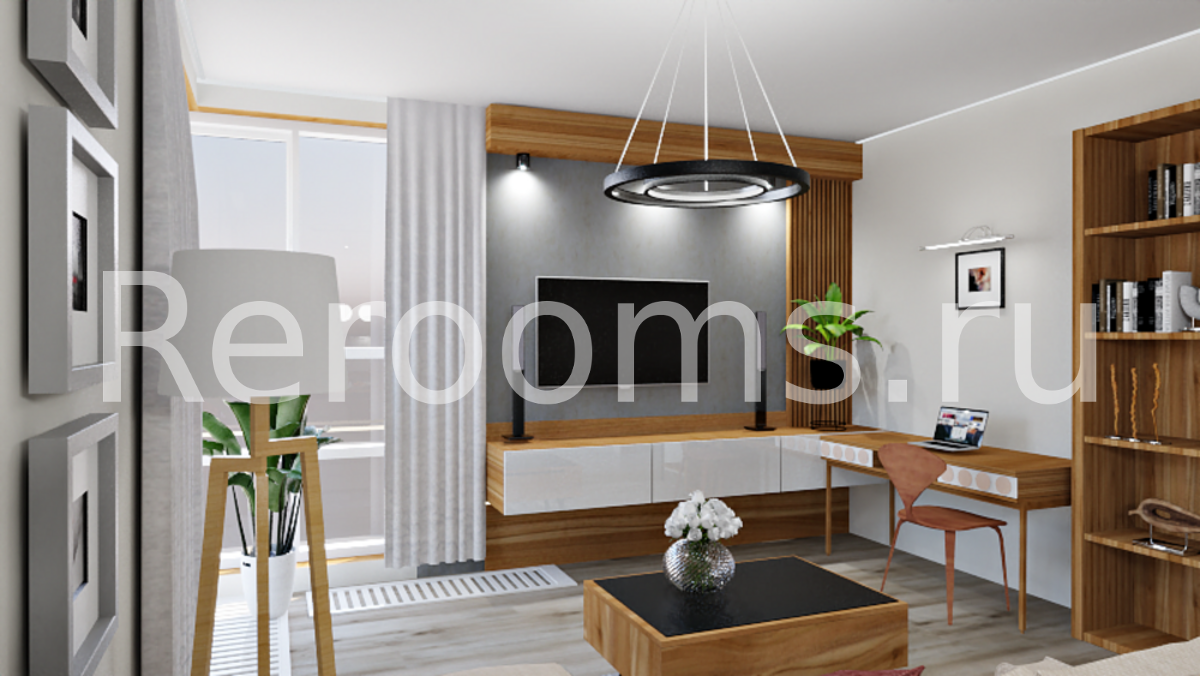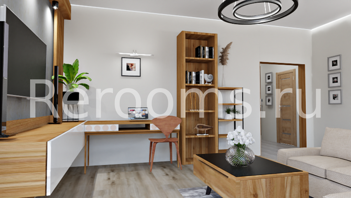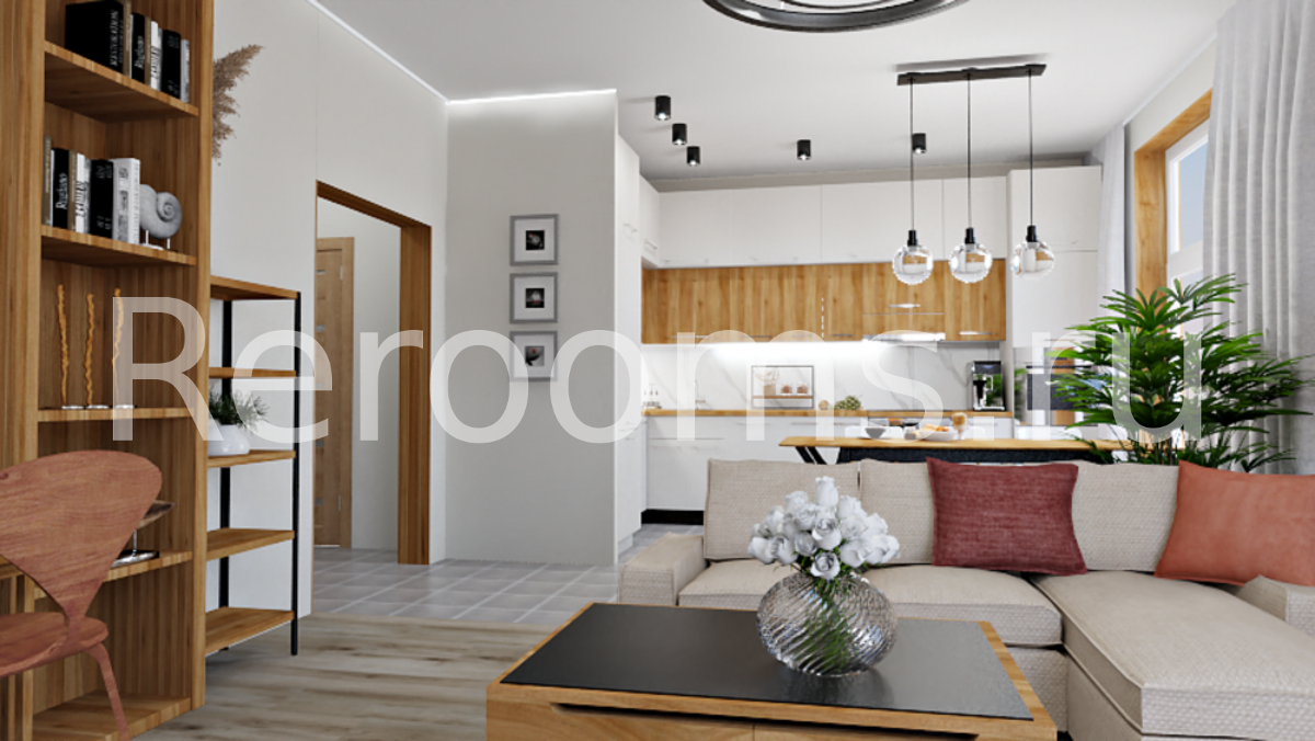 Дизайн двухкомнатной квартиры выдержан в современном стиле. Цветовая гамма с использованием серых, белых и древесных тонов делает интерьер ультрамодным и красивым. Интересная архитектура пространства, комбинация различных материалов и оригинальный световой сценарий - все это работает на поддержание концепции современного дизайна.