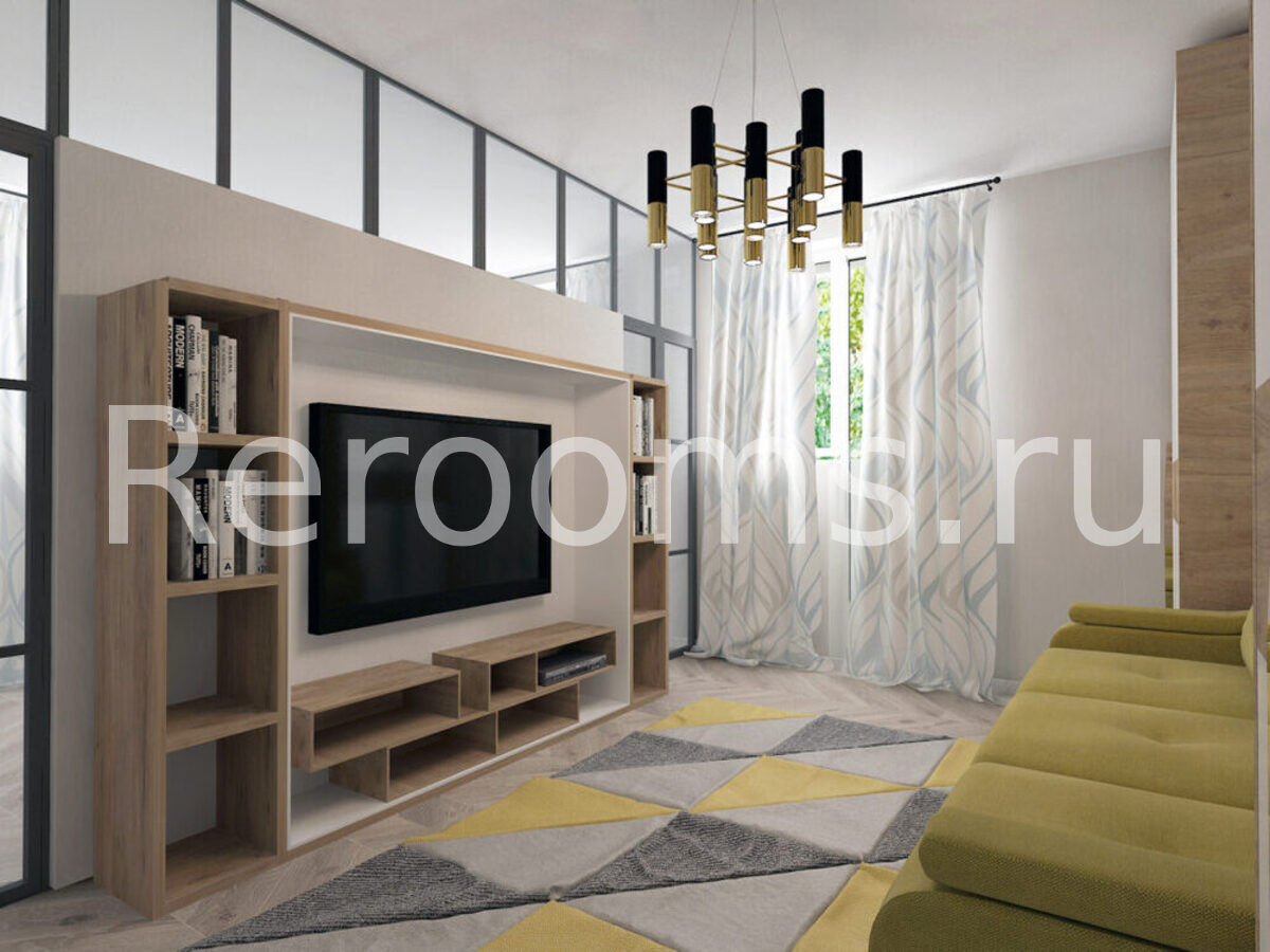 Квартира подойдет для семейной пары без детей. Изначально единственная жилая комната, поделена на 2 зоны. В зоне гостиной можно смотреть телевизор, и при необходимости оставить с ночевкой гостей, так как диван со спальным механизмом, а отдельная приватная зона спальни расположилась за стеклянной перегородкой, которая одновременно и отделяет помещение спальни, и пропускает много света за счет стекла, не загромождая пространство.