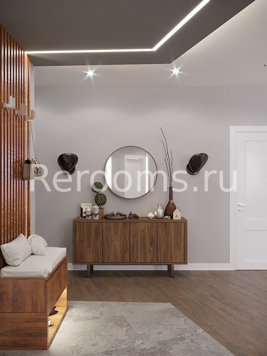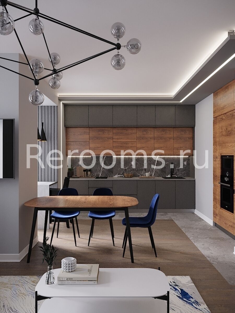 Дизайн этой квартиры выдержан в современном стиле. Цветовая гамма с использованием серых, голубых и коричневых тонов делает интерьер ультрамодным и красивым. Интересная архитектура пространства, комбинация различных материалов и оригинальный световой сценарий - все это работает на поддержание концепции современного дизайна.