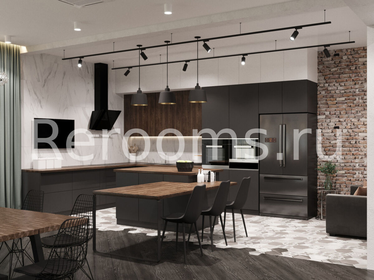 Интерьер этого двухэтажного частного дома выдержан в стиле лофт. Грубые поверхности под кирпич, бетон и камень, современные индустриальные светильники, трековые системы, а также металлические элементы декора придают помещению брутальный дух индустриального пространства. В интерьере преобладают характерные для лофтовой стилистики цвета, такие как серый, черный, графитовый, терракотовый. Для проекта дизайнеры подобрали минималистичный декор, удачно подчеркнувший выбранную концепцию жилого пространства.
