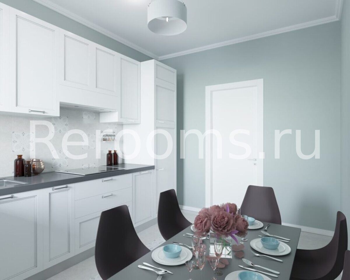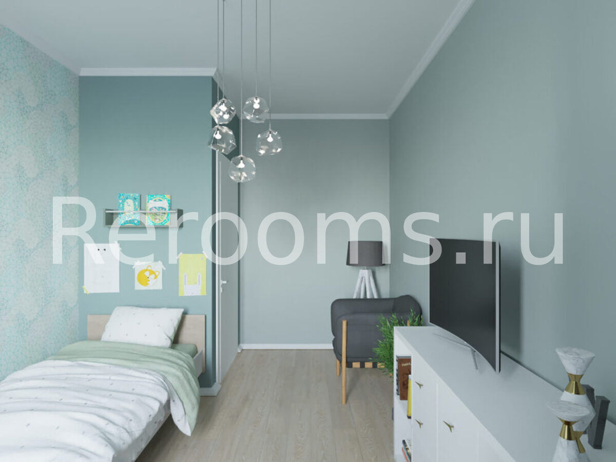 За основу в данной квартире взят стиль Модернизм с элементами классики. Эклектичность проявляется в отдельных элементах интерьера, таких как двери, фасад кухни, строгий шкаф. Сочетание мягких оттенков сложного серого, оливкового со сложной бирюзой придают квартире одновременно строгость и уют. Квартира адаптирована под немалое количество жителей, просторные комнаты и мягкий интерьер создают гармонию. Детали дополняют пространство и влияют на положительное впечатление от дизайна интерьера этой квартиры.
