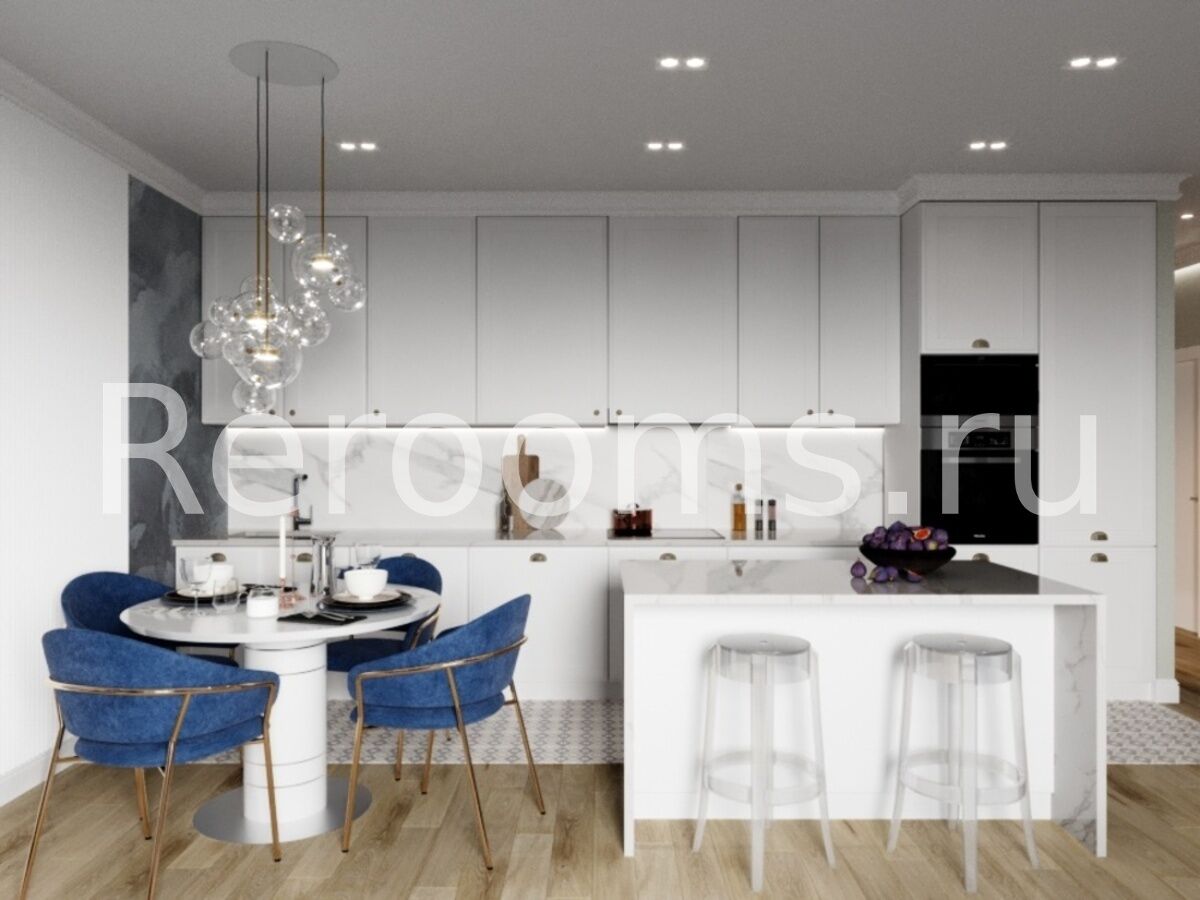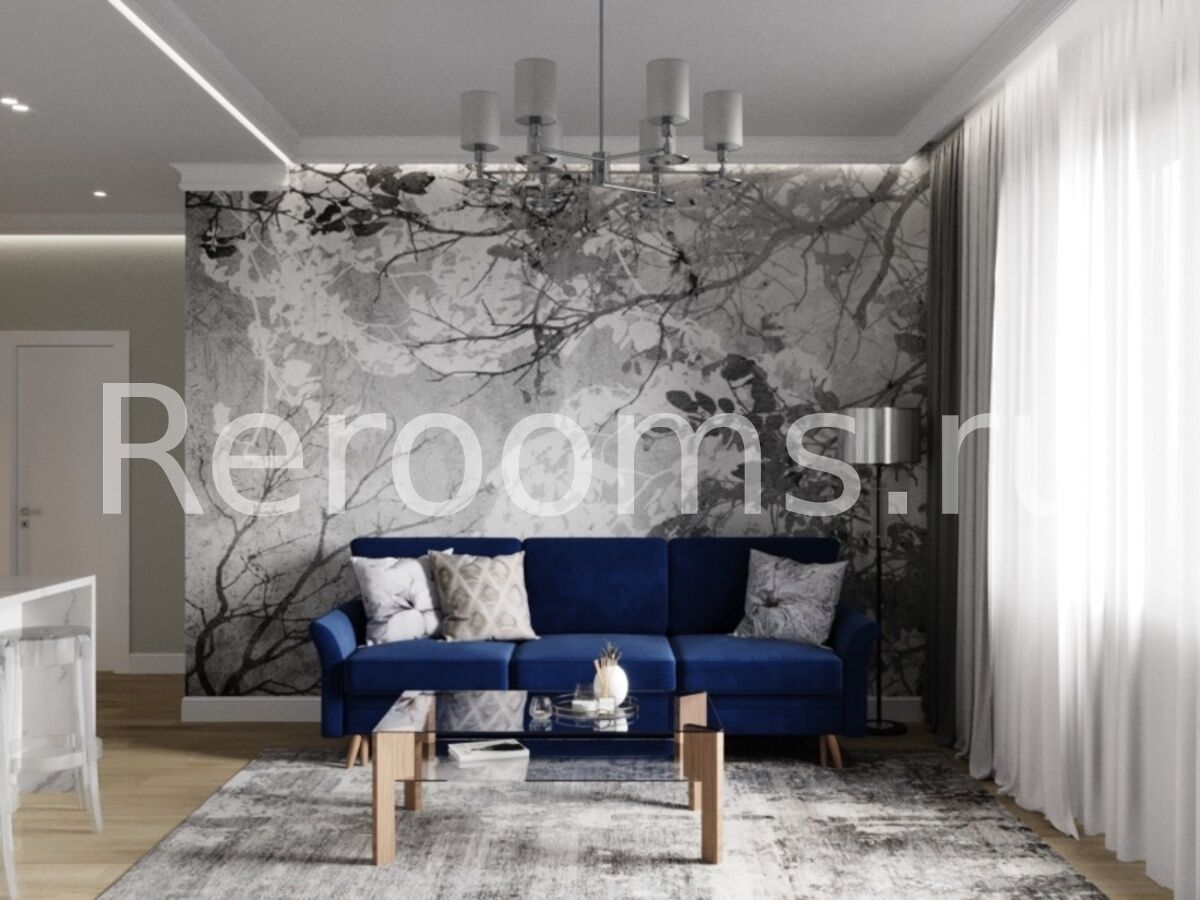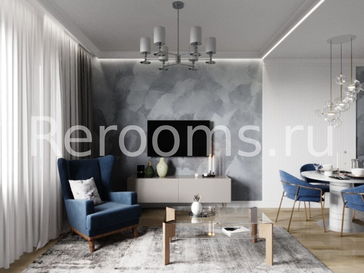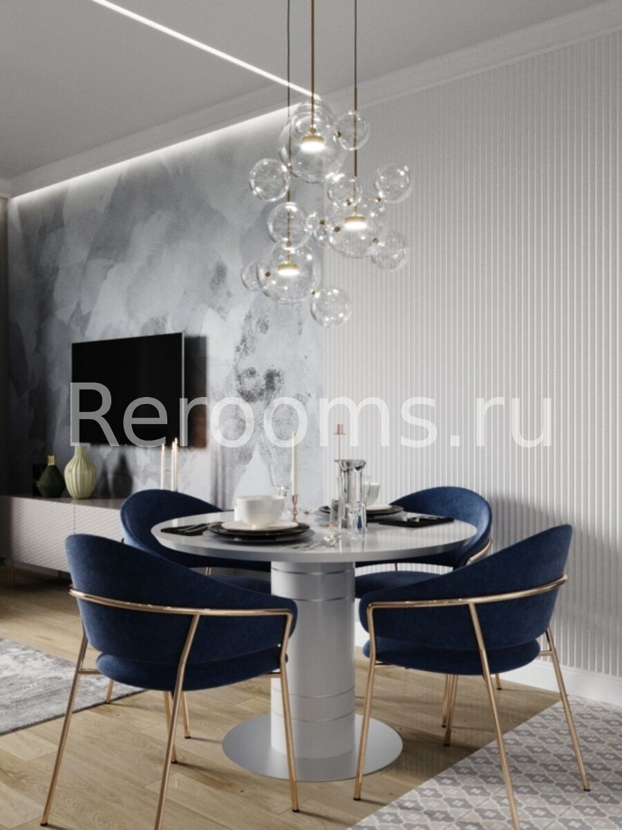 Дизайн-проект кухни-гостиной выполнен в современном стиле модернизм. Красивая гамма с преобладанием серого и синего цветов делает интерьер изысканным и утонченным. Пространство поделили на две функциональные зоны - кухонную и гостиную. Чтобы визуально закрепить такое деление, дизайнер использовала настенные 3D панели. Они четко разделили комнату и стали подходящим декоративным элементом. Особое место в проекте уделено освещению. Так как помещение достаточно большое, для каждой зоны предусмотрели свой светильник.