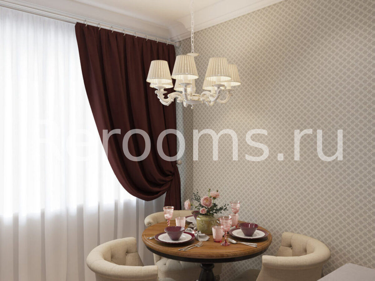 Проект выполнен в стиле современной классики. В целом спокойная цветовая гамма с яркими элементами и большим количеством орнамента. Яркая вишневая кухня притягивает взгляд, но при этом обои и фартук с геометрическим орнаментом успокаивают этот «взрыв» цвета.