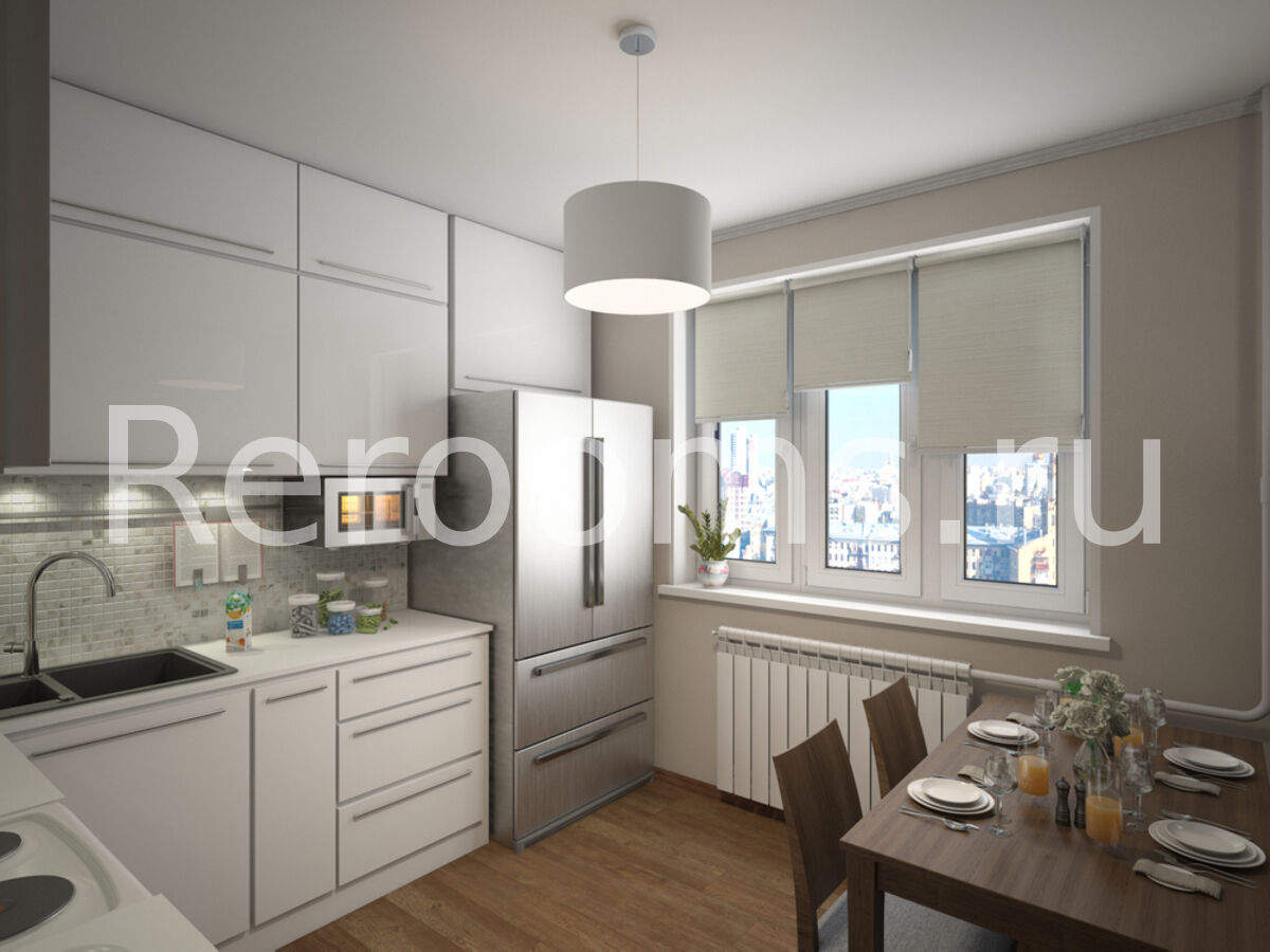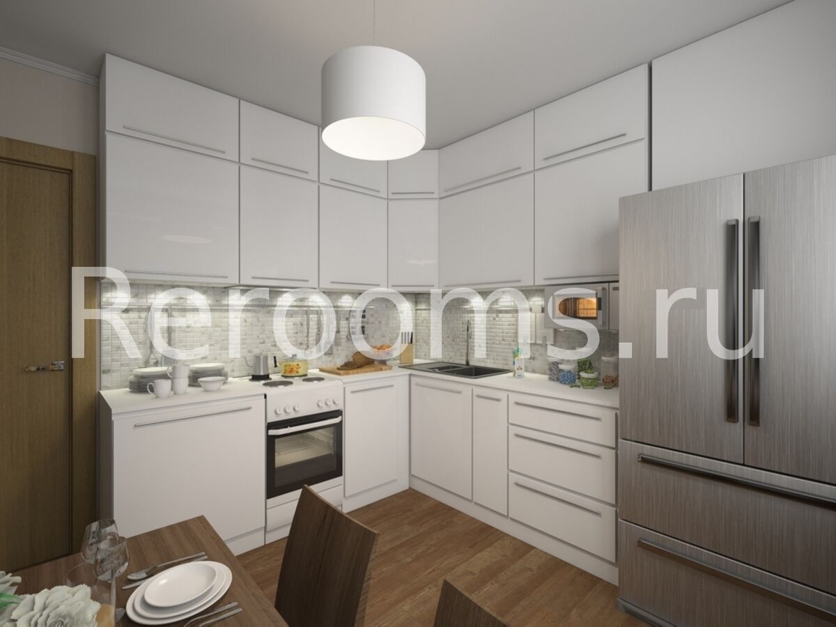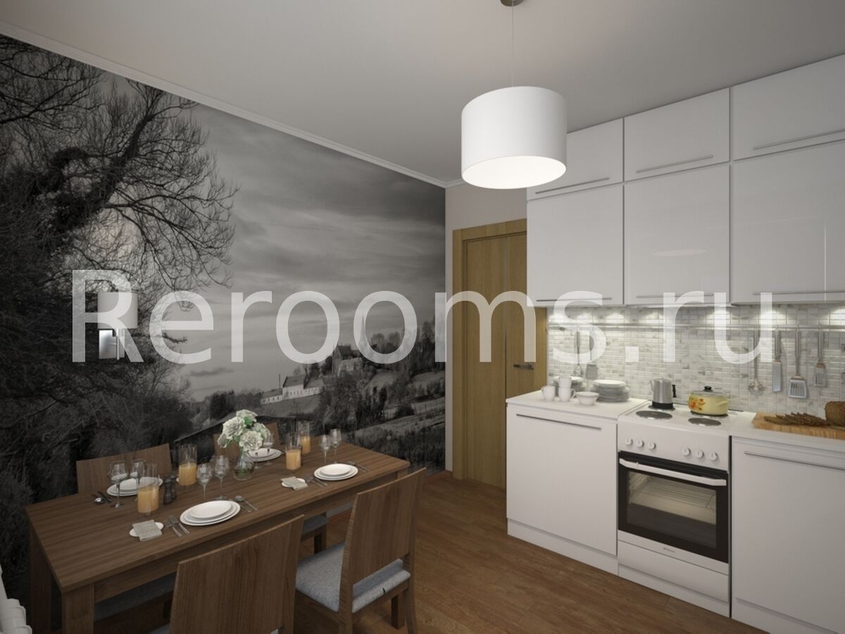 Дизайн-проект этой кухни выполнен в модном стиле контемпорари. Интерьер отличается изысканной простотой и функциональностью. Благодаря белым глянцевым фасадам мебельный гарнитур выглядит очень легко и лаконично. Акцентным элементом кухни является стена с черно-белым изображением немецкой деревушки. Она придает пространству дополнительную глубину и визуальный объем. Грамотное расположение мебели позволило оставить в помещении максимум свободного места.
